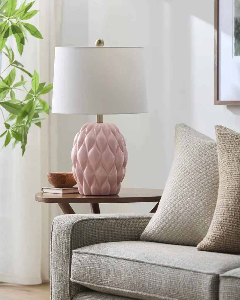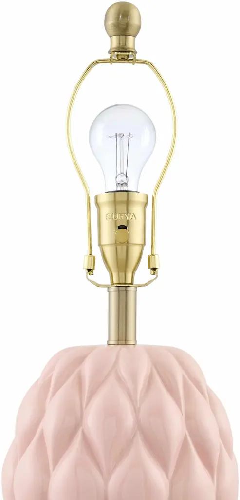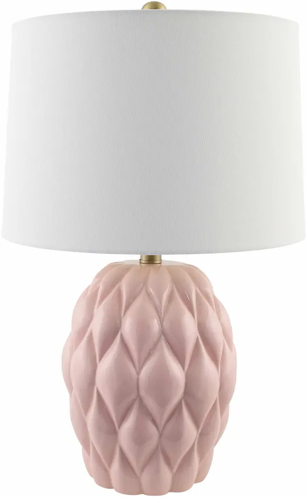 Collection: Marmelade Colors: Pink, White, Metallic - Brass, Translucent Material: Body: Ceramic / Shade (Outside): Linen / Finial: Iron Styles: Transitional,Traditional Made In: China Lighting Type: Accent Table Lighting Shade Material: Linen Shade Color: White, White Cord Length: 6' Switch Type: On/Off Number of Bulbs: 1 Socket Type: E-26 Bulb Wattage: 100W