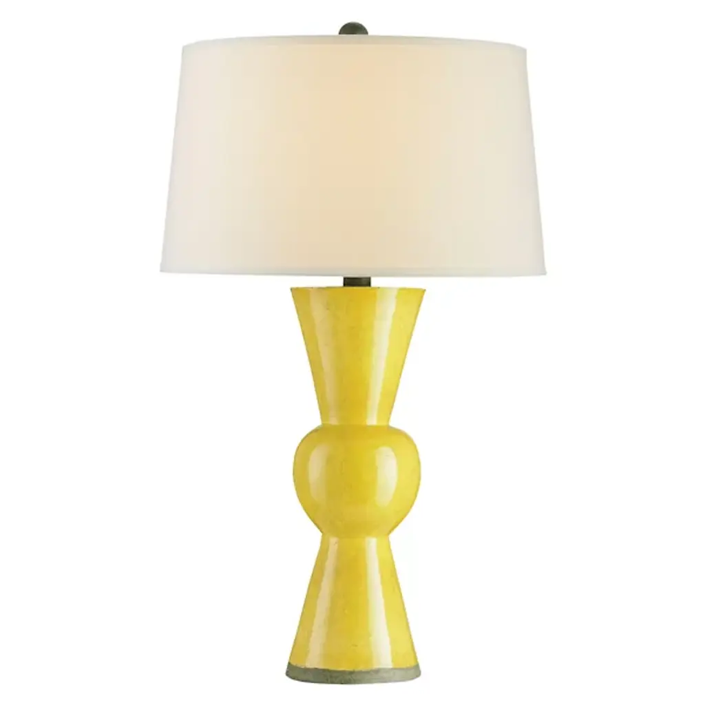 Collection: Marmelade Colors: Red, White, Metallic - Brass, Translucent Material: Body: Ceramic / Shade (Outside): Linen / Finial: Iron Styles: Transitional,Traditional Made In: China Lighting Type: Accent Table Lighting Shade Material: Linen Shade Color: White, White Cord Length: 6' Switch Type: On/Off Number of Bulbs: 1 Socket Type: E-26 Bulb Wattage: 100W