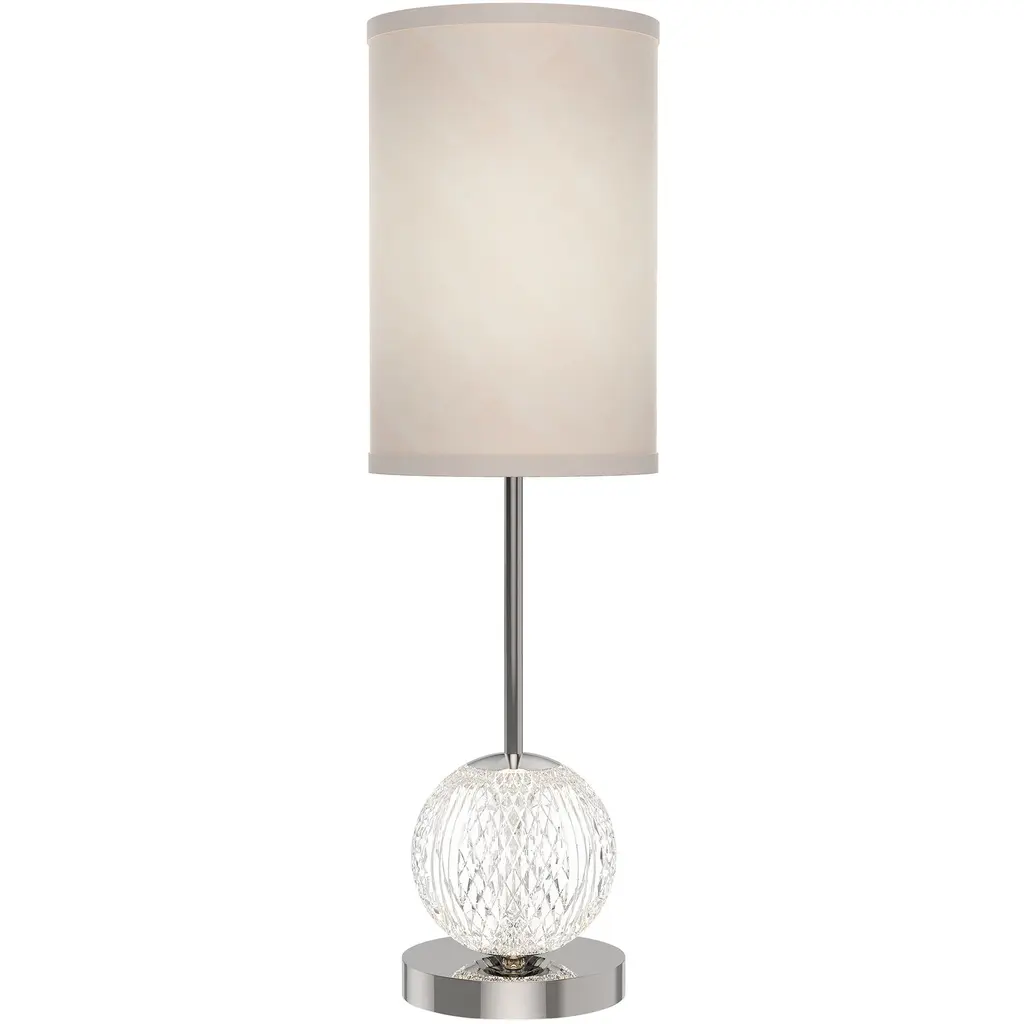 Like a gorgeously beaded garment, the Marni collection add luxury and interest to any design. Meticulously cut spherical shades create glittering beams of illumination throughout the design. Available in Polished Nickel and Natural Brass accompaniments. Lamp illuminates both from within the shade and the cut crystal base.