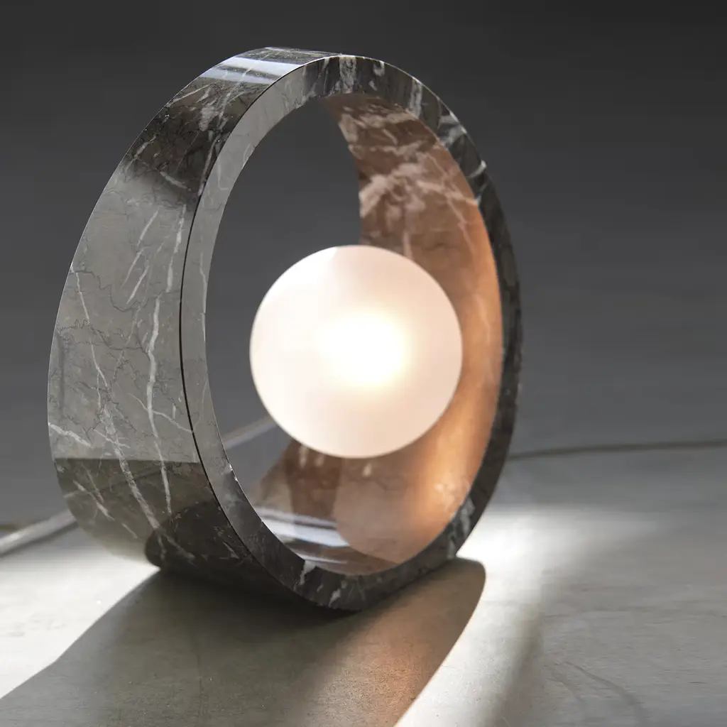 Combining modern aesthetics with clever functionality, this table lamp outlines empty space with a fluid, circular frame, filling it with radiant light. The G9 LED bulb is housed inside a white glass sphere seemingly suspended in the black Marquinia marble ring. This sleek design provides a sculptural focal point in a wide range of modern and contemporary interiors.
