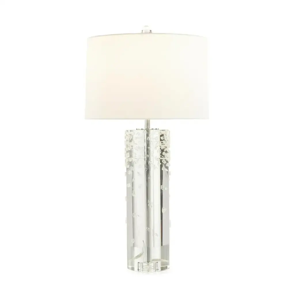 This table lamp, sitting upon a crystal base, is veiled in sparkling strings of solid-cut marquise crystals.