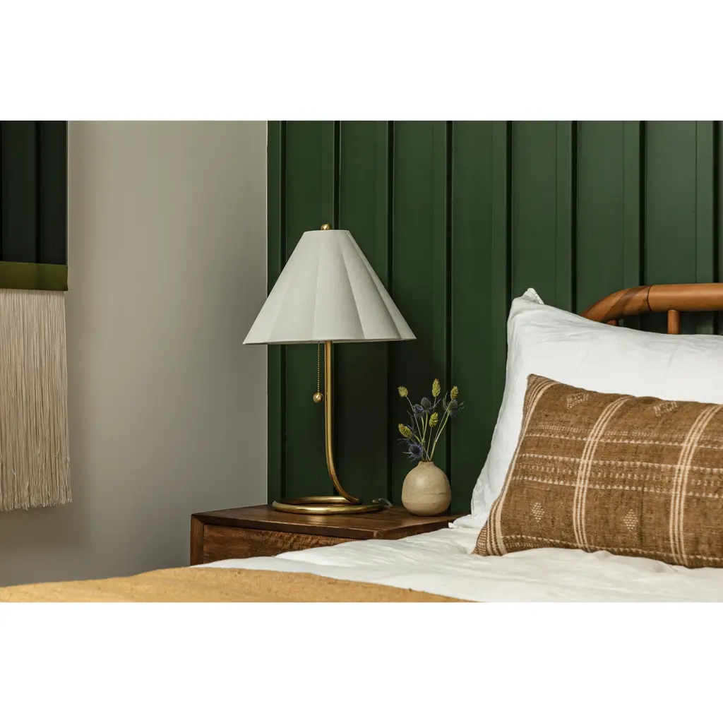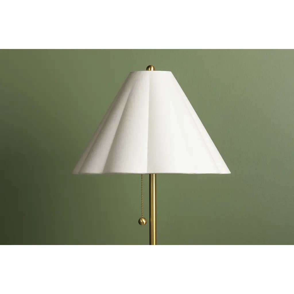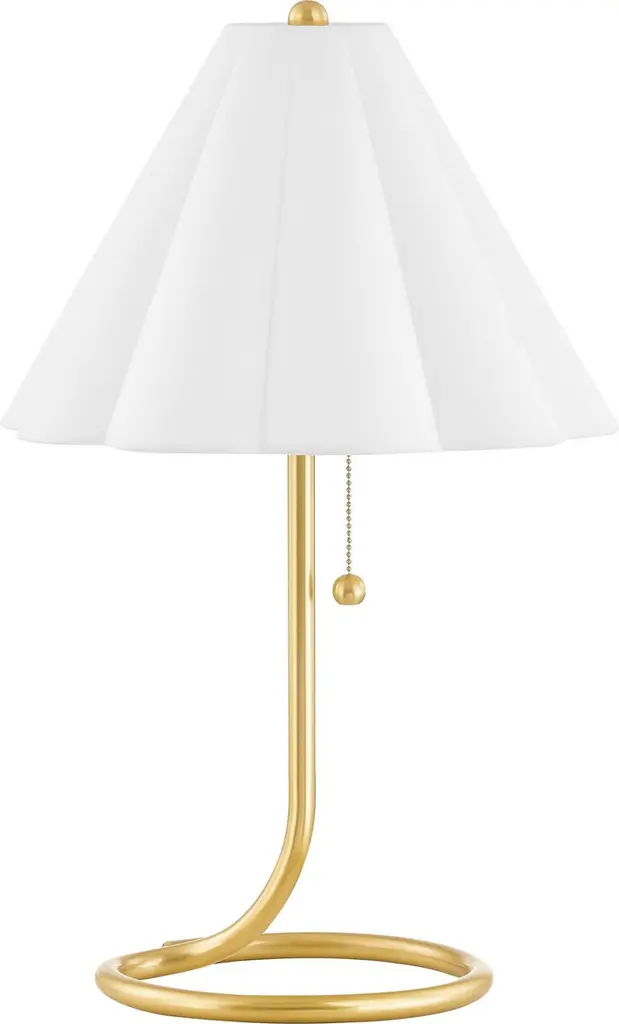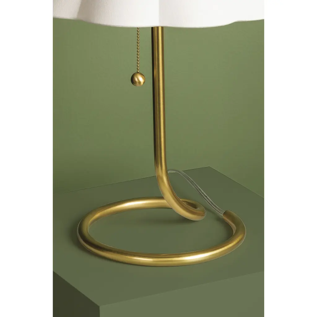 Martha brings style to the table. A thin, smooth rod of aged brass twists and loops to form an airy, abstract base that evokes motion. With its pretty white linen scalloped shade, finial ball and pull chain, this eye-catching table lamp makes a big statement without taking up a lot of space.