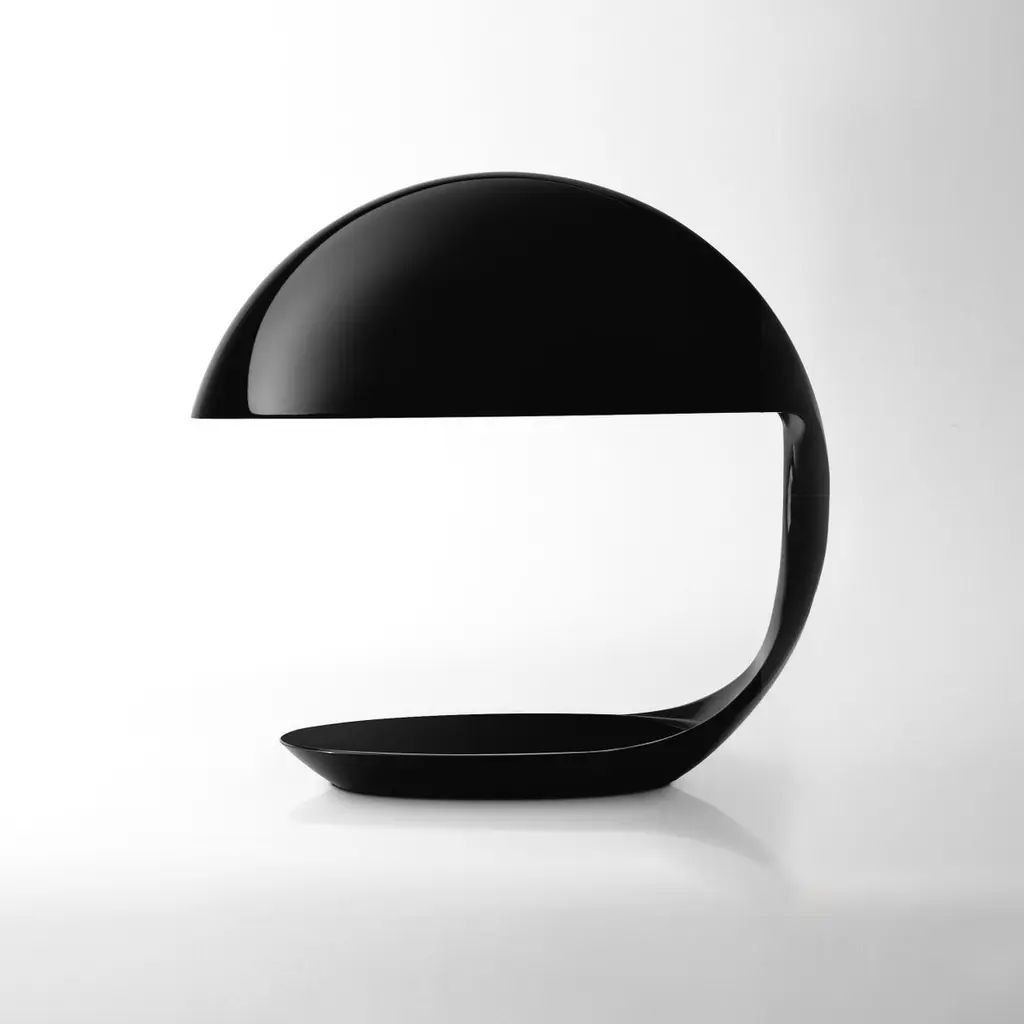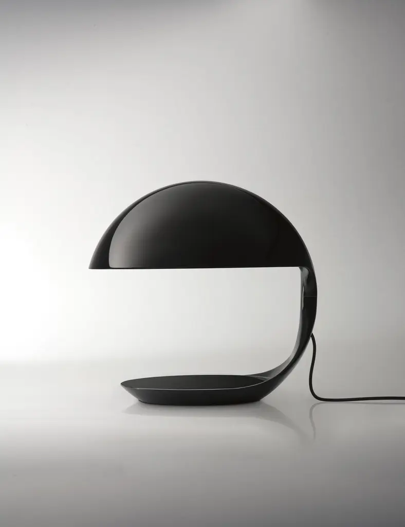 Reading lamp with direct light, made with two resin molded bodies, white or black color. For the 50th anniversary of its production, a new red version of the Cobra lamp is proposed with the designer’s signature. The lower body part turns on a steel made base connected with the upper body part by means of a central joint for a 360° rotation. The interior reflector is made with white painted aluminum.Designed by Elio Martinelli in 1968, Cobra is one of the first lighting fixtures produced with a special resin molding system. The lamp is characterized by simple lines and a geometric shape inscribed in a sphere, but, with the rotation of the arm, the reflector takes a position that recalls the head of a cobra ready to shoot.Technical specification:Material:Structure: ResinDiffuser: ResinBulbs:LED: 1x12W E27 Class: A+Device specifications:Type of Emission: DirectPower: 16 WFlow lamp: 622 LmDevice efficiency: 38.9 Lm/wPower supply cable length: 40 + 200 CmGlow wire test: 0°Voltage: 230 V.