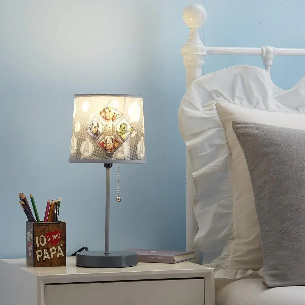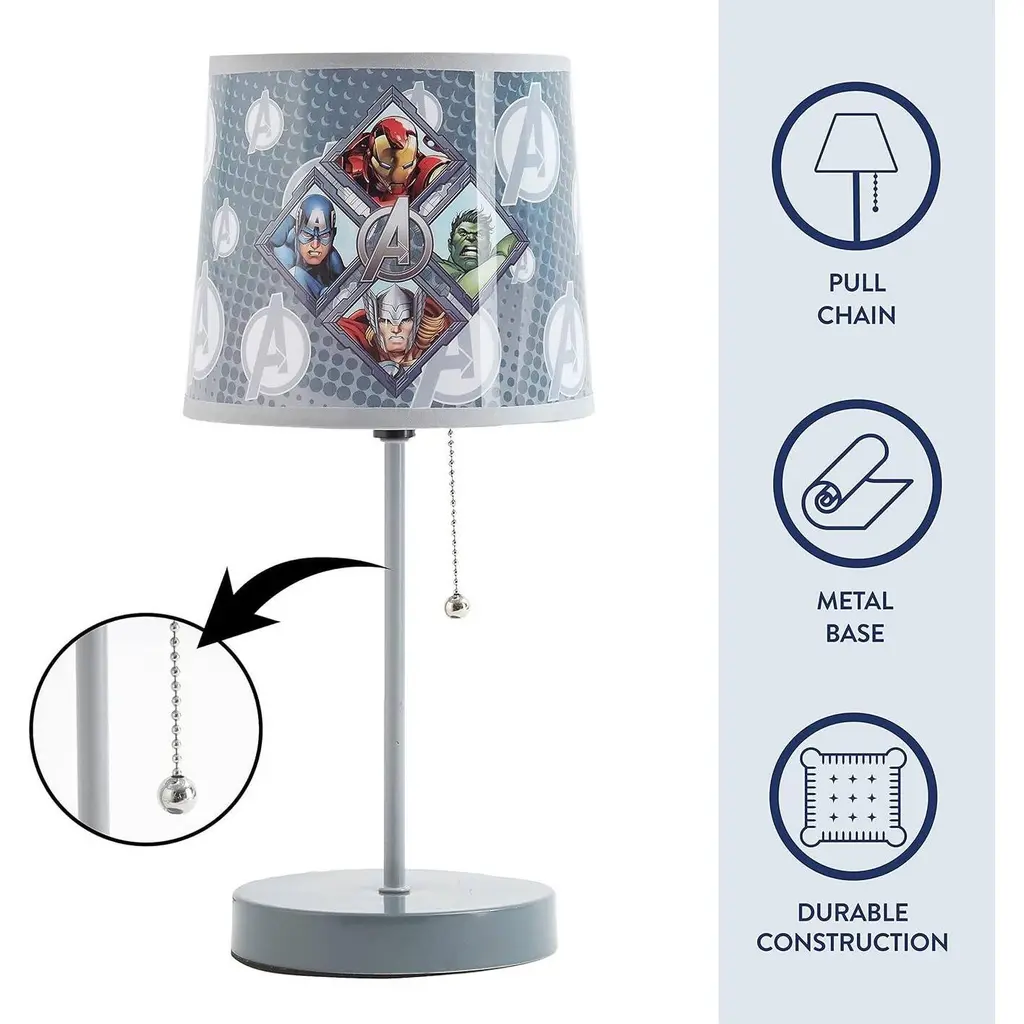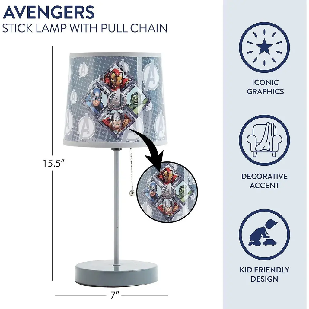 Light up a room with this decorative kids stick lamp designed with Avengers printed graphics. A fun theme to add to a kids' bedroom, play space or study area with this Avengers Stick Table lamp. The design on this stick lamp will add a pop of color along with your child's favorite characters. Compact and relatively lightweight, it provides the illumination you need where your kids sleep or play. This colorful themed character lamp features a metal base and a themed printed shade. Table lamp has printed plastic shade that is durable and made from quality, long lasting material. The neutral tone will match and coordinate with any décor you choose. This table stick lamp is simply designed with a pull chain. This lamp uses an electric plug in for operation. Gently pull the chain on and off, an easy added feature. The pull chain makes this stick lamp super kid friendly and a functional lamp that can be added to any room. This stick table lamp measures 15.5"H and 7"W, making it perfect for bed side tables, dressers, or desks. An ideal practical size. You won't regret purchasing this decorative, functional lamp for your child or someone dear to you today! Wipe clean for best care. No Assembly required. 40 watt bulb is required for lighting use, not included.