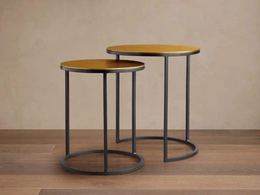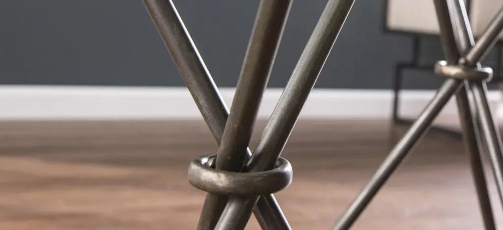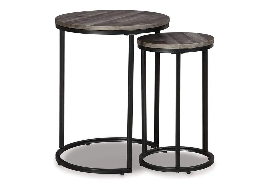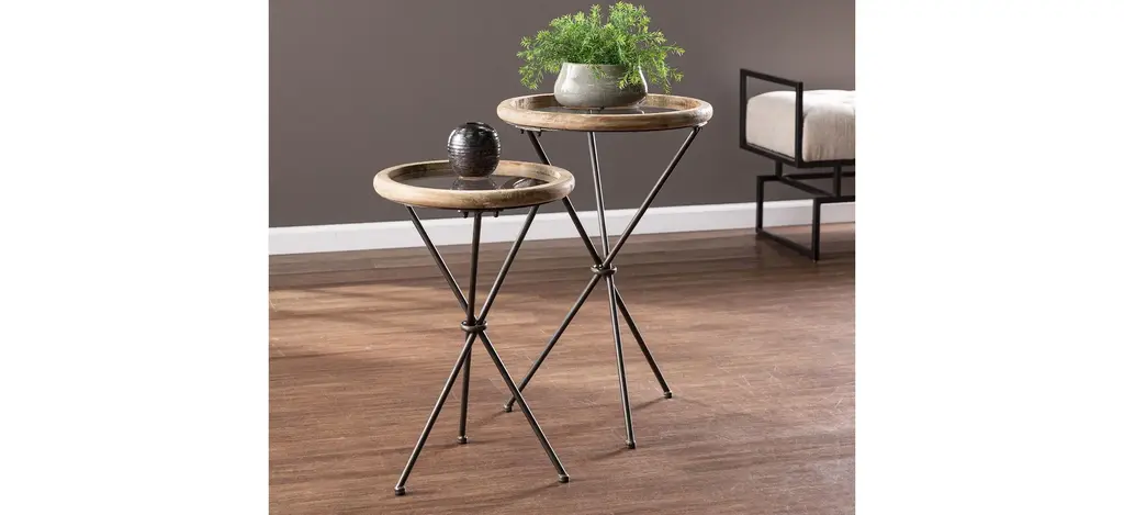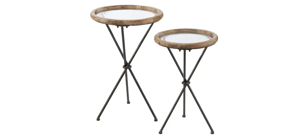 Mary 2-pc. Round Accent Table Set add rustic charm to your living space with this round accent table set. Glass tabletops elegantly display farmhouse d_cor or hold a reading lamp and your favorite book, while unique tripod legs bring a sleek, industrial feel to your home. Perfect for any small space, these modern side tables work beautifully as plant stands in your entryway or as a convenient place to set your drink in your family den. Bring sophisticated style to your farmhouse design with this two-piece table set.