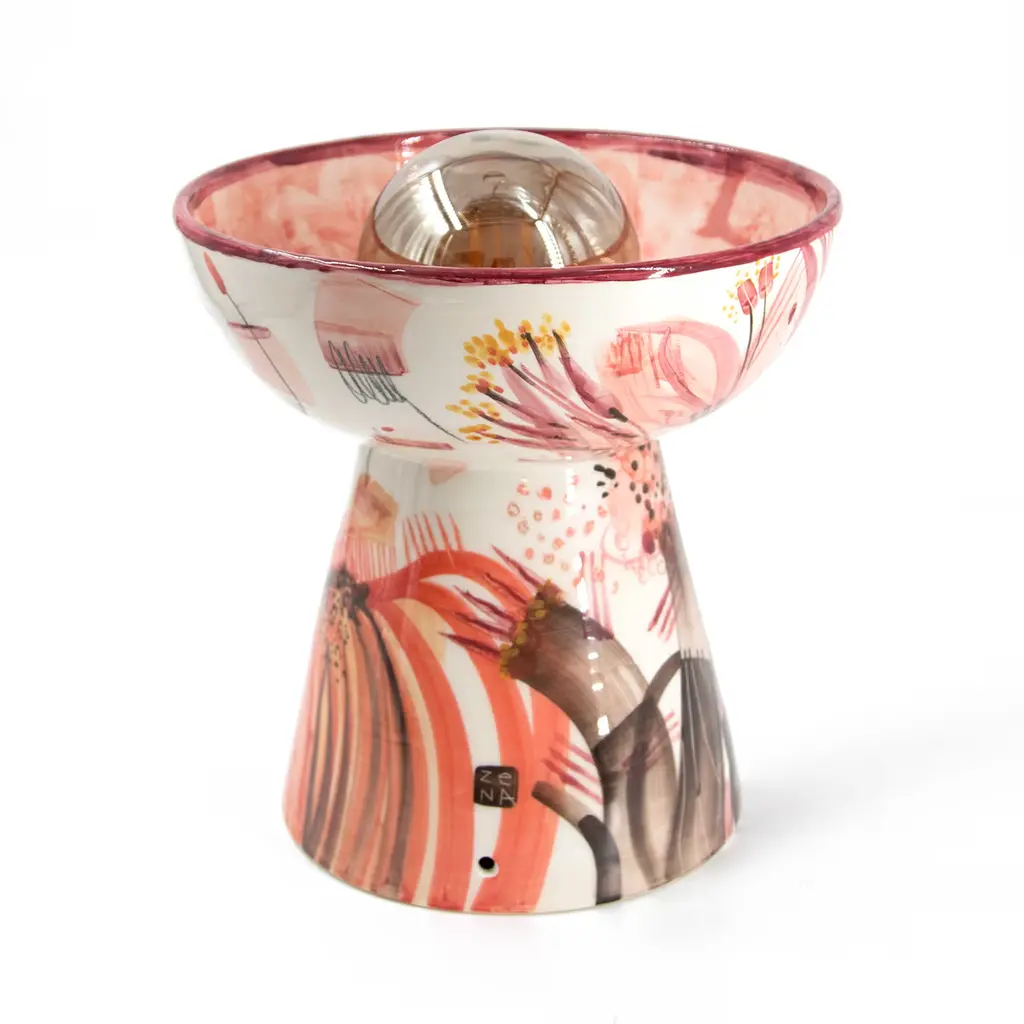 Fluid brushstrokes outlining stylized pistils, petals, and more lively decorative accents mark this handpainted ceramic table lamp as an authentic and sophisticated artwork. Crafted having rose gardens in mind, the delicate femininity of its decoration counterbalances the boldness of its geometric volumes. Each piece is entirely handmade and thus one-of-a-kind. Please contact the Concierge for bulb specs.