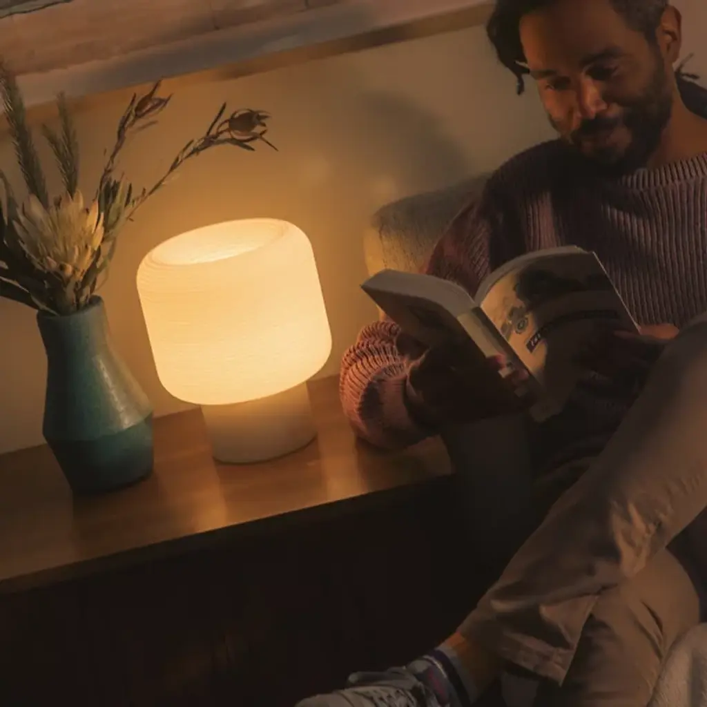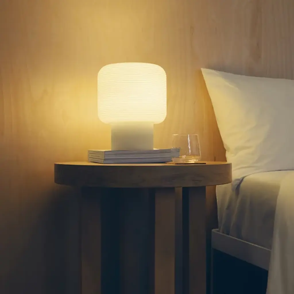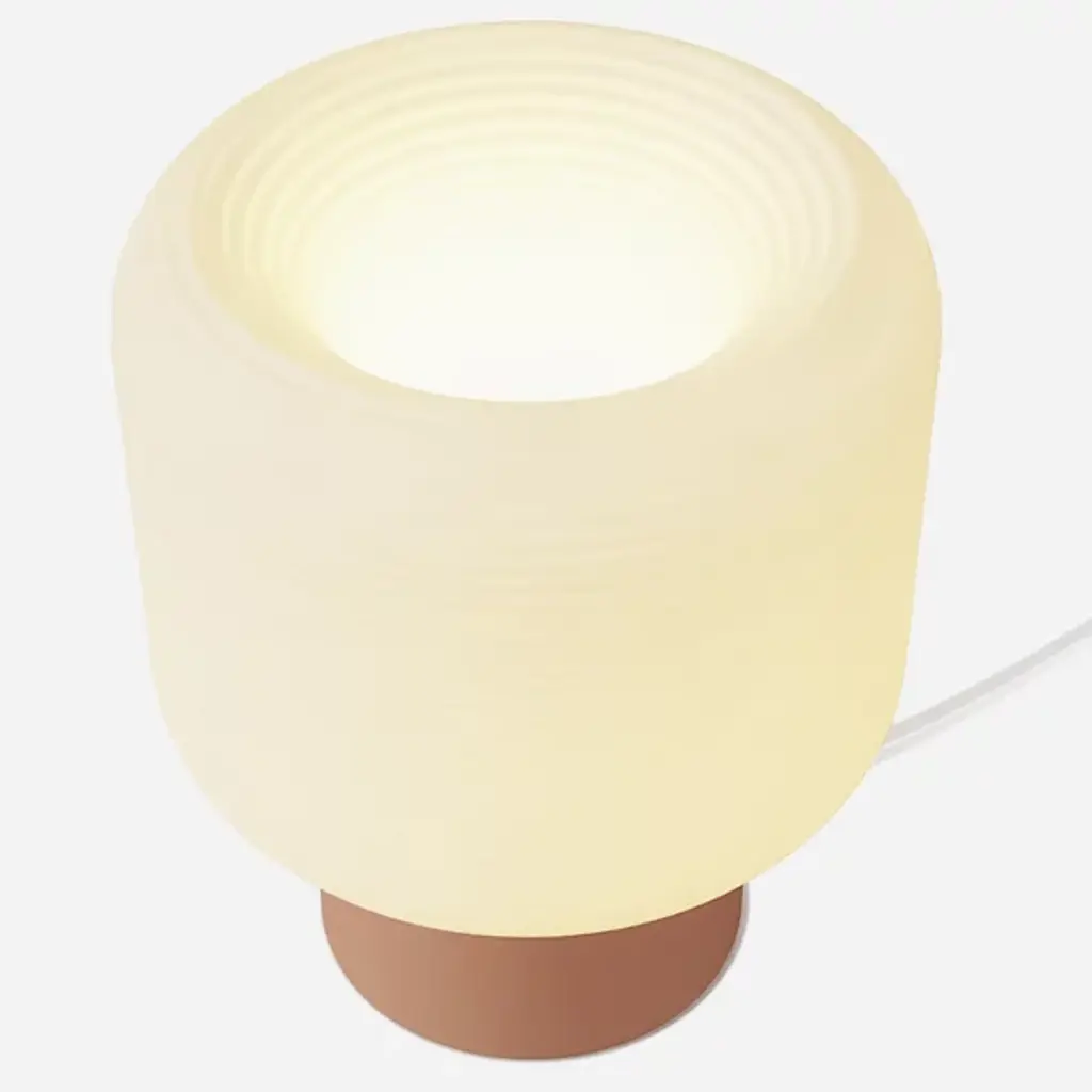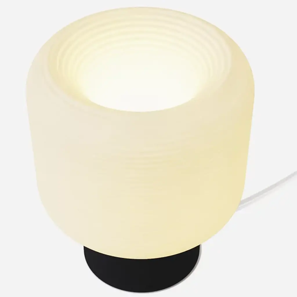 The Maskor Table Lamp from Gantri presents a tasteful modern creation created by the Murka Design Lab, a prolific industrial design studio from Basque Spain; its designers keep their focus on the Slow Design movement, focusing on locally sourced, sustainable art that helps people stay centered. Named for the Basque word for 'seashell,' its simple opaque polymer elevates a ribbed diffuser that layers concentric rings around a powerful inner light. The diffuser is made from Gantri Plant Polymers from non-GMO sugarcane grown on Thai farms, casting a welcoming glow in all directions.