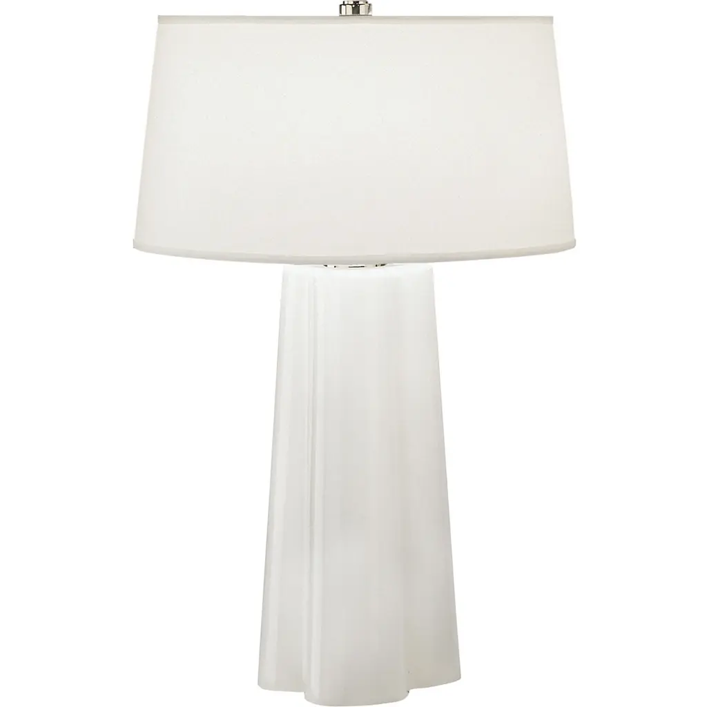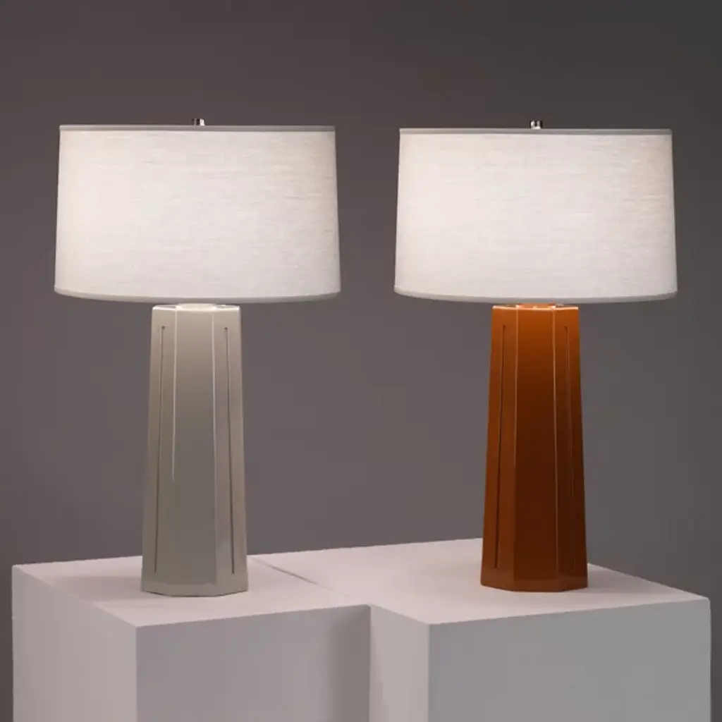 A perfect choice when just a splash of color is needed to liven up the look of a room. The Mason Table Lamp by Robert Abbey features an elegant, simple Oyster Linen drum shade and a glossy Glazed Ceramic base available in a wide assortment of vibrant colors. The piece’s aesthetic is completed with polished nickel accents, and a three way switch provides owners with optimal flexibility to adjust the lamp’s brightness to their preference.