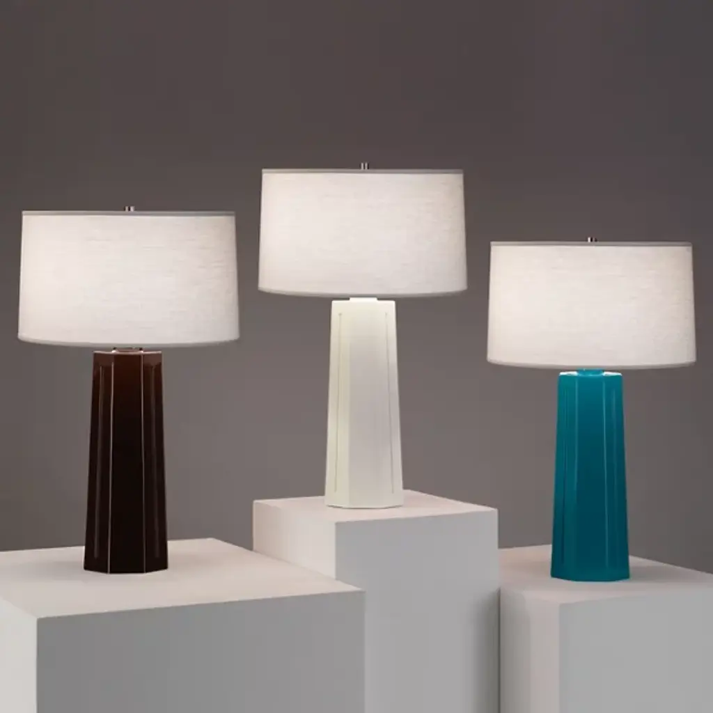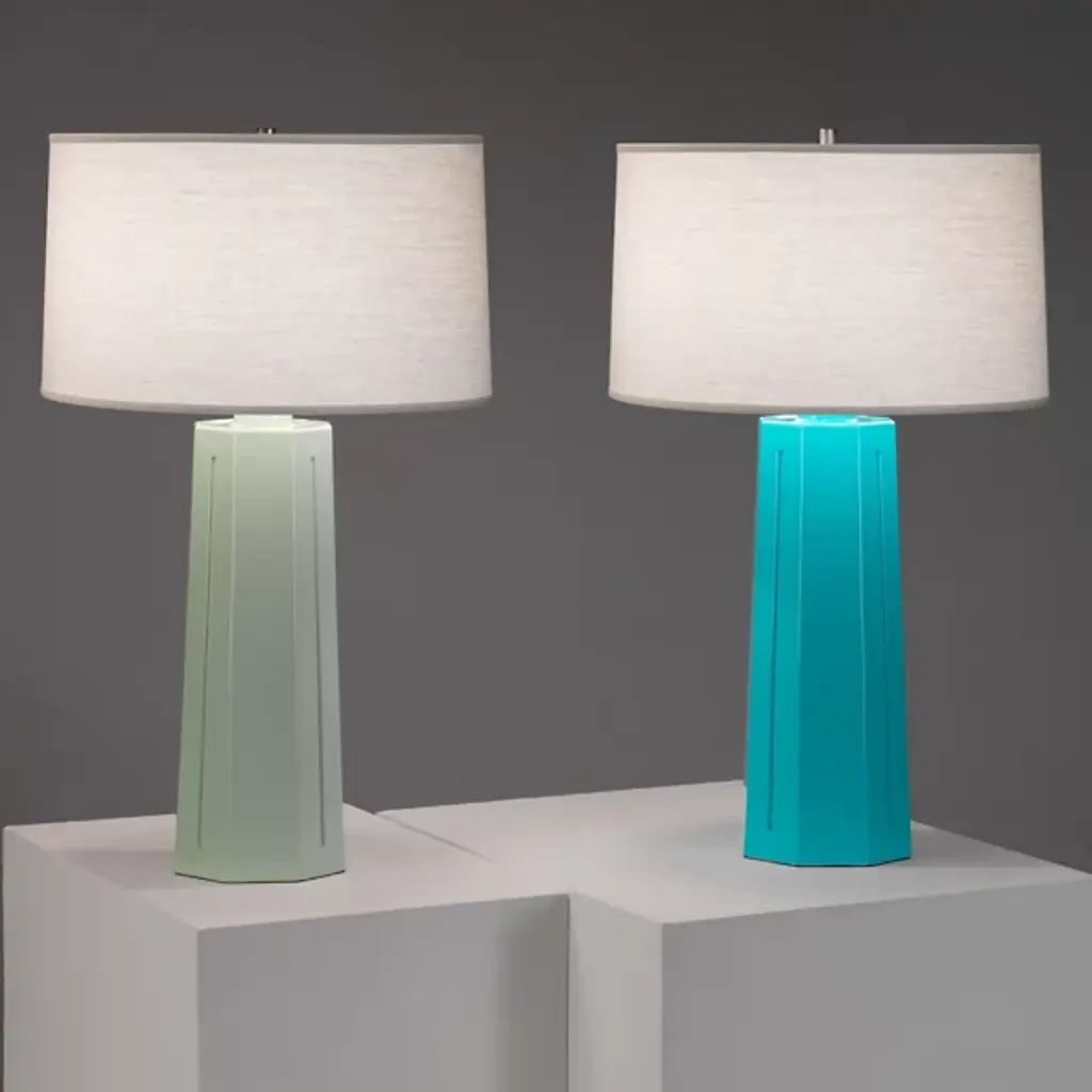 A perfect choice when just a splash of color is needed to liven up the look of a room. The Mason Table Lamp by Robert Abbey features an elegant, simple Oyster Linen drum shade and a glossy Glazed Ceramic base available in a wide assortment of vibrant colors. The piece’s aesthetic is completed with polished nickel accents, and a three way switch provides owners with optimal flexibility to adjust the lamp’s brightness to their preference.