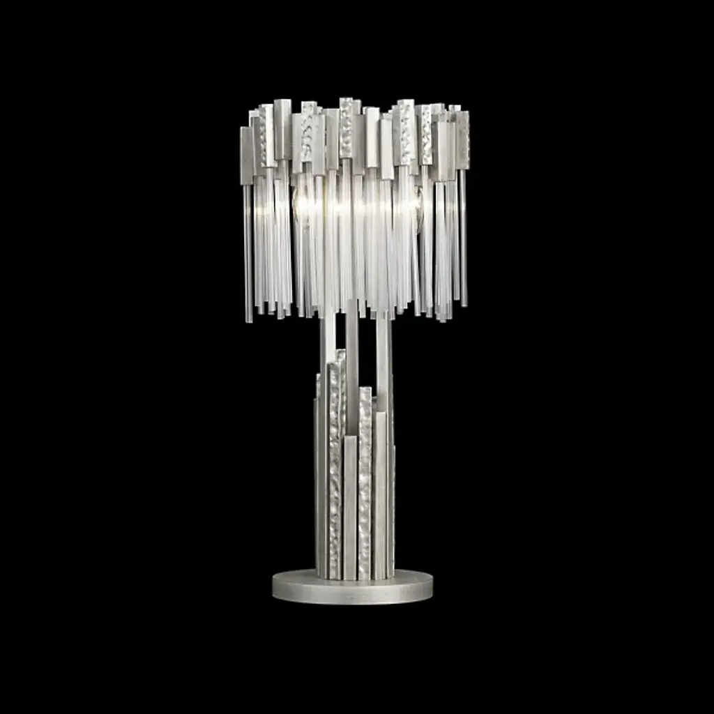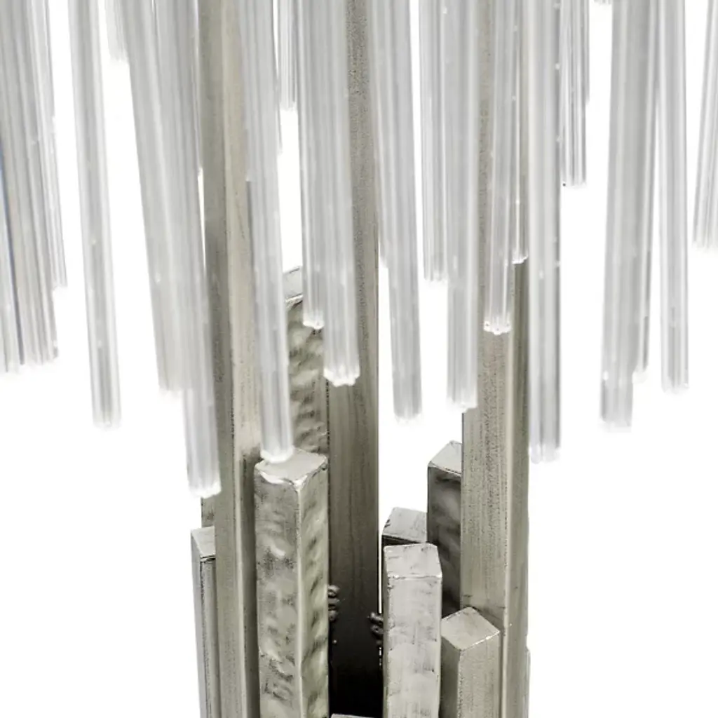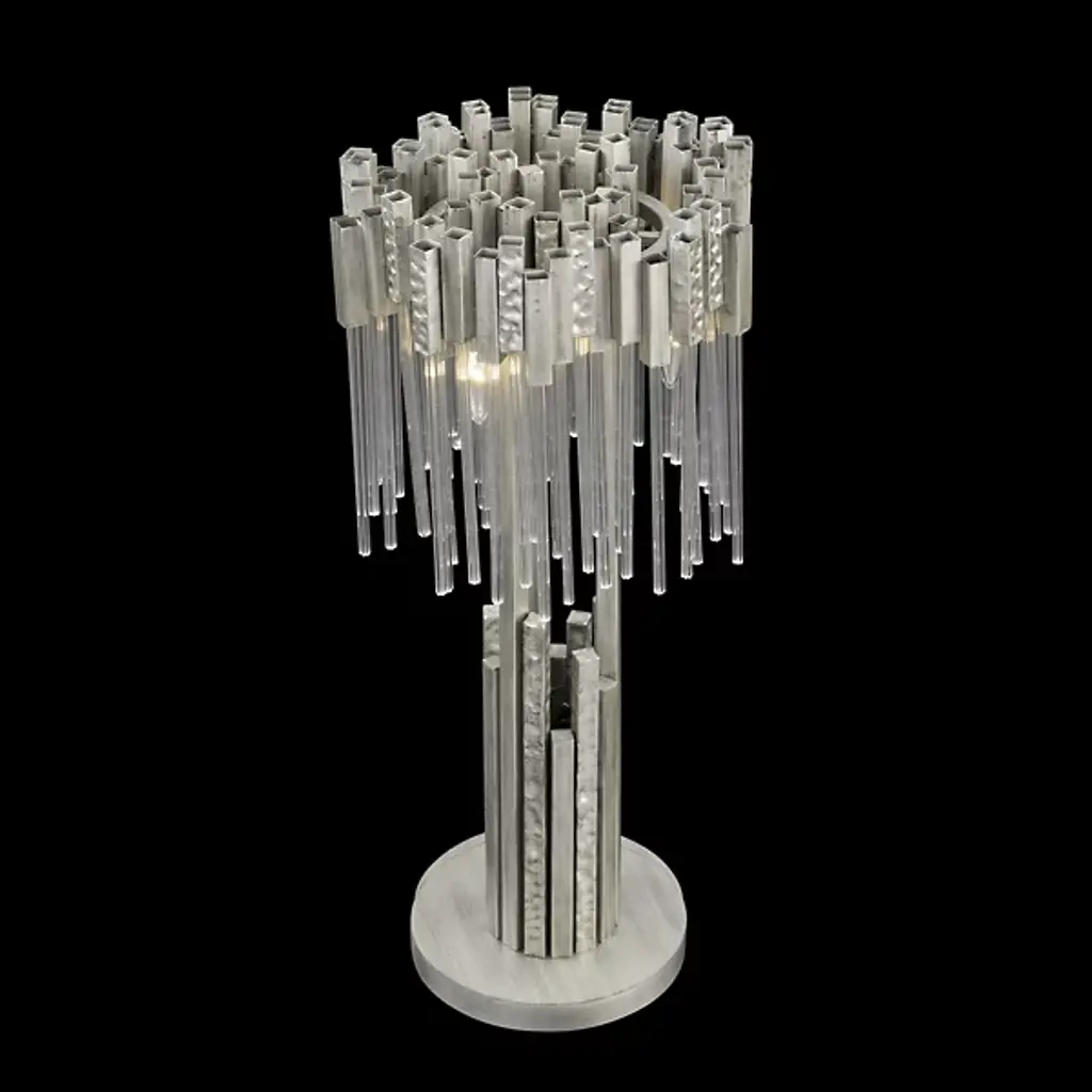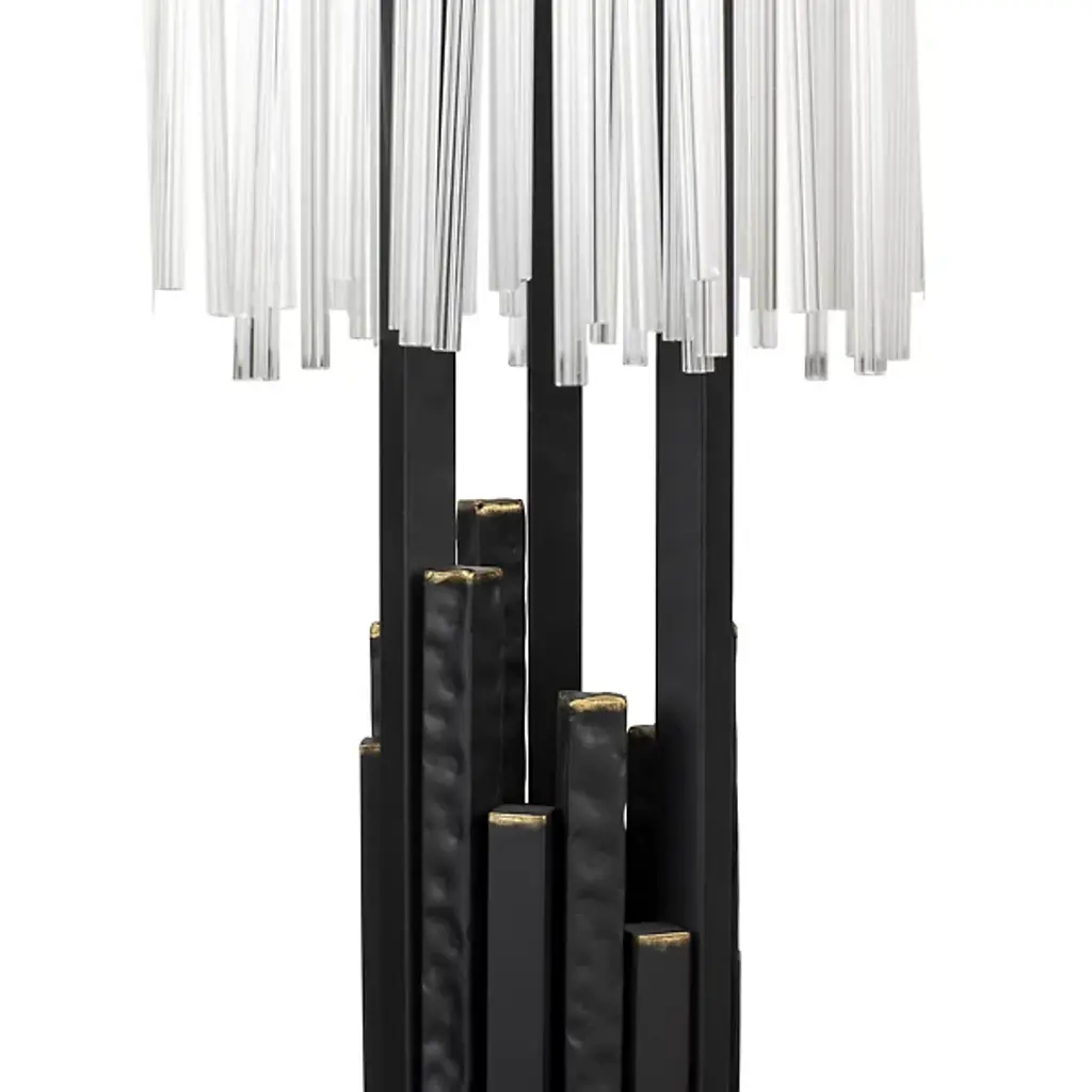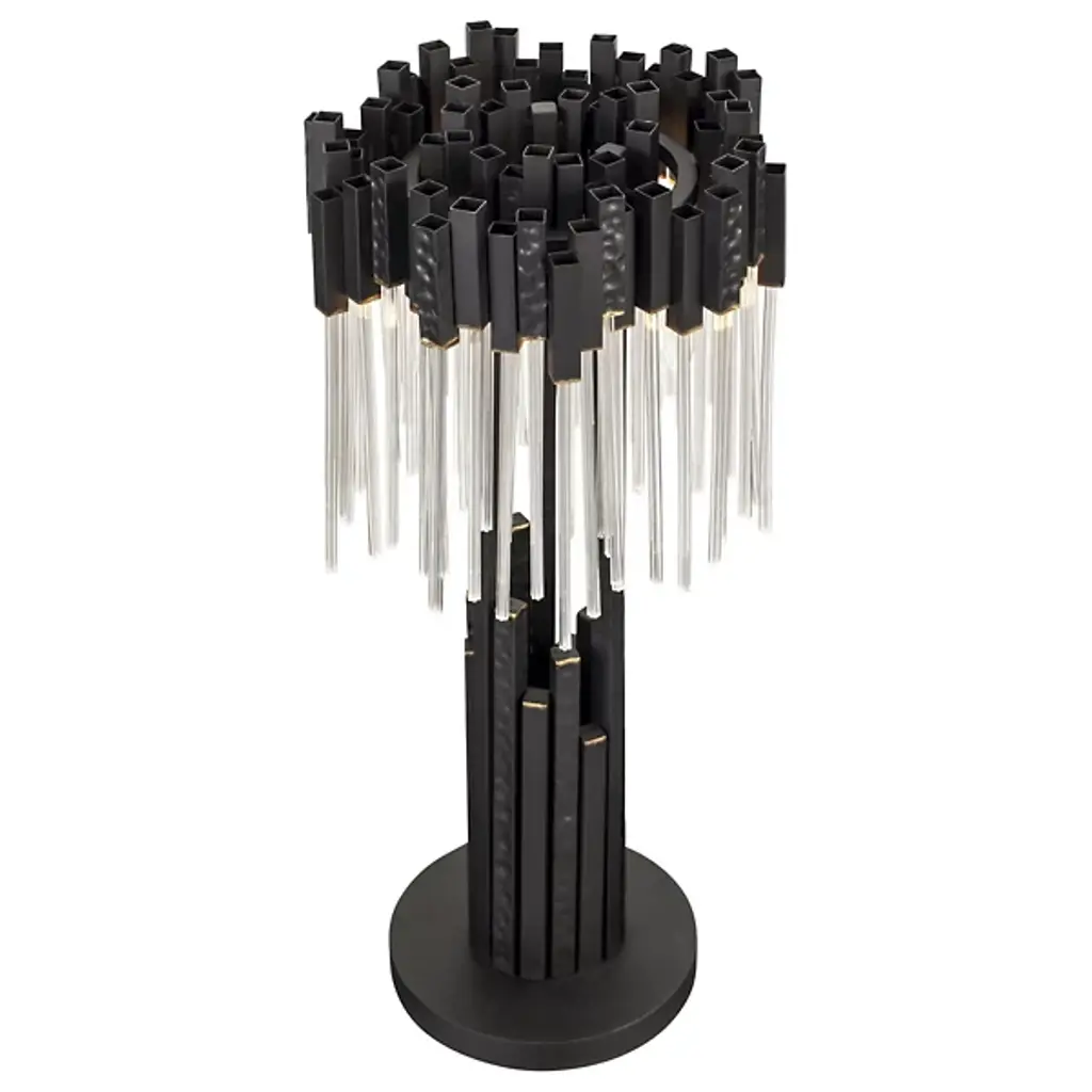 The Matrix Table Lamp from Varaluz is designed by Ron Henderson. Crafted from hand-forged recycled steel, this table lamp is an eco-conscious work of art. The shade, adorned with fluted clear glass rods, complements the contemporary design. Illuminate your space with style and flexibility, as Matrix offers dimmable functionality when used with a separately sold ELV dimmer. Exuding the glamorous aesthetic of the '70s, this lamp features randomly hammered design elements, creating a distinctive look.