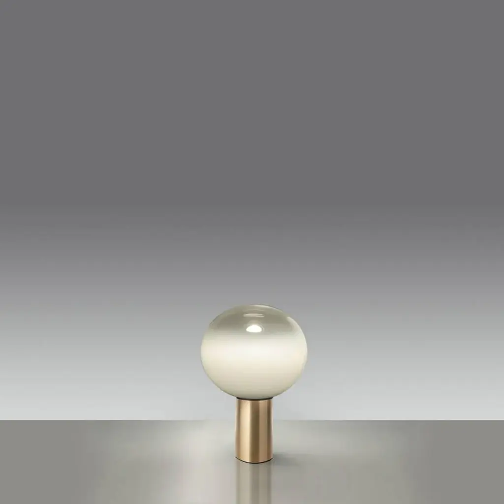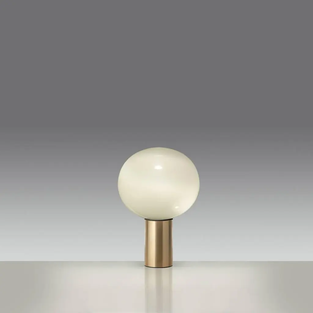 Mattheo Thun 'Laguna 26' glass and gold metal table lamp for Artemide. Executed in hand blown milky white glass with a crystal finish at the top and perfectly mounted atop a gold painted aluminum base. According to Thun, "The lagoon of Venice was the main inspiration: Its fascinating atmosphere, its light and its mist. The character of the collection reflects its main material: hand blown glass from Venice”. As such, the Laguna's lyrical design casts a warm and softly diffused light in its surrounding environment.Price is per item. Available to order in unlimited quantities in three sizes as well as in choice of gold or bronze base - please see our separate listings. This listing is for the Laguna 26 with a gold base.In stock lead time 1-2 weeks. Out of stock lead time can add an additional 10 weeks or more. Lead times subject to change without notice. Please contact us for current lead times prior to placing time-sensitive orders.Born in Italy in 1952, Matteo Thun co-founded the Memphis Design movement in 1981. Having trained as an architect, his practice promotes designs which are simple in appearance but complex in meaning. The winner of many awards, in 2004 he was inducted into the Interior Design Hall of Fame.Accommodates a single US standard medium base (E26) A19 LED bulb with a maximum 18 Watts (bulb not included). Powered by black cord with integrated on/off switch. This lamp is IP20 rated and UL listed.Made to order.All sales final.