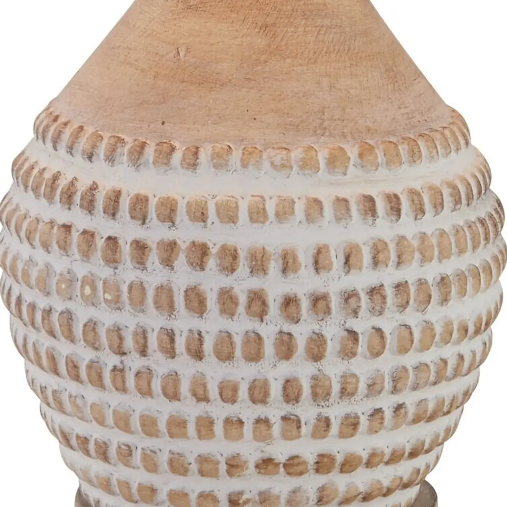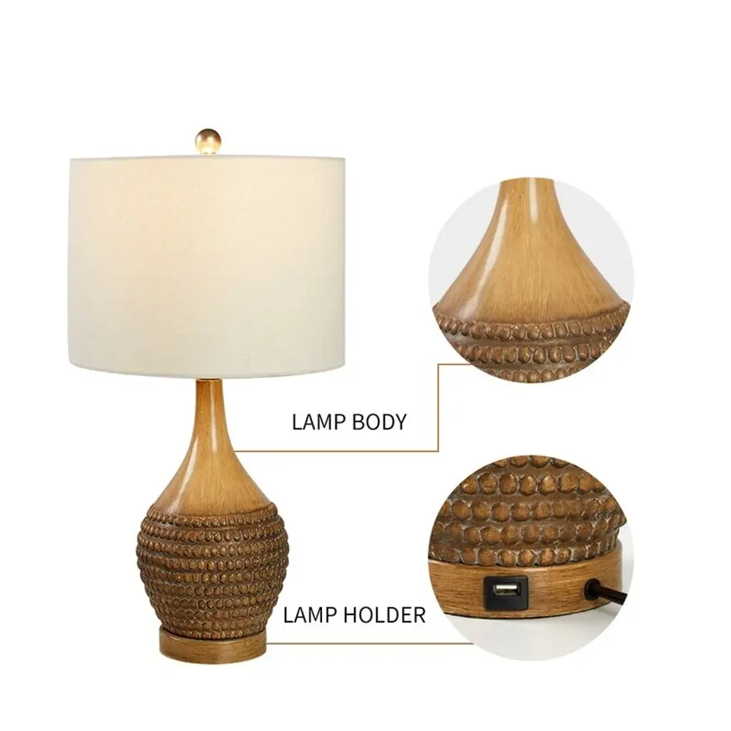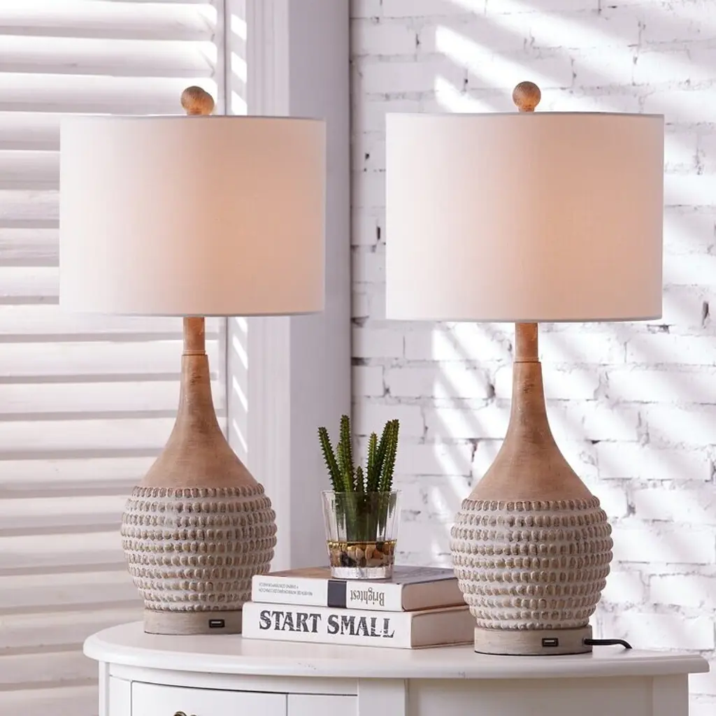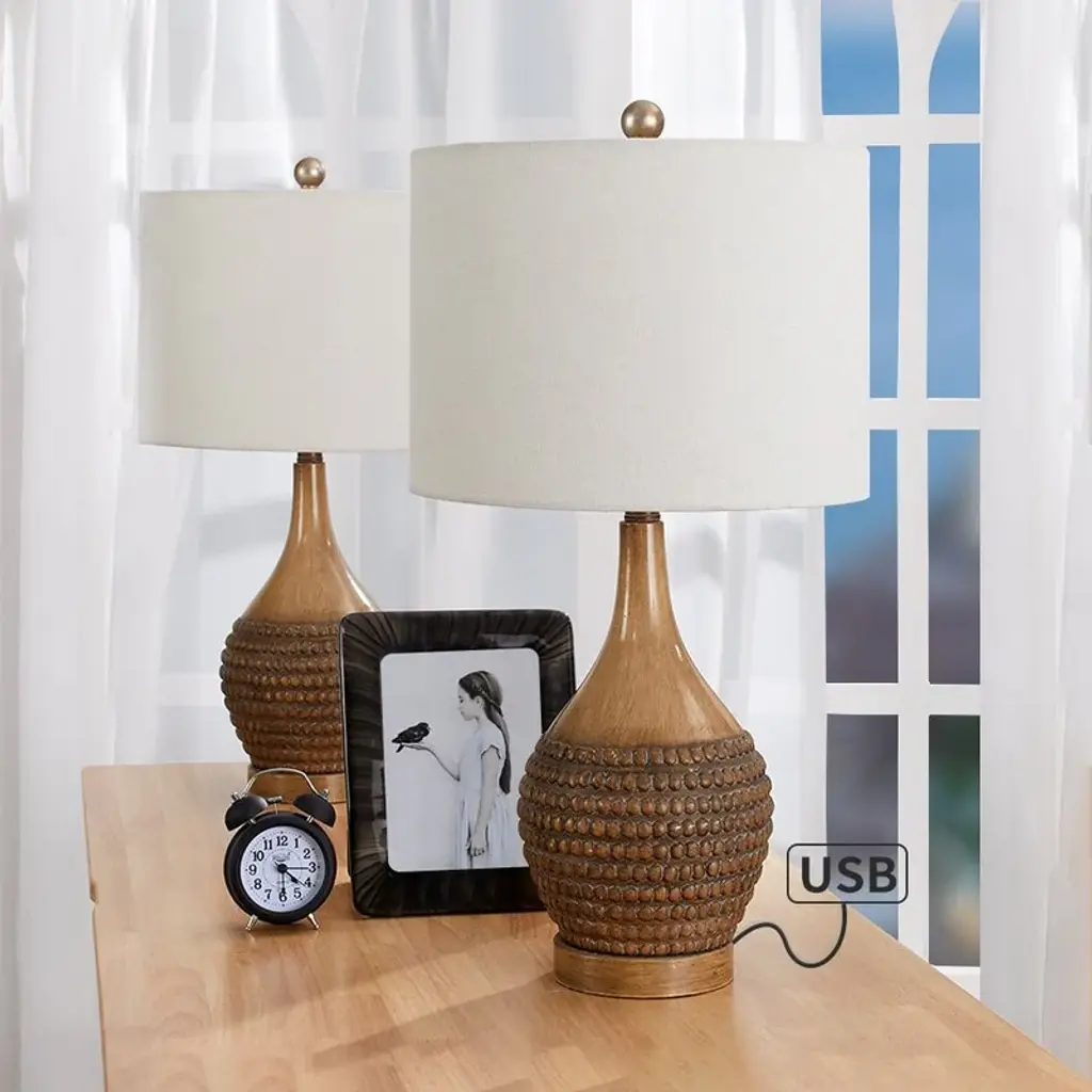 Add a touch of bohemian style to your space with this set of two Maxax table lamps. Made from resin, their gourd-like silhouette features textured bead-inspired details around the body for a breezy design. The brown hue makes them easy to match with your decor. With a built-in USB port in the base, you can keep your devices fully charged. The linen drum shades diffuse the light from the 100W bulbs (not included) throughout your space. Operated by a 3-way switch, you can choose between low or high levels of light.Features: