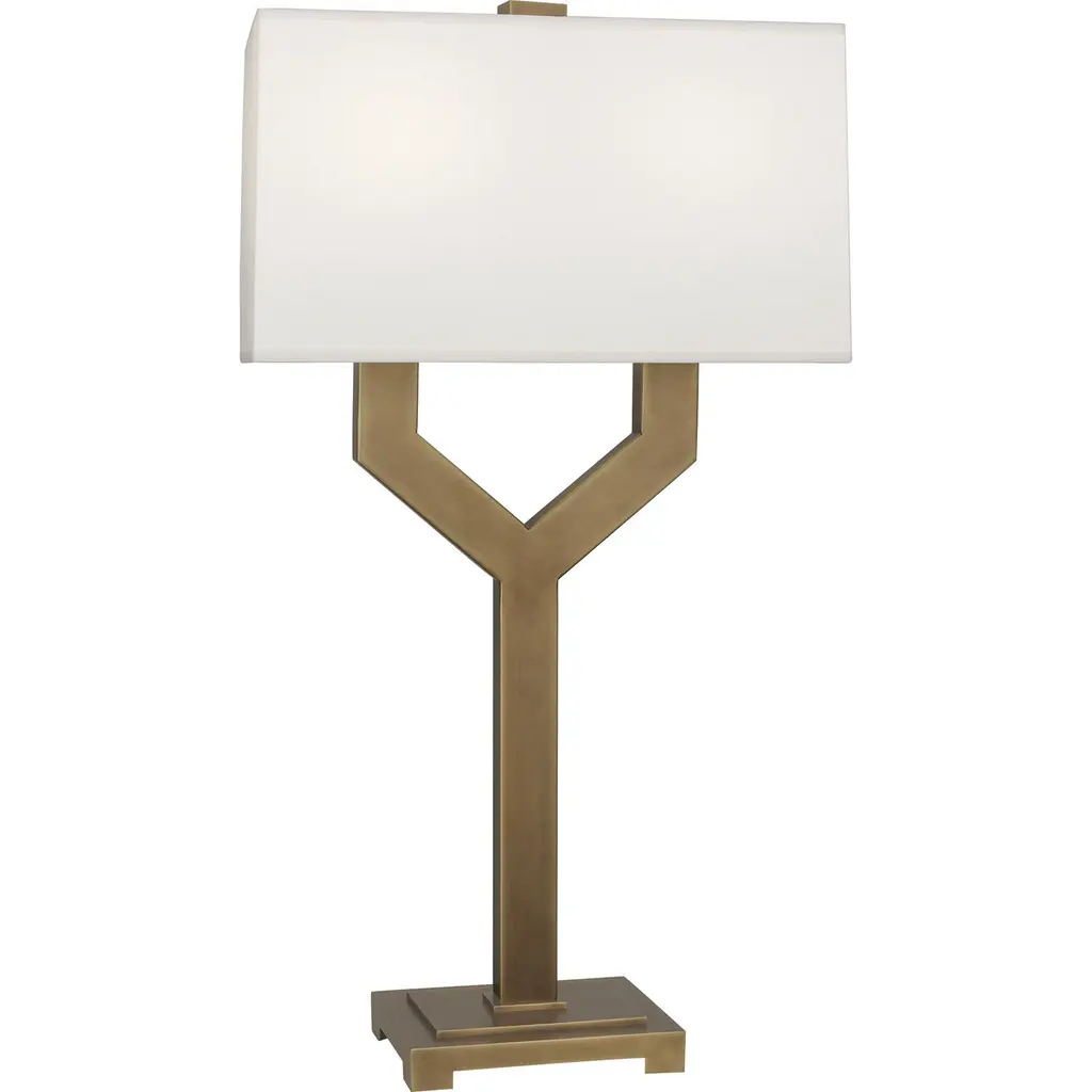 This set of two table lamps adds sleek and simple lines to your space without sacrificing modern, on-trend looks. Each piece rests on a square base with an open, hourglass-inspired central body that comes in a solid-hued finish. An angular, bell-shaped empire shade, with a glossy finial peeking out at the top, surrounds a single bulb. The white linen of the shade tempers the light from this 100W bulb (each sold separately). Compatible with dimmer switches and LED lights, this 30.75" tall set of lamps looks great on either side of your bed or standing sentry on an entryway table.Features: