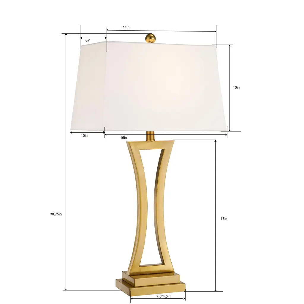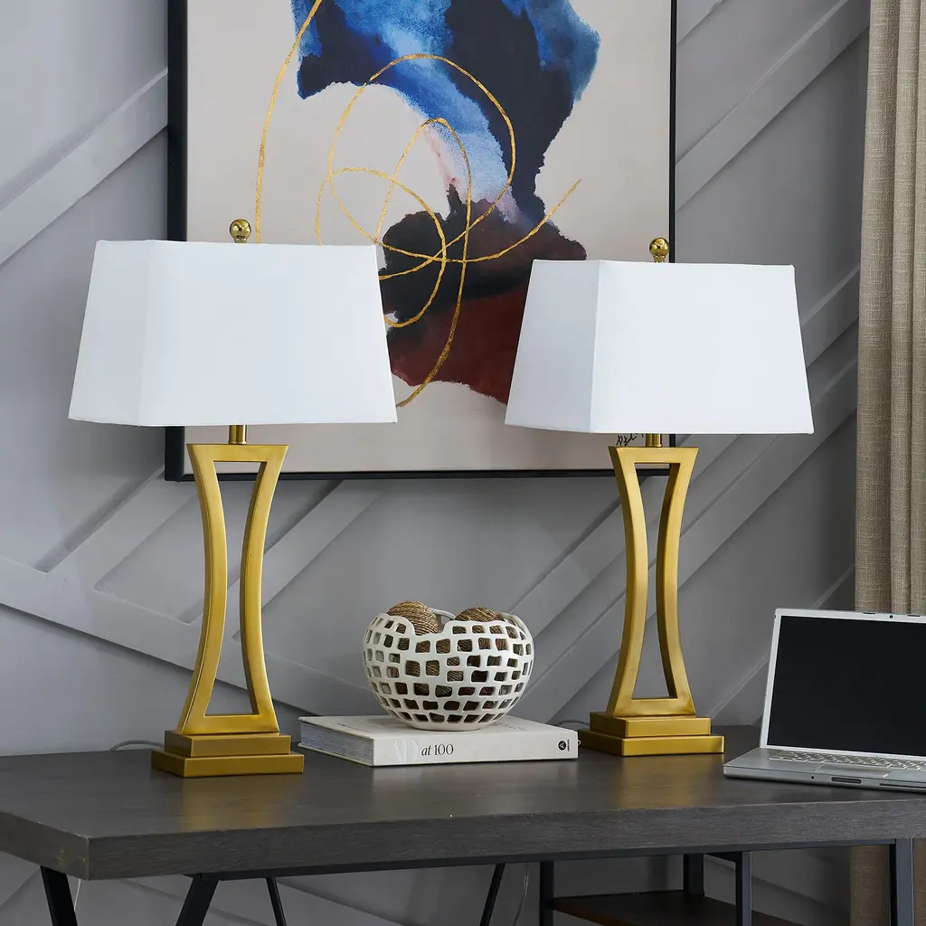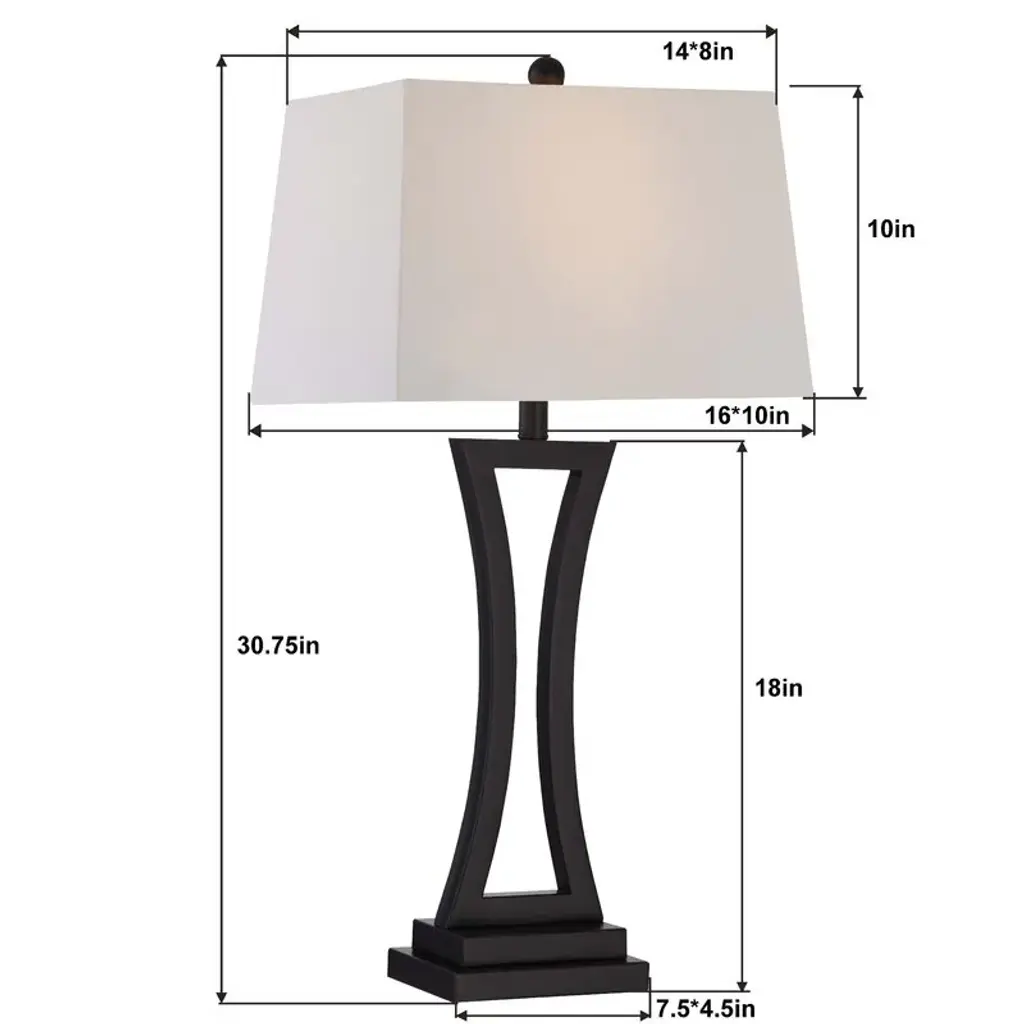 This set of two table lamps adds sleek and simple lines to your space without sacrificing modern, on-trend looks. Each piece rests on a square base with an open, hourglass-inspired central body that comes in a solid-hued finish. An angular, bell-shaped empire shade, with a glossy finial peeking out at the top, surrounds a single bulb. The white linen of the shade tempers the light from this 100W bulb (each sold separately). Compatible with dimmer switches and LED lights, this 30.75" tall set of lamps looks great on either side of your bed or standing sentry on an entryway table.Features: