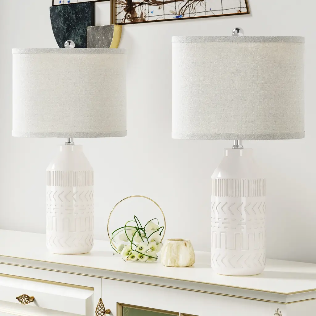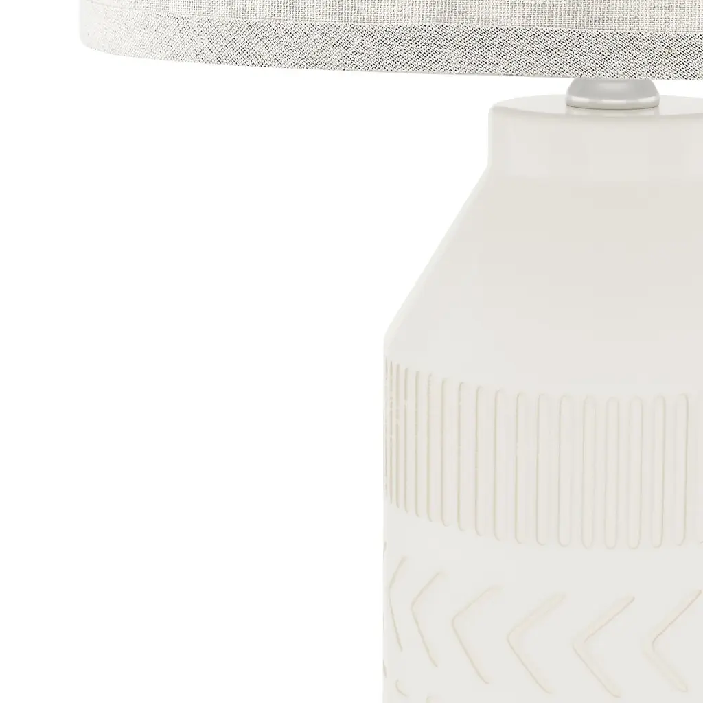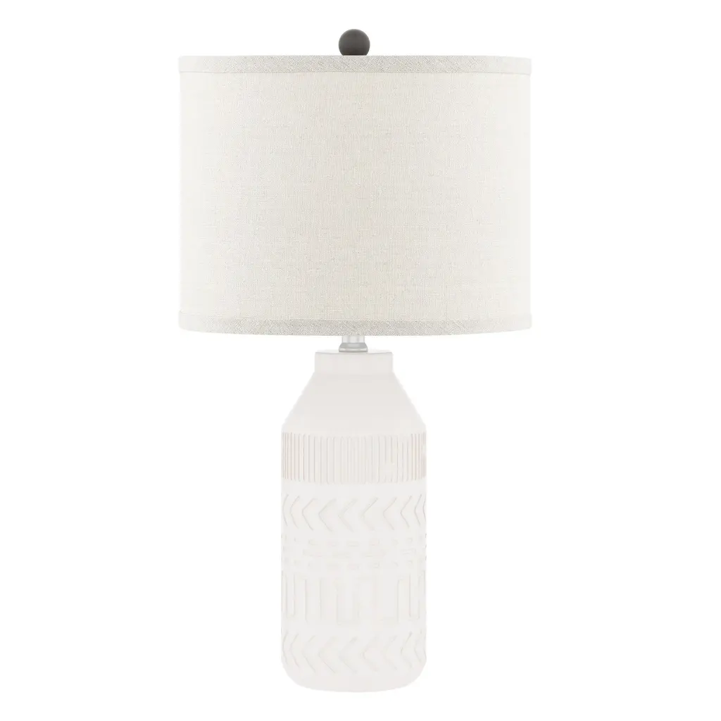 Arriving as a 2-piece set, this ceramic table lamp brings a hint of boho style to complete a mod design for your living area or bedroom. Engraved shapes cover the body, while a simple silhouette is painted a classic white hue. Resting on top is a ball finial and a beige linen drum shade that tempers the glow from a 100W max bulb, sold separately and controlled with the help of a 3-way switch. At 24.5" tall and 5.5" wide at the base, this duo is just the right fit for nightstands and entryway consoles.