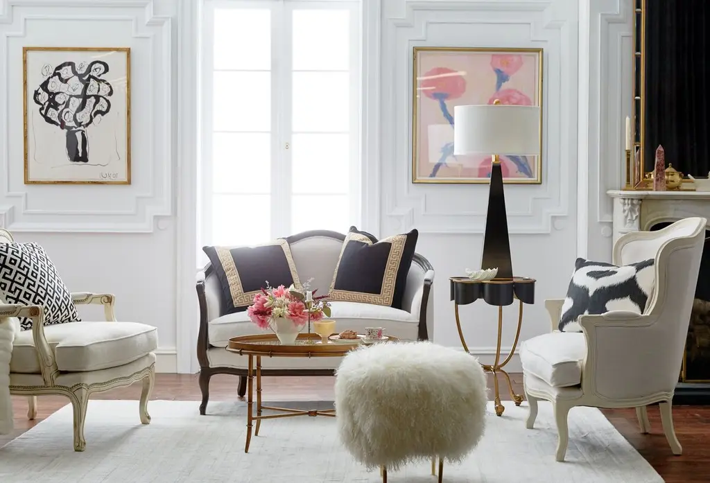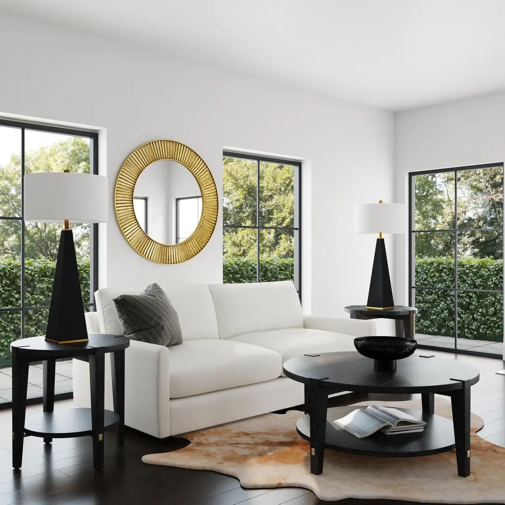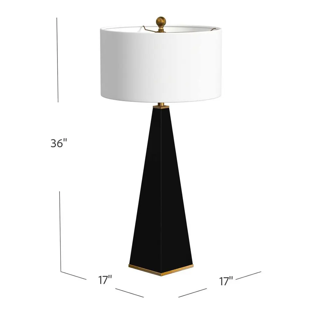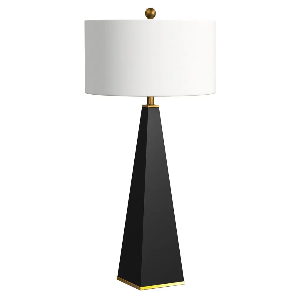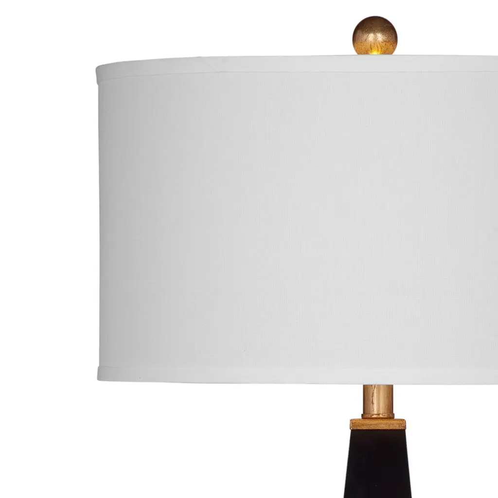 Delicate golden accents pop against the black tapered frame of this resin table lamp. Topped with a paper drum shade and round finial.
