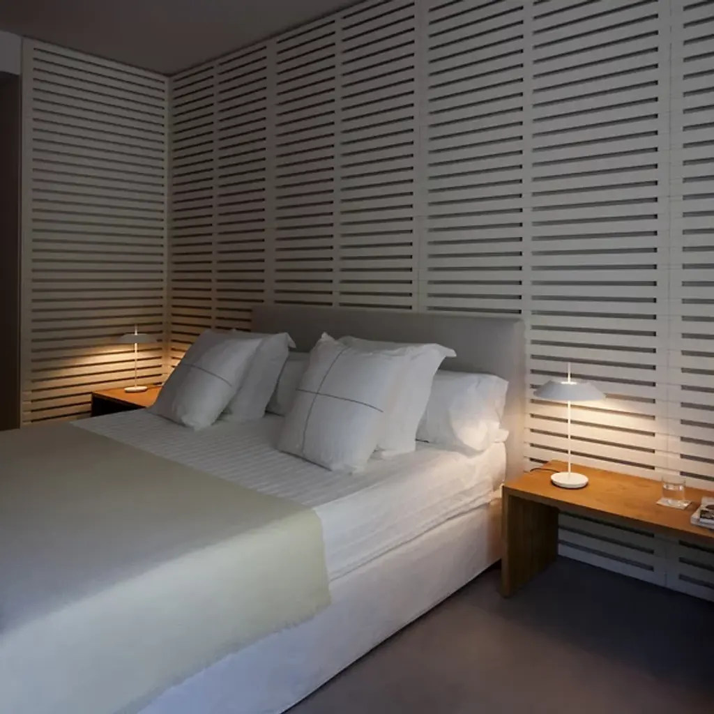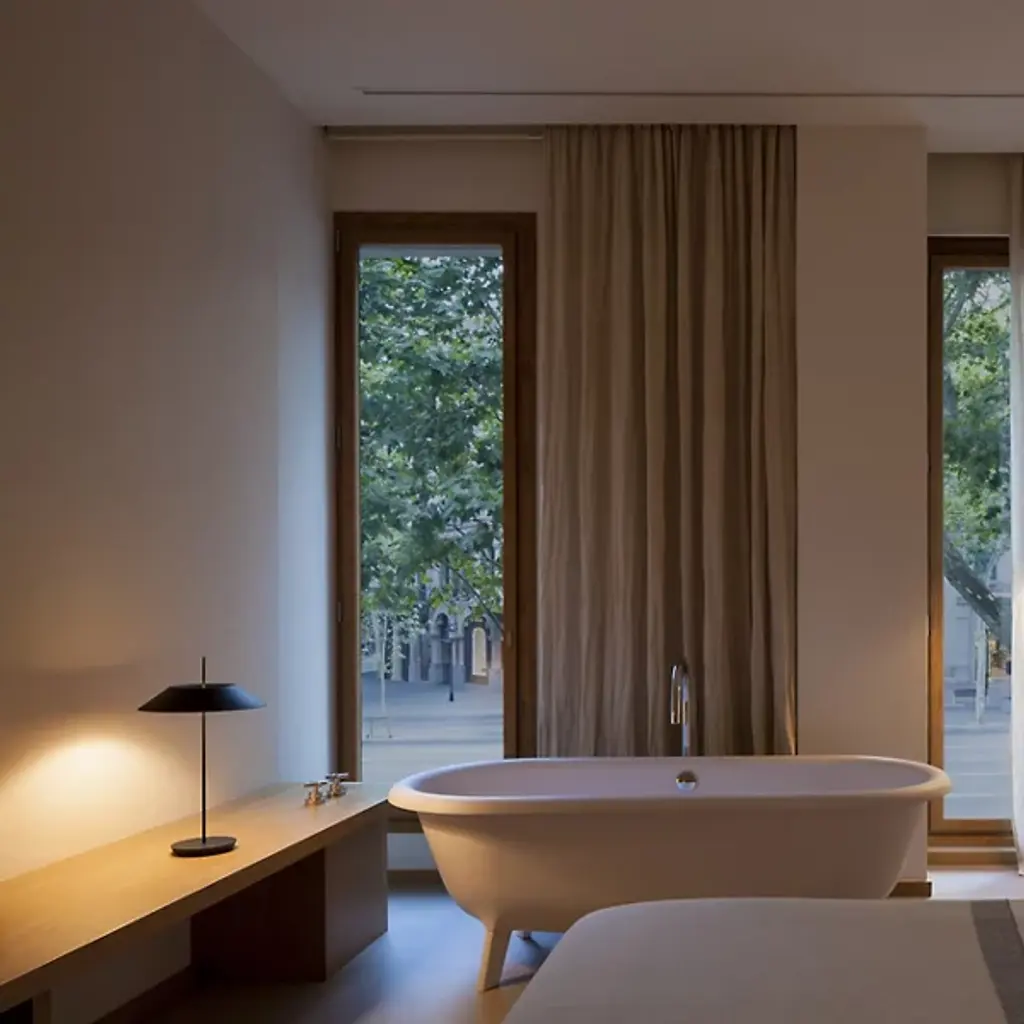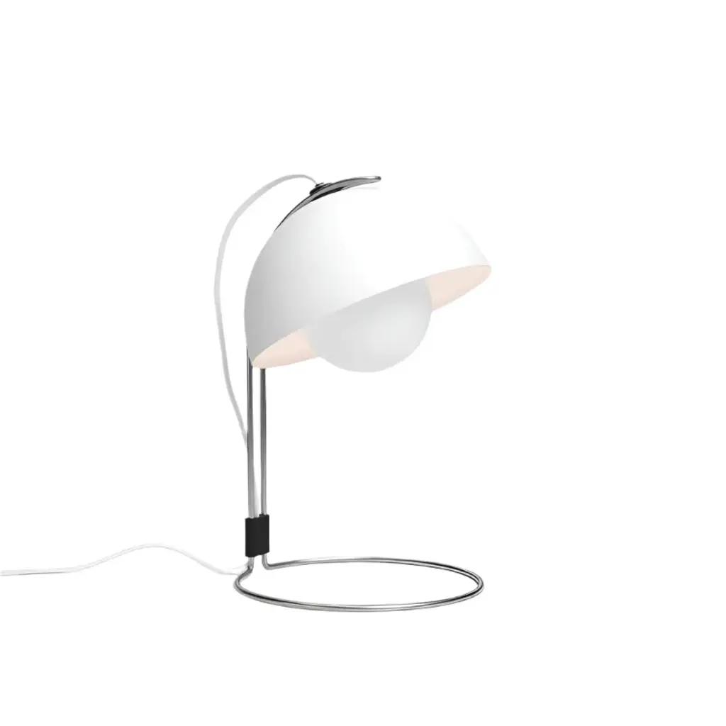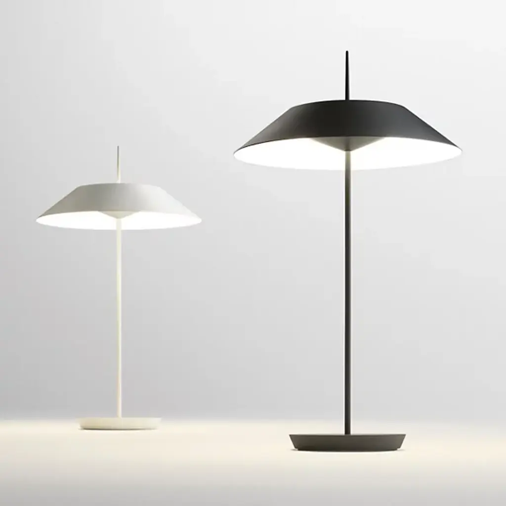 The Mayfair 5505 LED Table Lamp by Vibia features a contemporary reimagination of conventional, old-fashioned table lamps. This sleek table lamp is equipped with an Aluminum Zinc plate, a Steel fixture, and a half conical silhouette. When illuminated, an LED light source emanates a soft downwards glow towards the surface. Suitable for placement on coffee tables, kitchen counters, or hallway console tables.