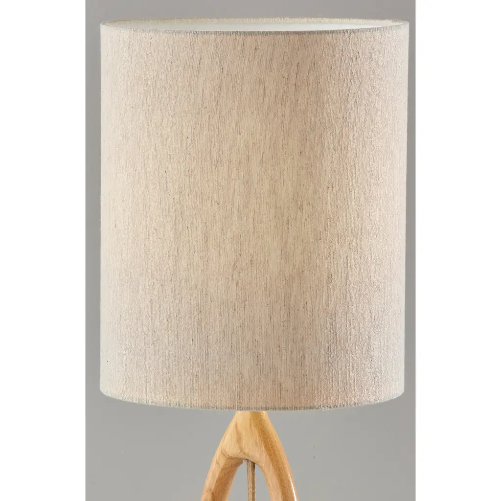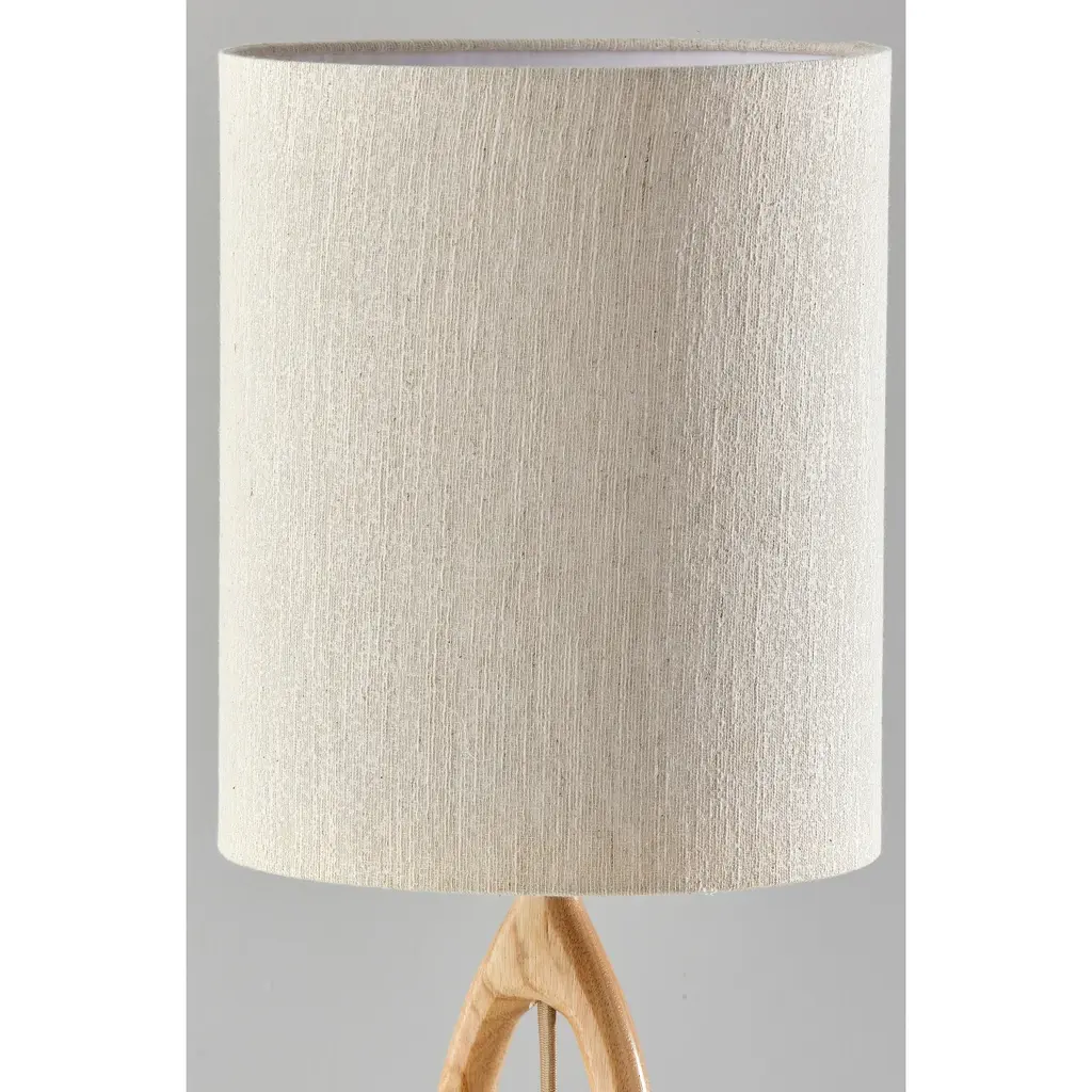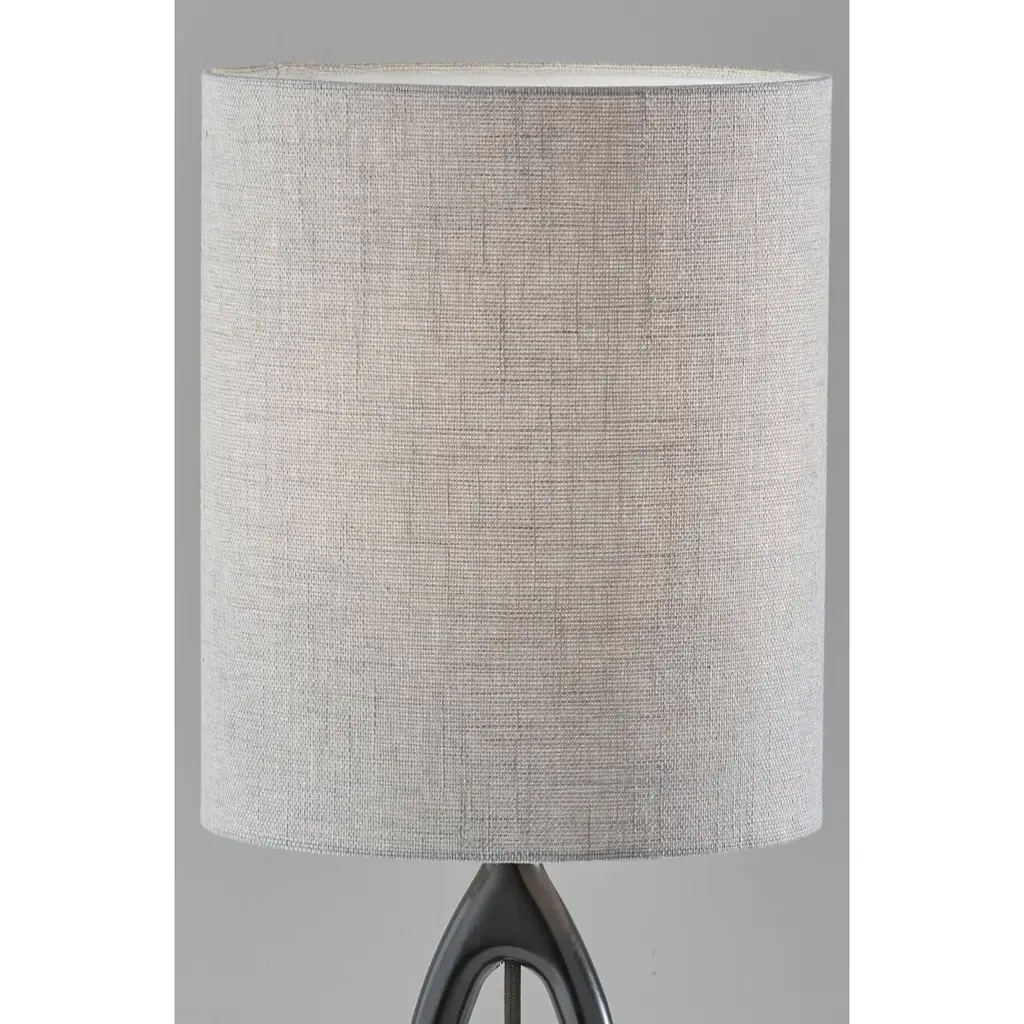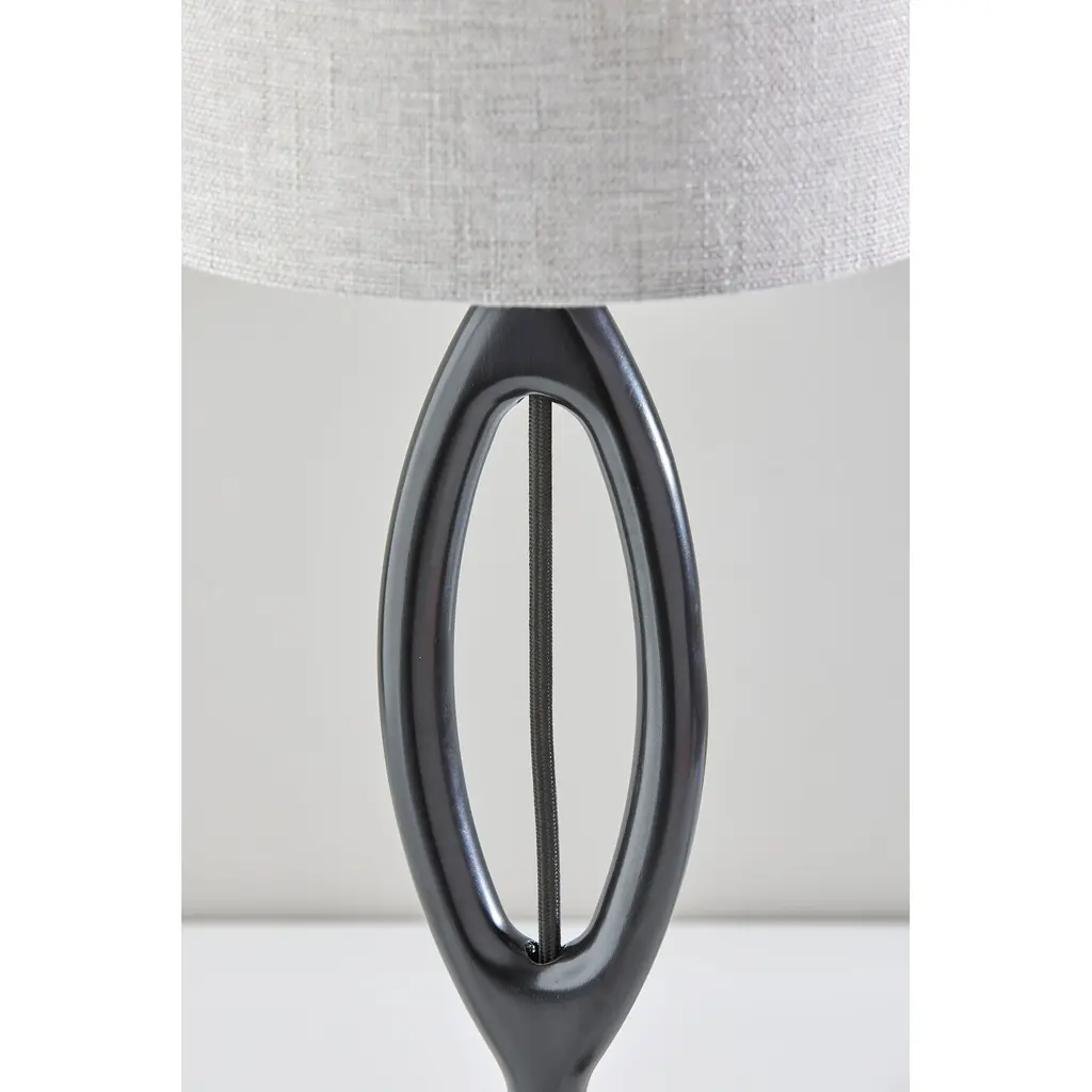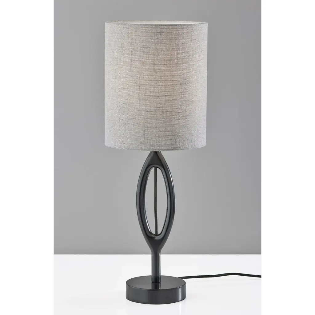 The Mayfair table lamp's elegant, modern design adds style to any space. A 6" round base supports a contoured silhouette fashioned of black wood, while the open design spotlights the grey fabric-covered power cord running through the center. Topping the lamp is a textured, light grey drum shade that softly diffuses the light from a 100W bulb. The lamp is easily operated by a rotary socket switch. To complement coastal or farmhouse styling, the table lamp is also available with natural wood construction and a light beige shade. Complete your décor with the coordinating Mayfair floor lamp.