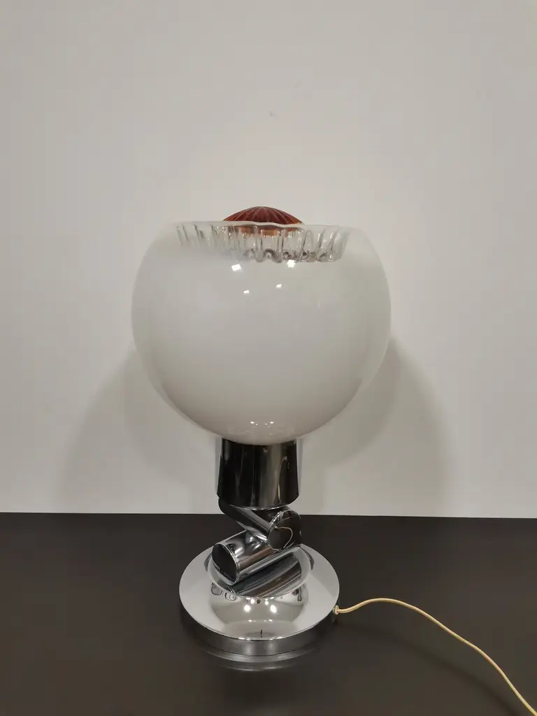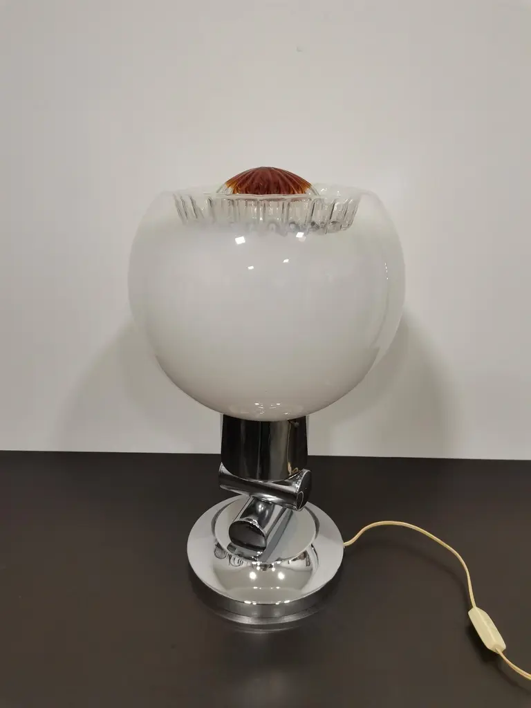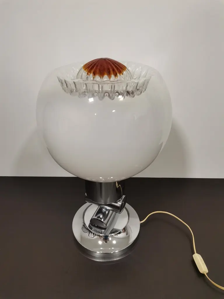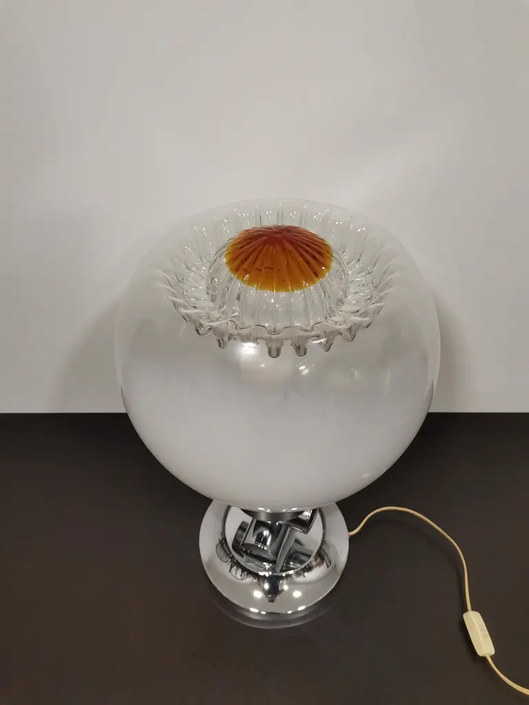 Large and elegant vintage table lamp by Italian designer Mazzega, with hand blown glass globe from white to amber. Very rare design. Murano glass sphere circling on space age chrome with brass highlights.Rare vintage piece with great story.