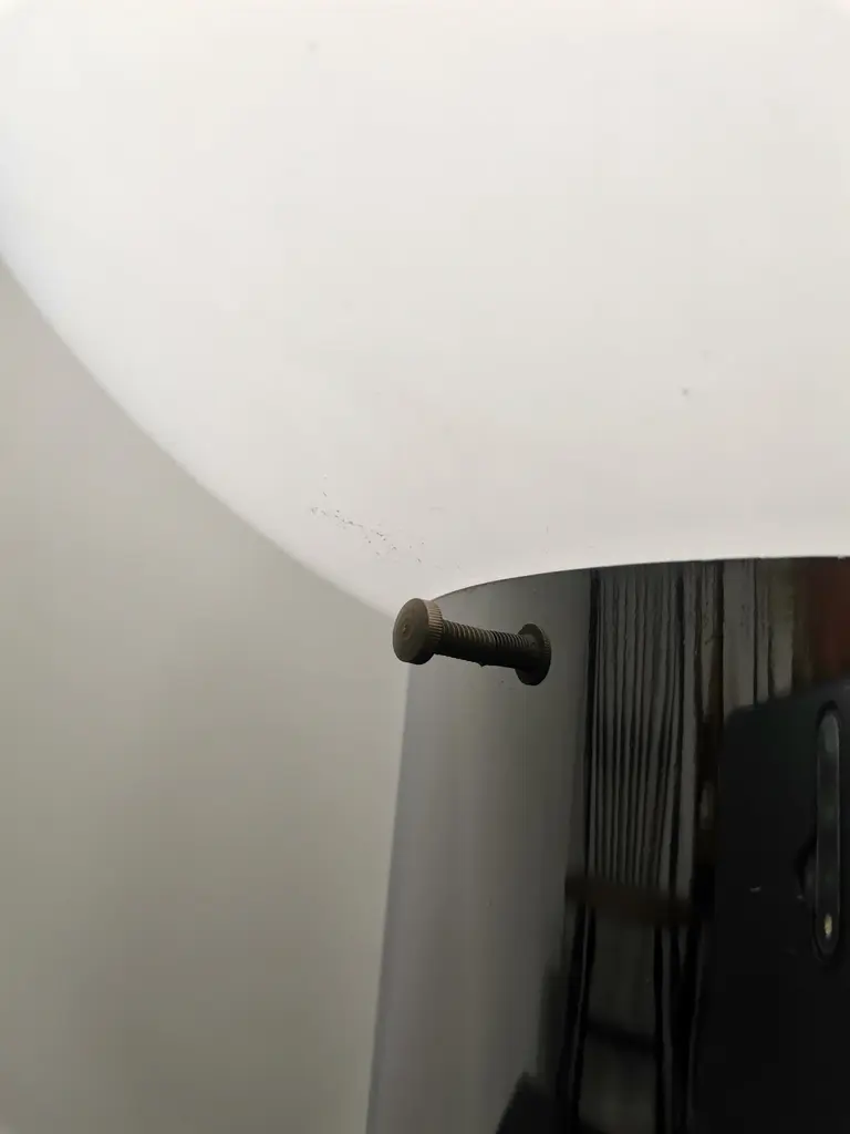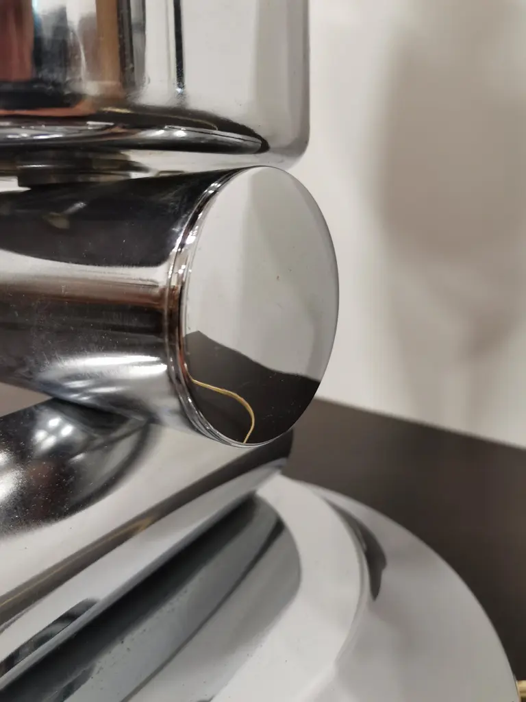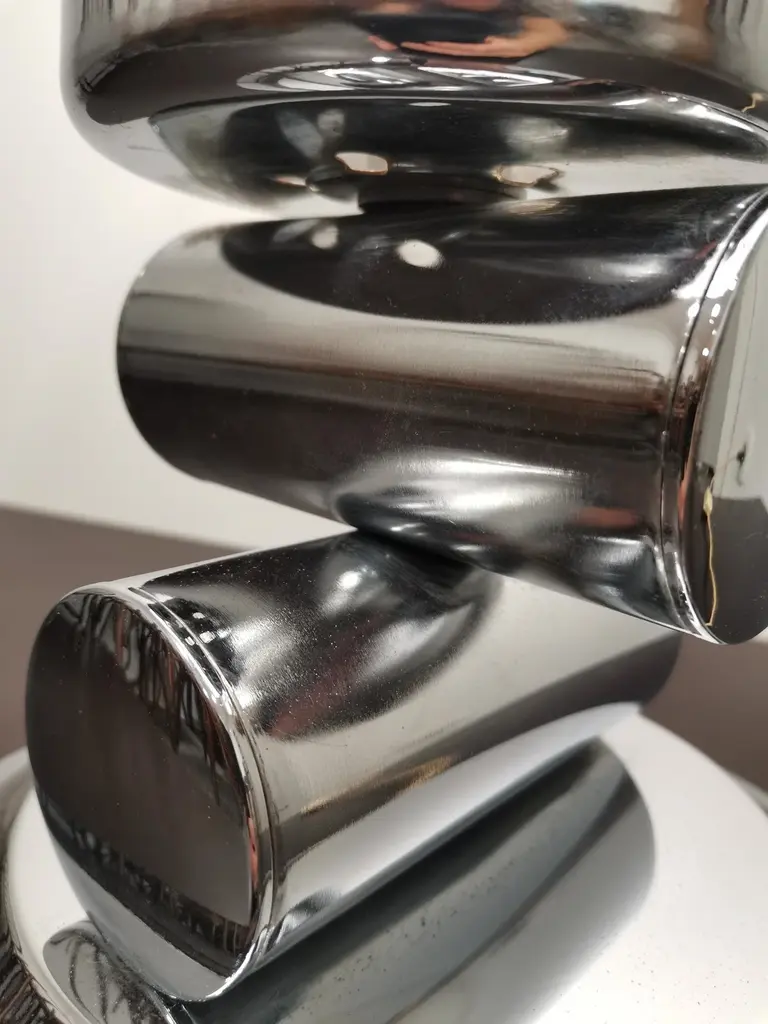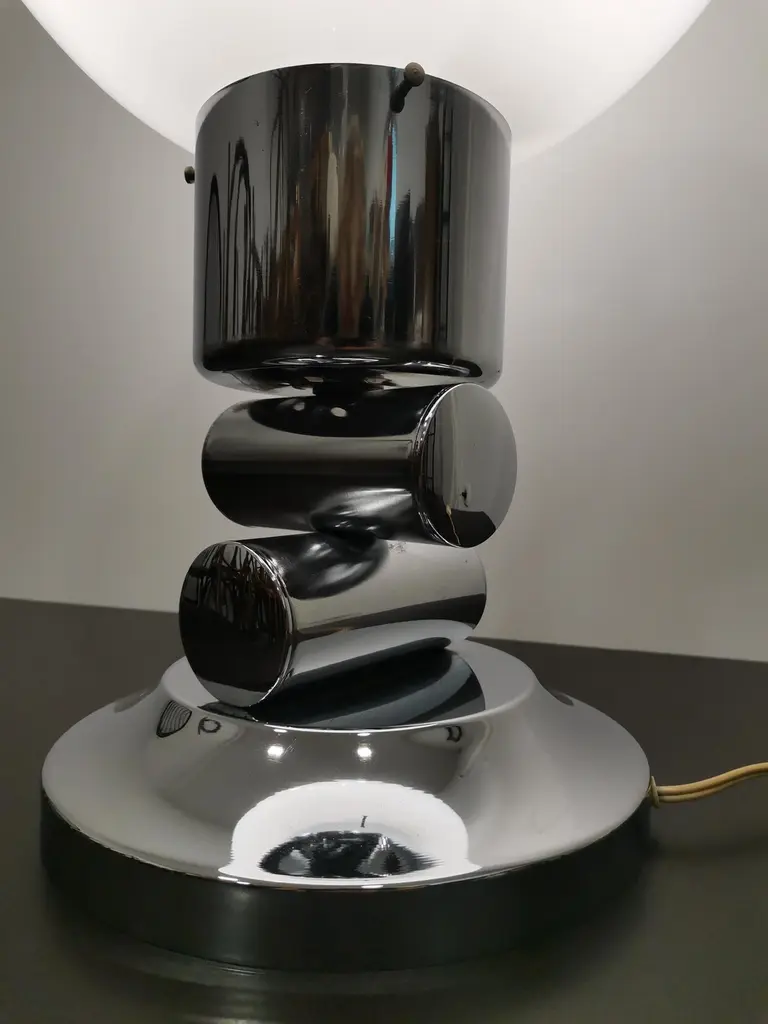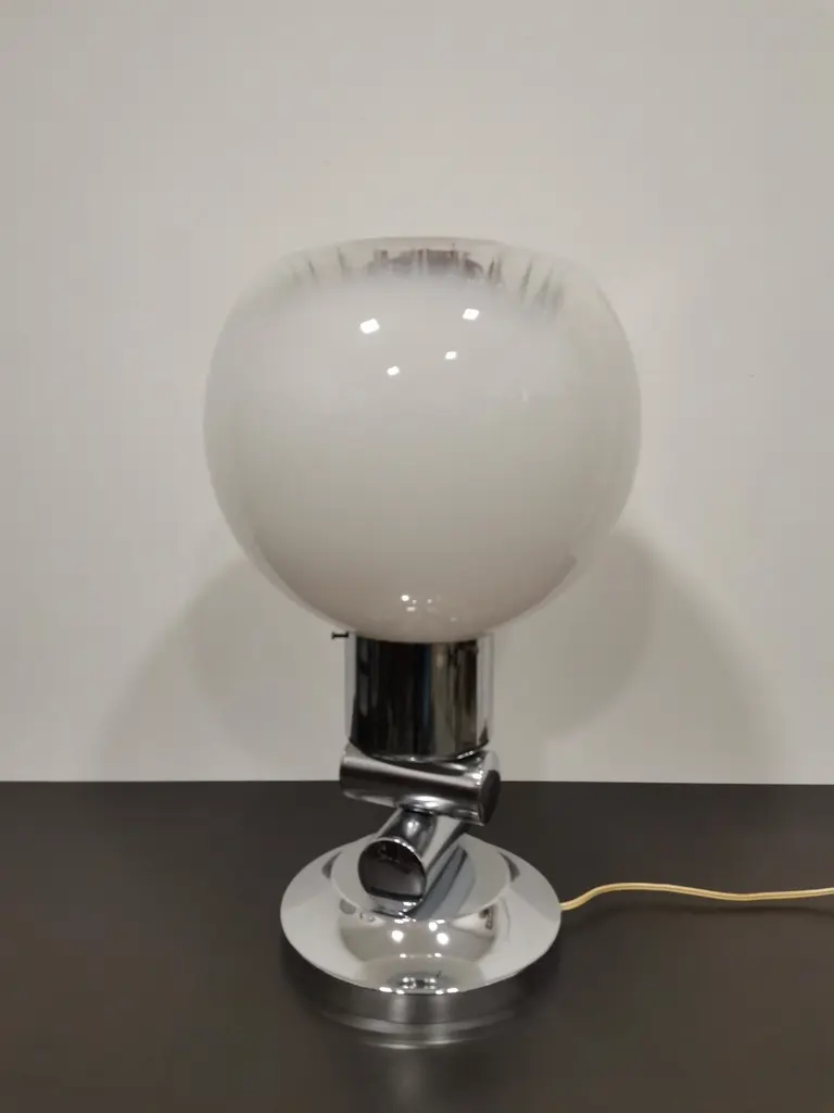 Large and elegant vintage table lamp by Italian designer Mazzega, with hand blown glass globe from white to amber. Very rare design. Murano glass sphere circling on space age chrome with brass highlights.Rare vintage piece with great story.