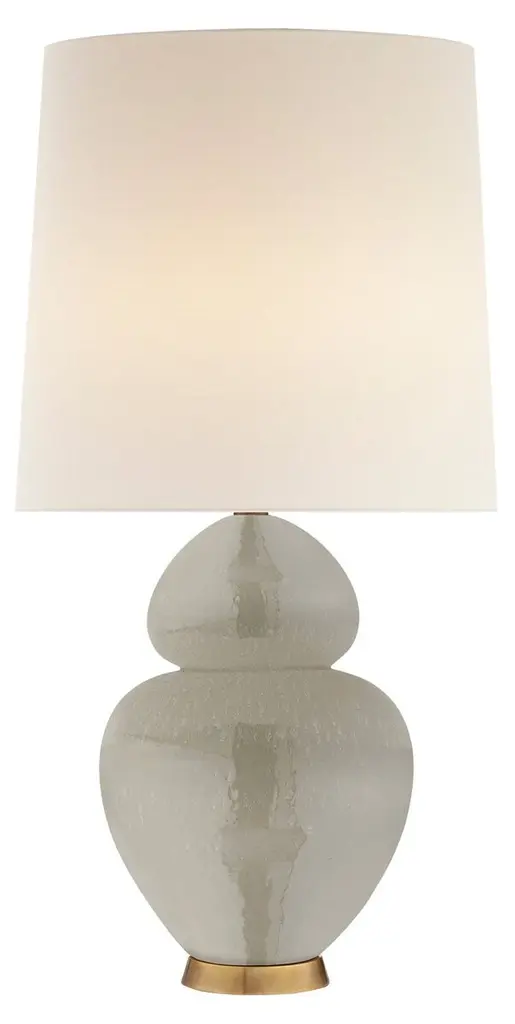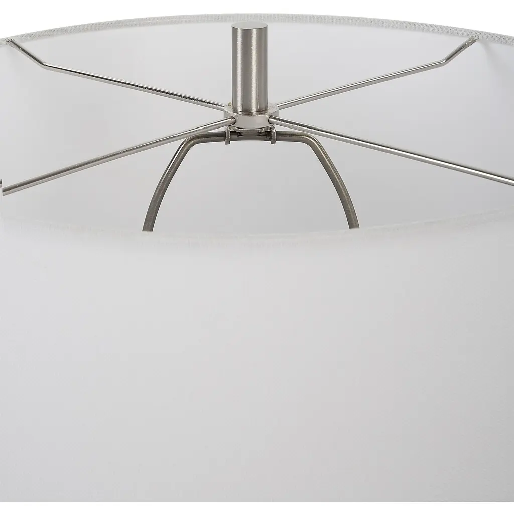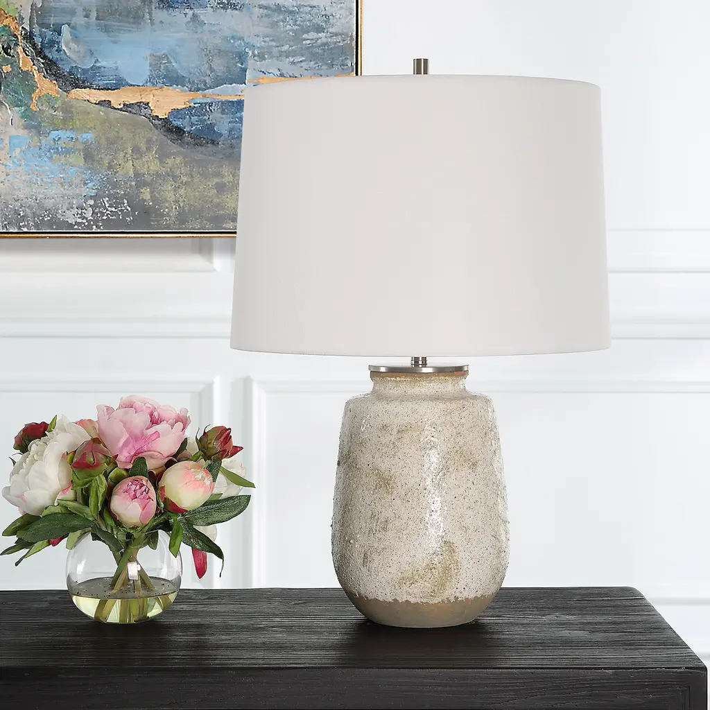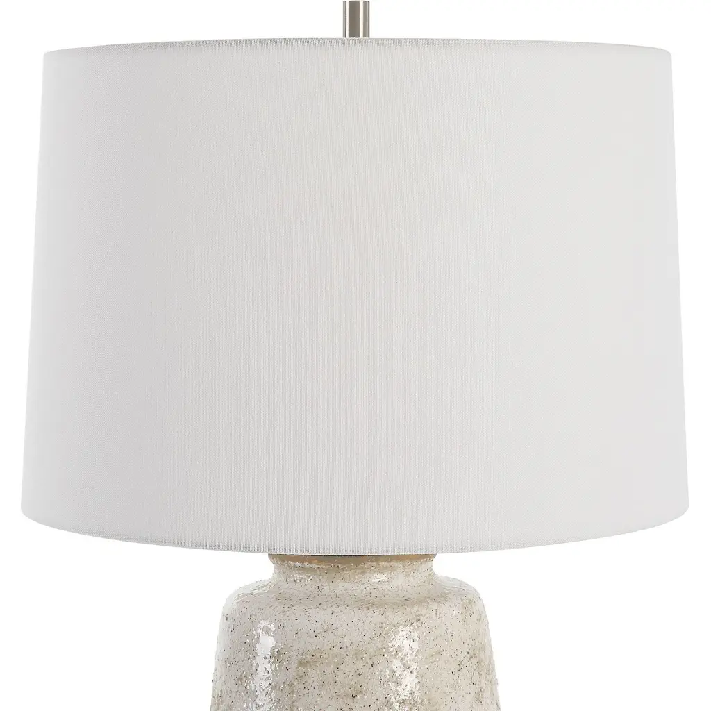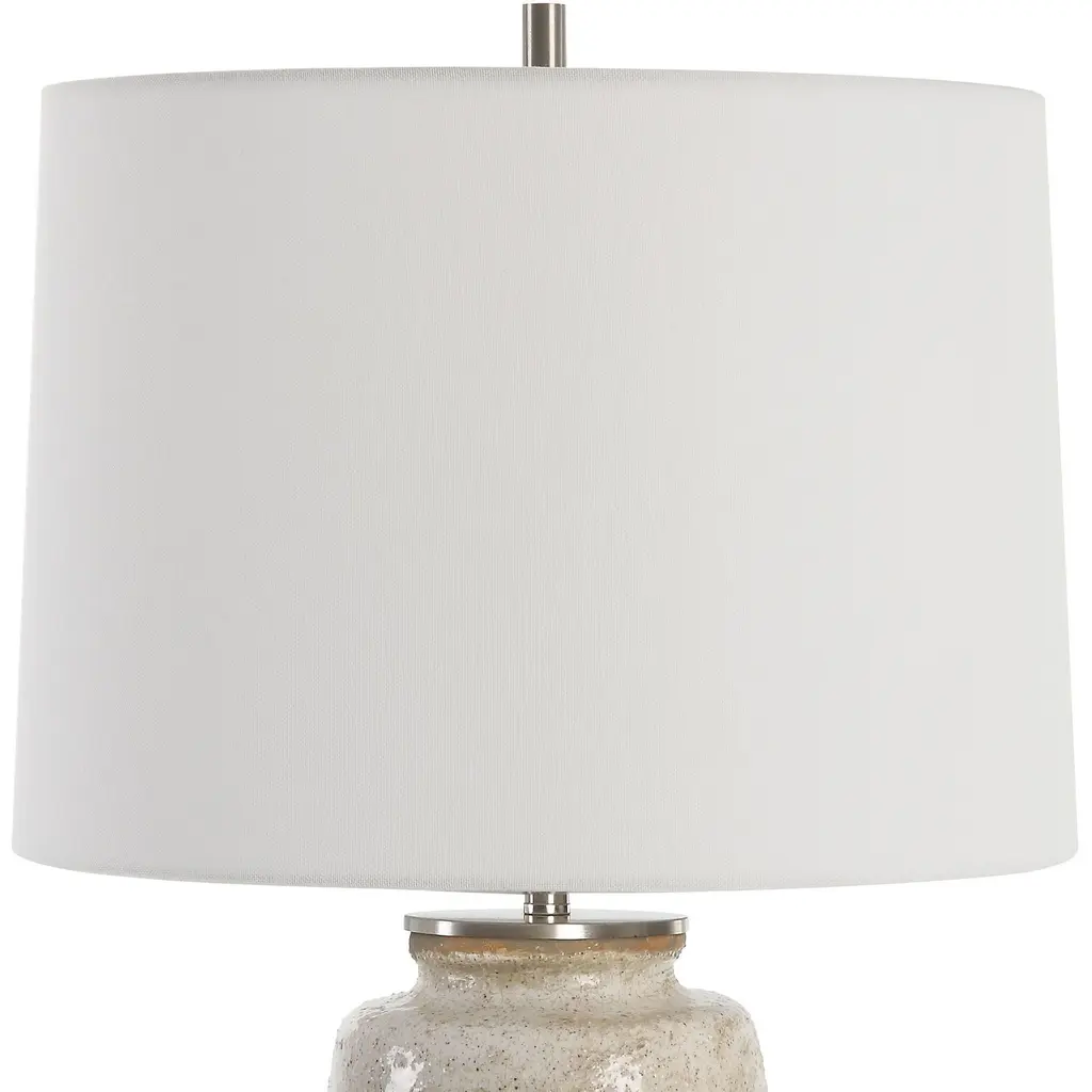 This Ceramic Table Lamp Features Porous Texture Finished In A Taupe And Dove Gray Glaze With A Natural Bottom, And Accented With Brushed Nickel Details. A Slightly Tapered Crisp White Linen Shade Completes The Piece. Due To The Nature Of Fired Glazes On Ceramic Lamps, Finishes Will Vary Slightly.