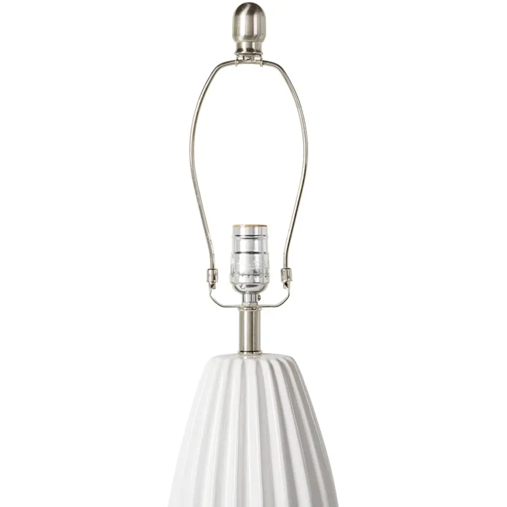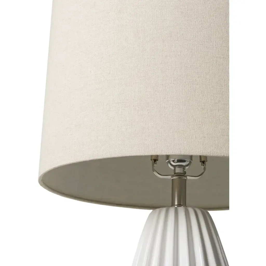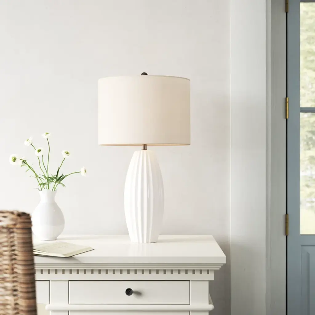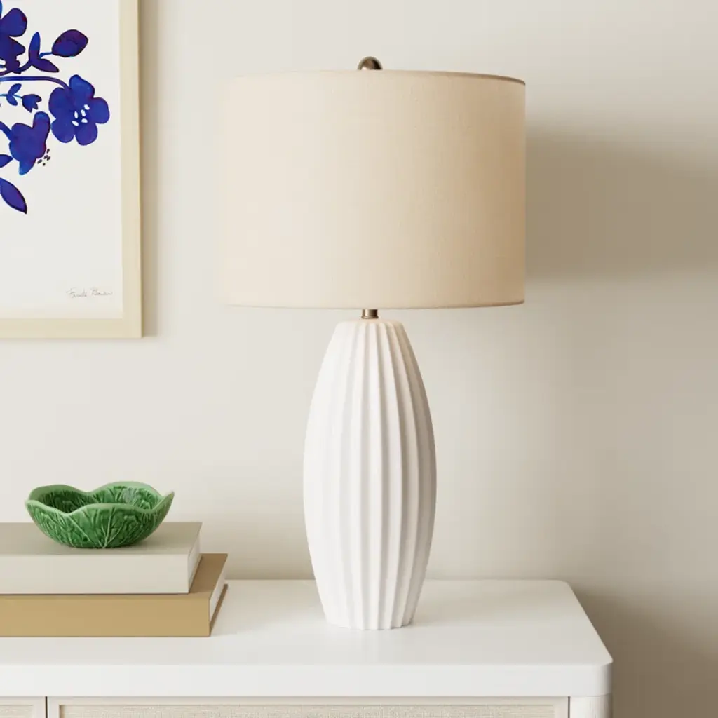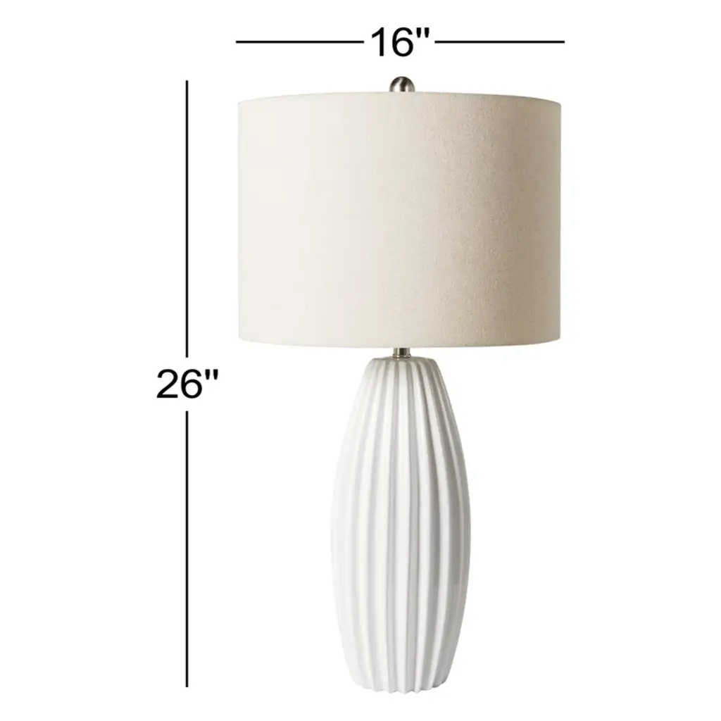 An elongated base with ribbed detailing draws the eye, while the smooth finish enhances the clean and sophisticated appeal of this table lamp. Clad in monochrome tones, this lamp features a ceramic body and a linen drum shade. Place on your nightstand, entryway console, or coffee table for ambient lighting and a burst of modern flair. This table lamp is UL/CUL certified and includes a 3-way switch. For optimal product care, wipe clean with a soft cloth.