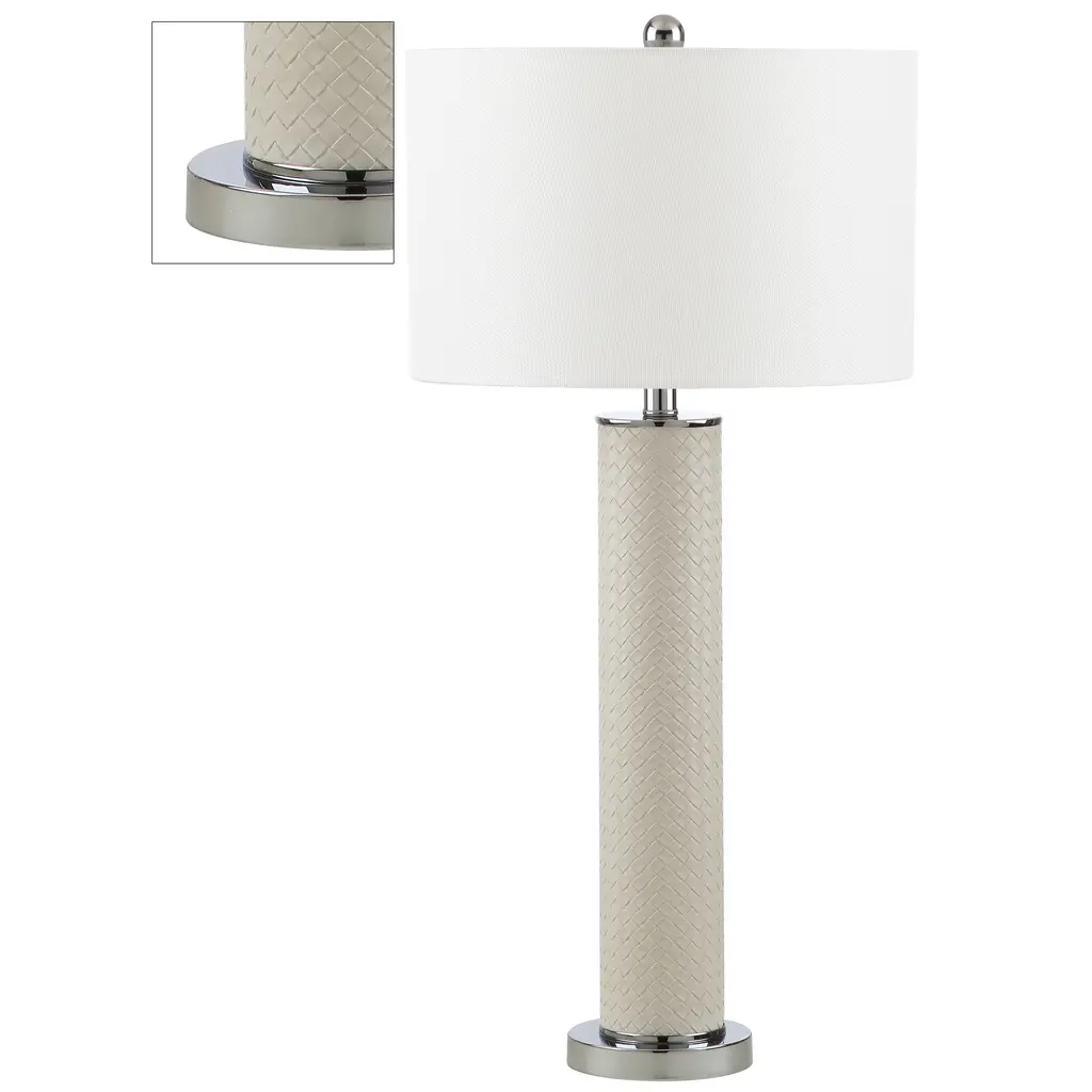 Nautical style spoken through a simple design is what defines this exquisite table lamp. Offered in a combination of light blue and white that makes it unbelievably fresh, it consists of a pleated fabric shade sustained by a streamlined stem that emerges from a parallelepiped-like base covered in faux leather. Rows of white ropes around the base state its nautical flair.