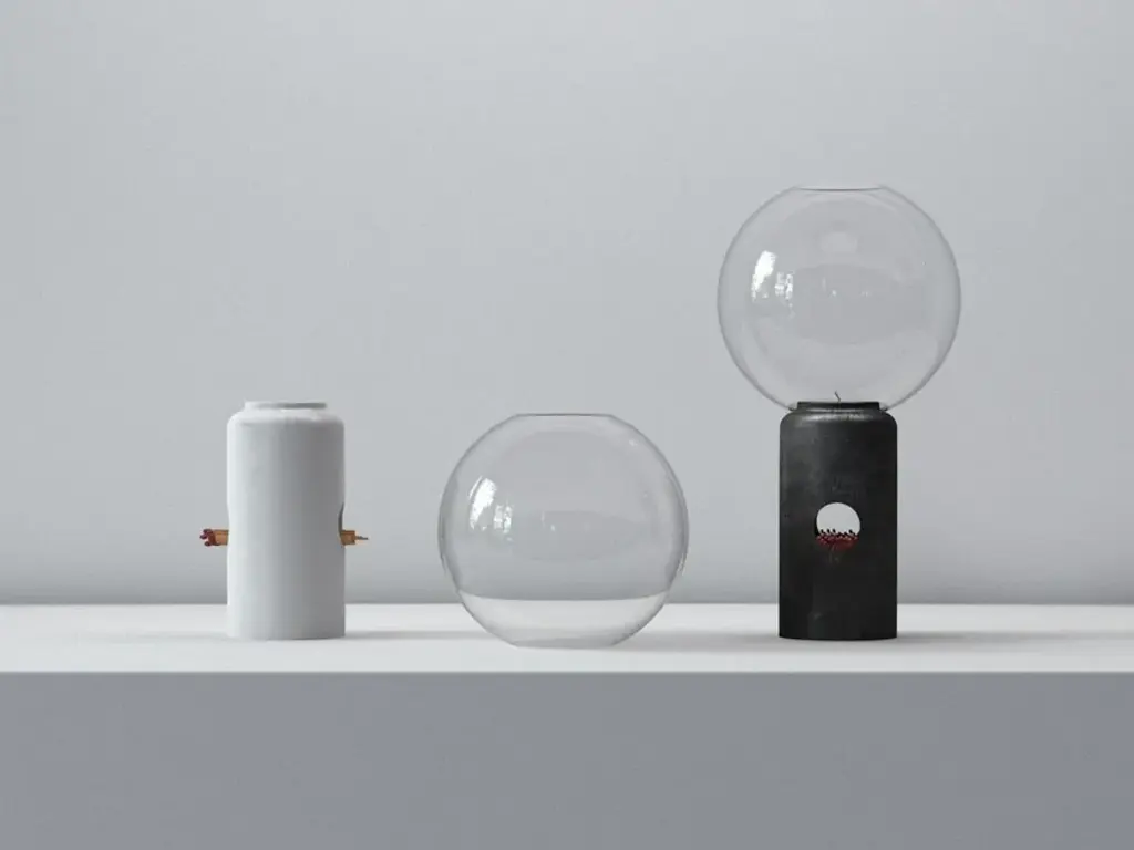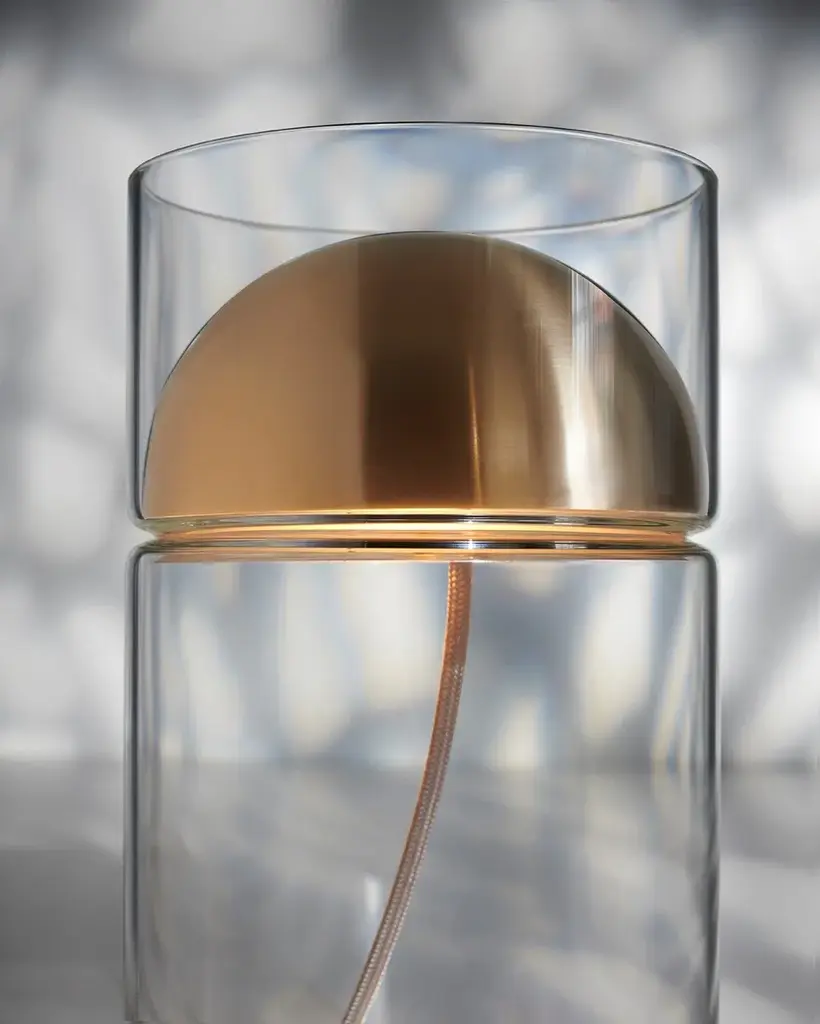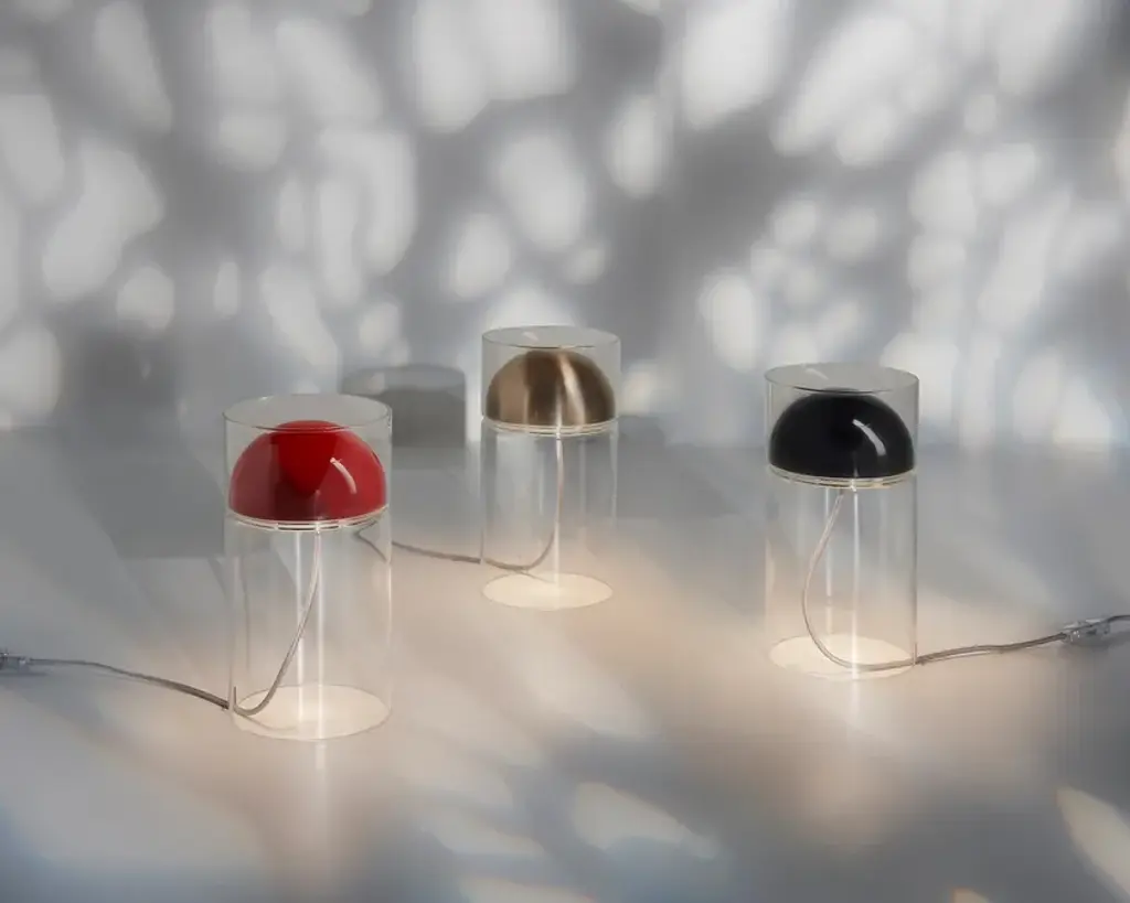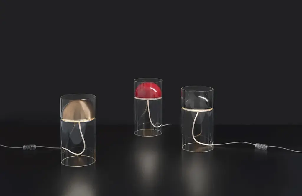 Andrea Quaglio and Manuela Simonelli, professionally Quaglio-Simonelli, who have focused for years on furniture design and other items, have designed Medusa for Oluce, a glass table lamp, created from the elementary principle of incorporating a metal dome into a cylinder. The dome contains the light source and the glass cylinder delicately spreads the light onto the lamp's supporting surface. Medusa reverses the relationship between support and lampshade. The support does not uphold the lampshade but contains it. The dome, which houses the light source, is suspended in the cylinder by an elegant glass fold that allows a formal and refined cleanliness. The electric cable completes the design, descending freely from the centre of the diffuser and appears to sway due to reflections, giving a sense of lightness to the lamp. Formal cleanliness for a soft and warm light. Medusa is available in three colour variants: glossy black, satin gold, and scarlet red.Features1 x 4 W (LED)2700°K500 lmCRI>85Materials: Metal / GlassFinishes: Glossy black - Satin gold - Scarlet red