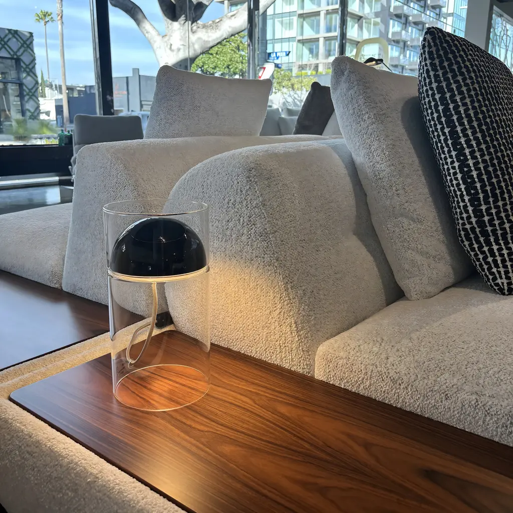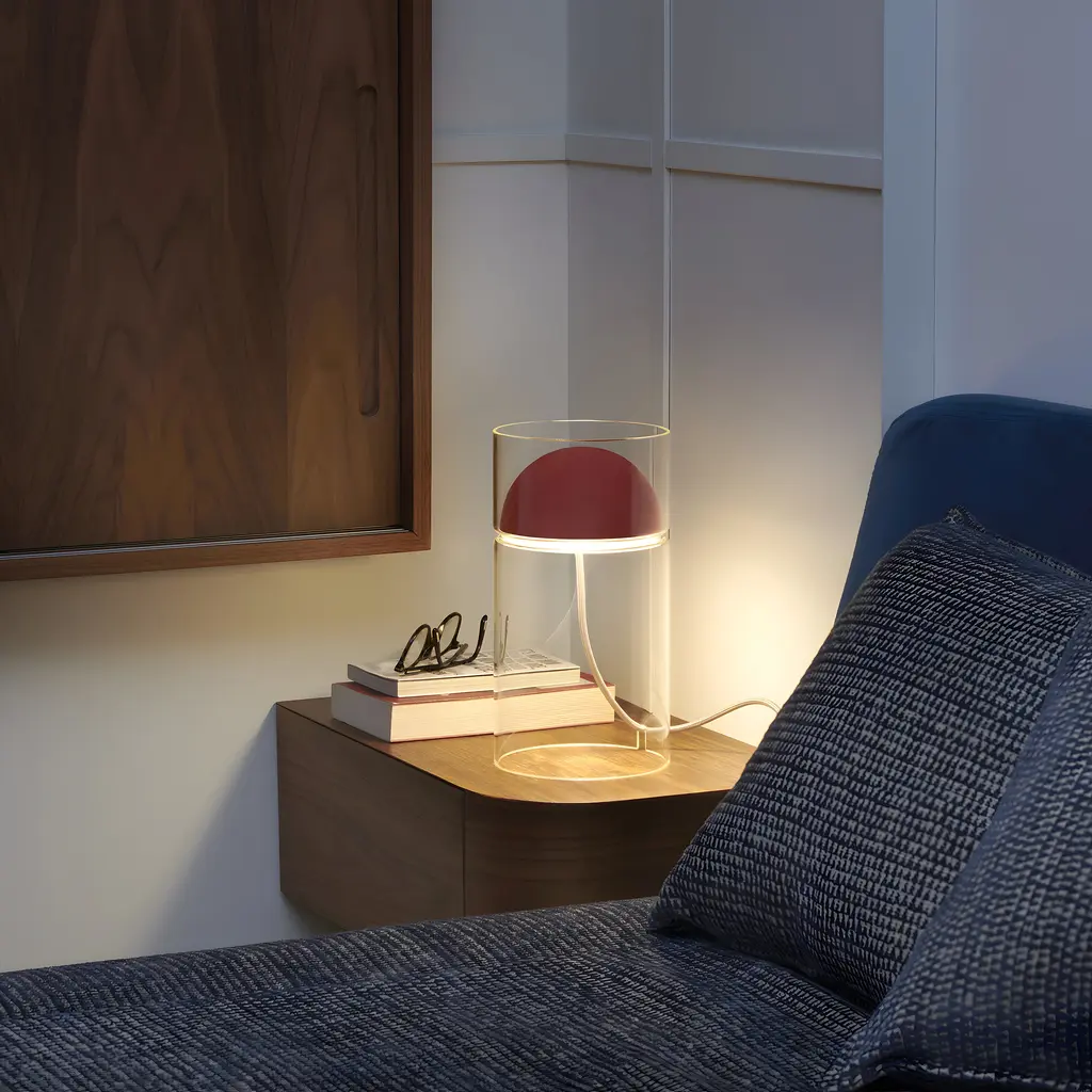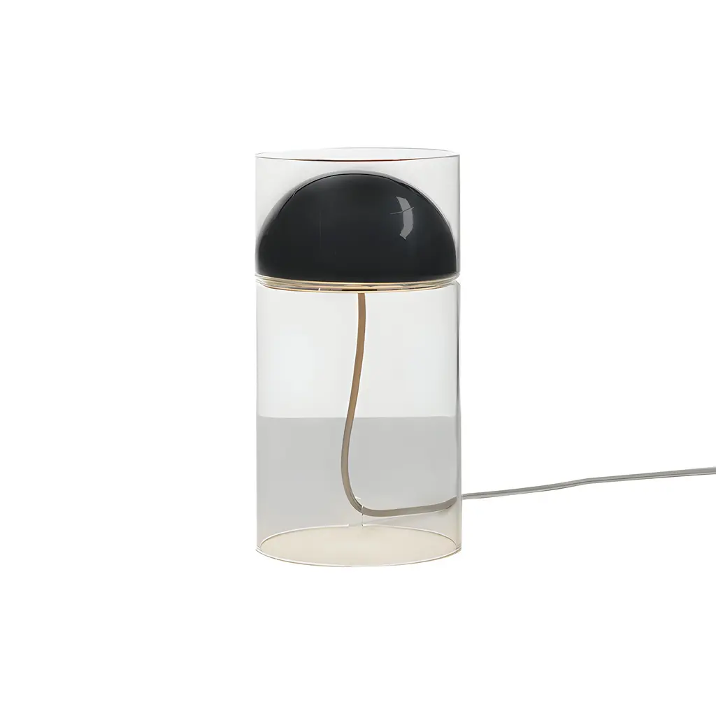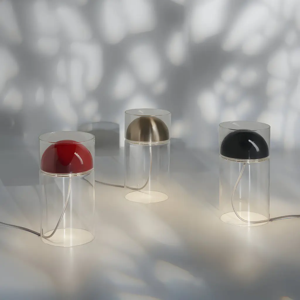 A suspended metal dome housed within a clear glass cylinder defines this table lamp, where the light source is encased rather than supported. The Pyrex glass body diffuses light downward, creating a soft glow across surrounding surfaces. Offered in finishes glossy black, satin gold, and scarlet red.