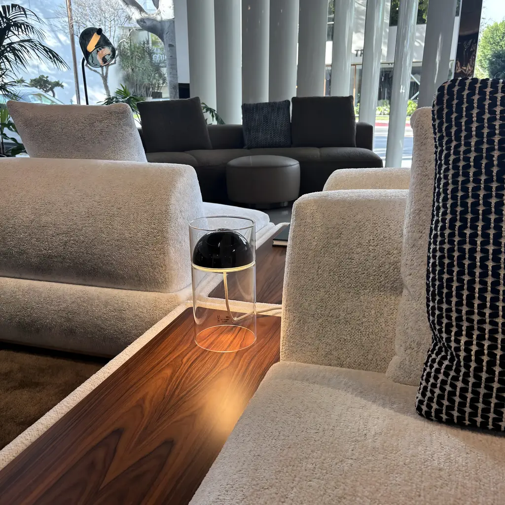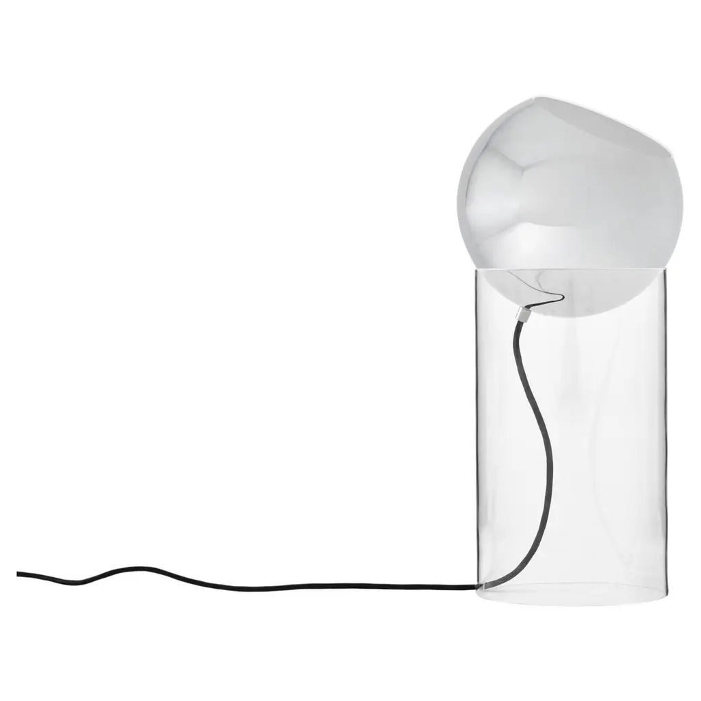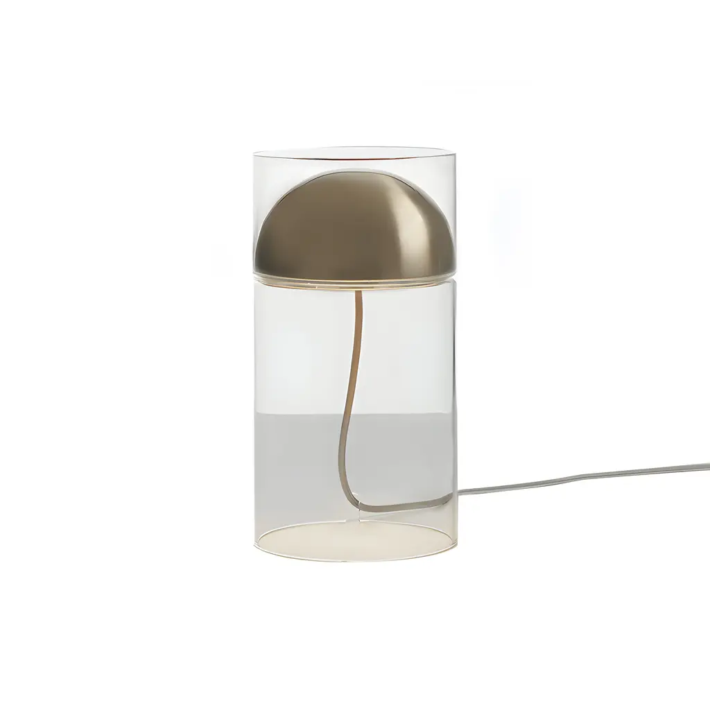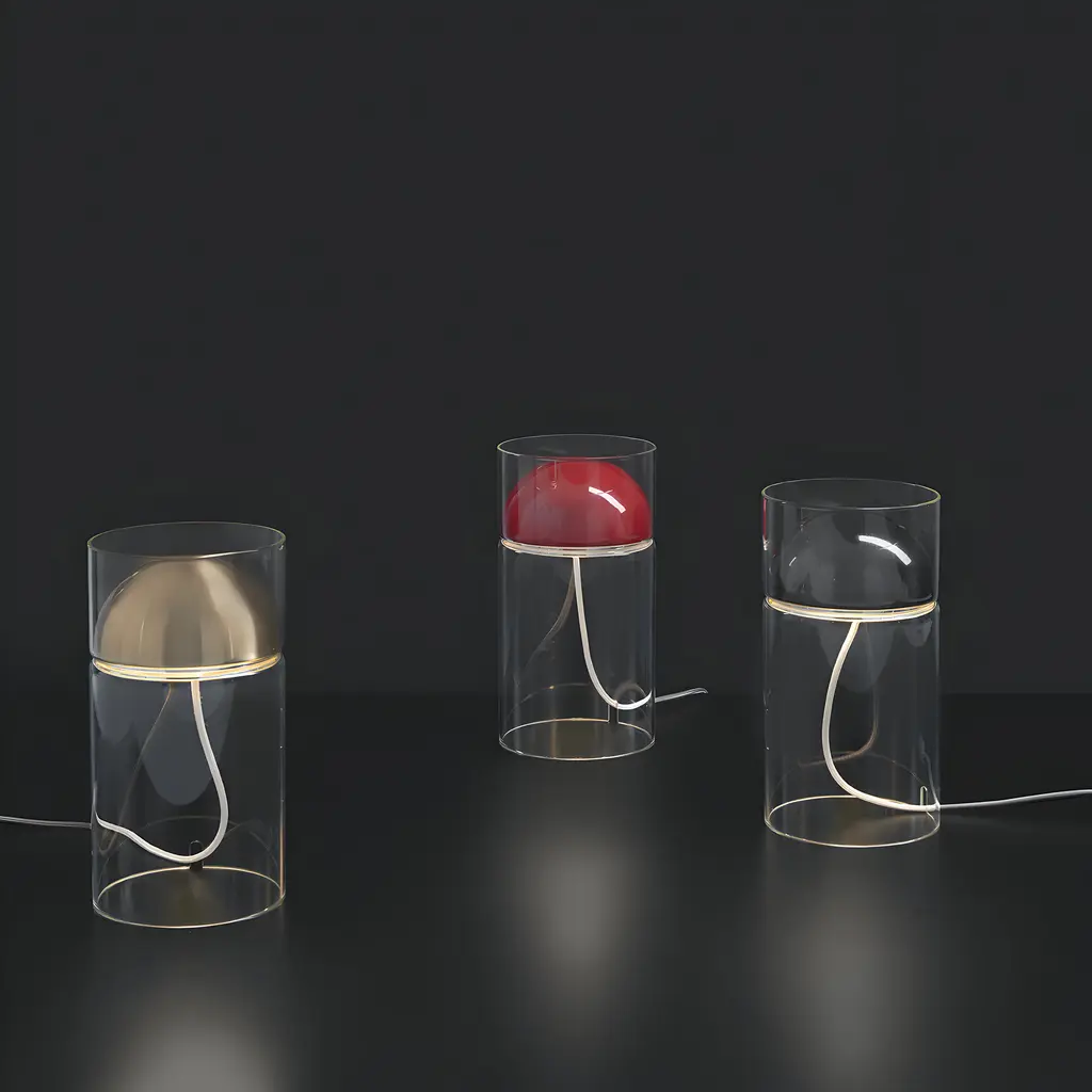 A suspended metal dome housed within a clear glass cylinder defines this table lamp, where the light source is encased rather than supported. The Pyrex glass body diffuses light downward, creating a soft glow across surrounding surfaces. Offered in finishes glossy black, satin gold, and scarlet red.