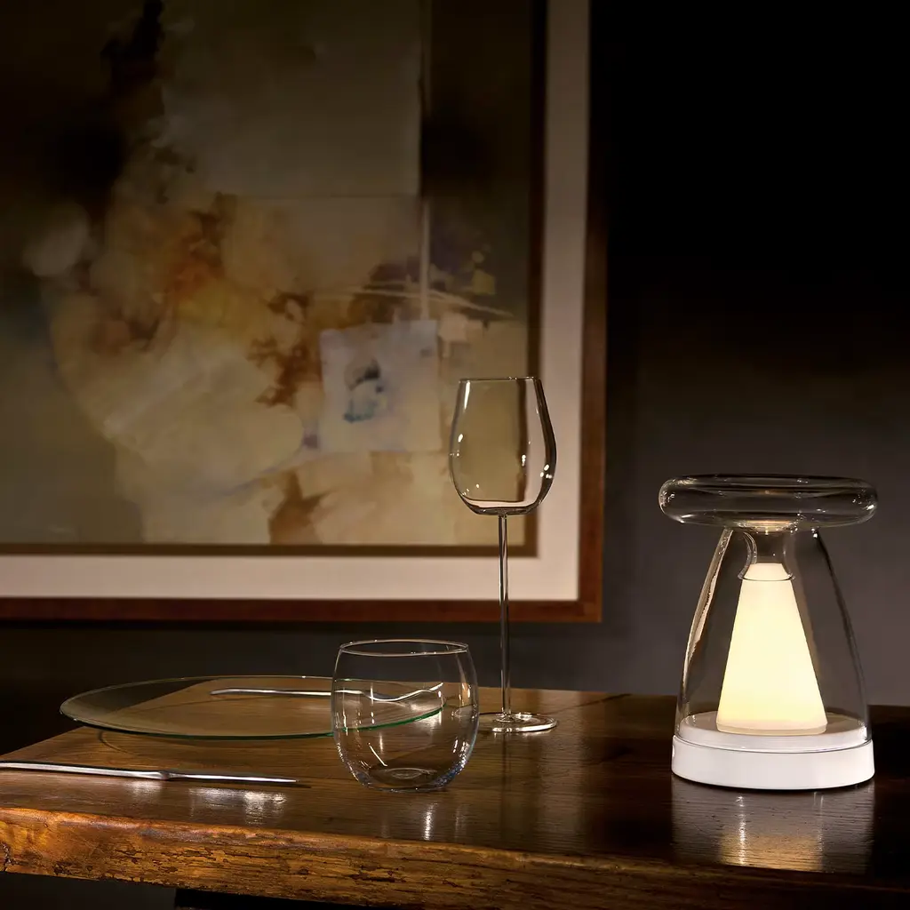 This table lamp combines a minimalist aesthetic with a functional essence. Complete with a rechargeable battery that lasts up to six hours, it will softly and warmly illuminate a romantic table for two. Handcrafted of mouth-blown borosilicate glass and ceramic, it is designed by Sabrina Masala.