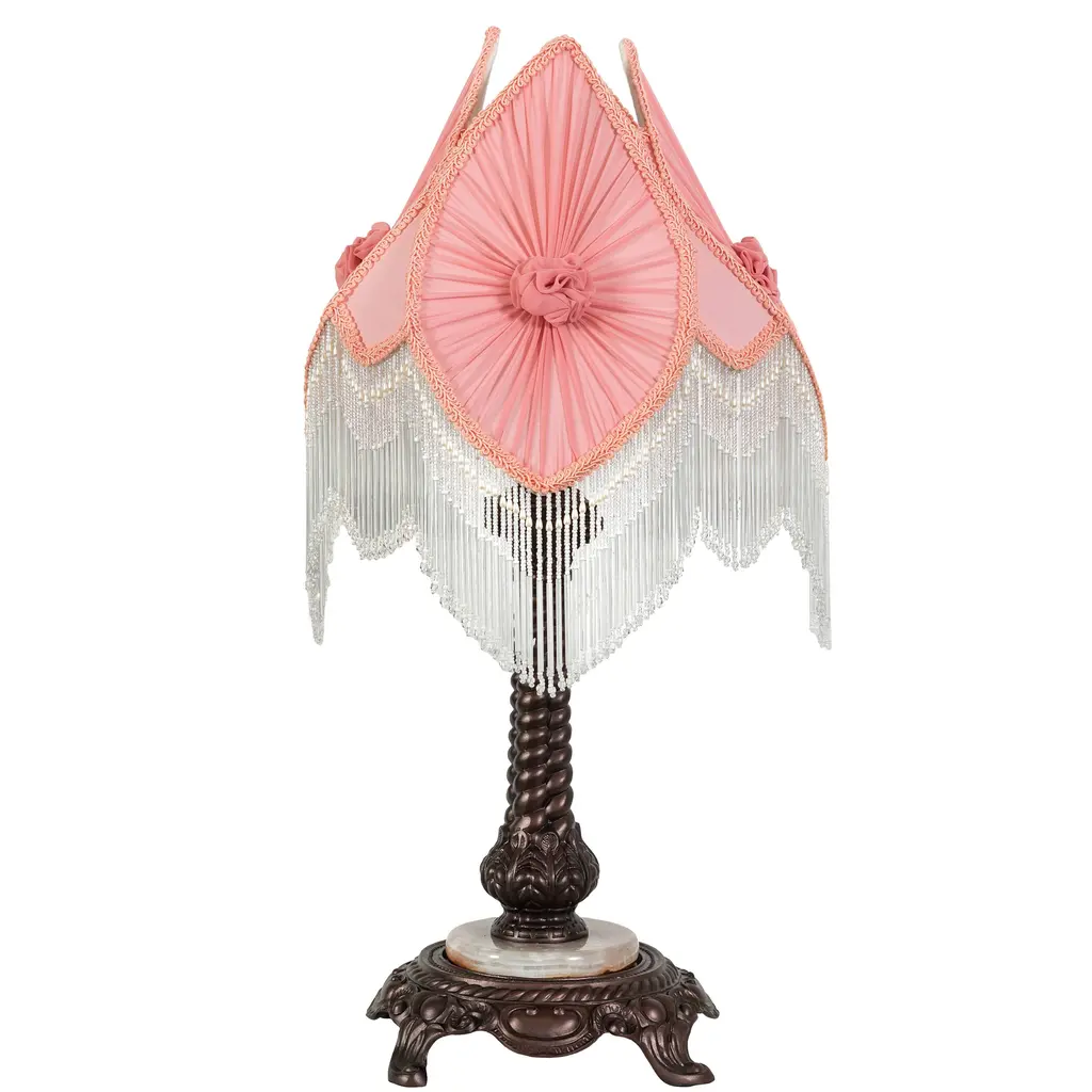 Striking table lamp hand made in the USA, Megan is made with caramel colored blown glass with a unique, envelope shaped shade covered with embroidered silk in shades of gold and peach colors. It has a beaded pull and finial. It has a single bulb socket. LED bulbs recommended. Megan is made with UL parts.