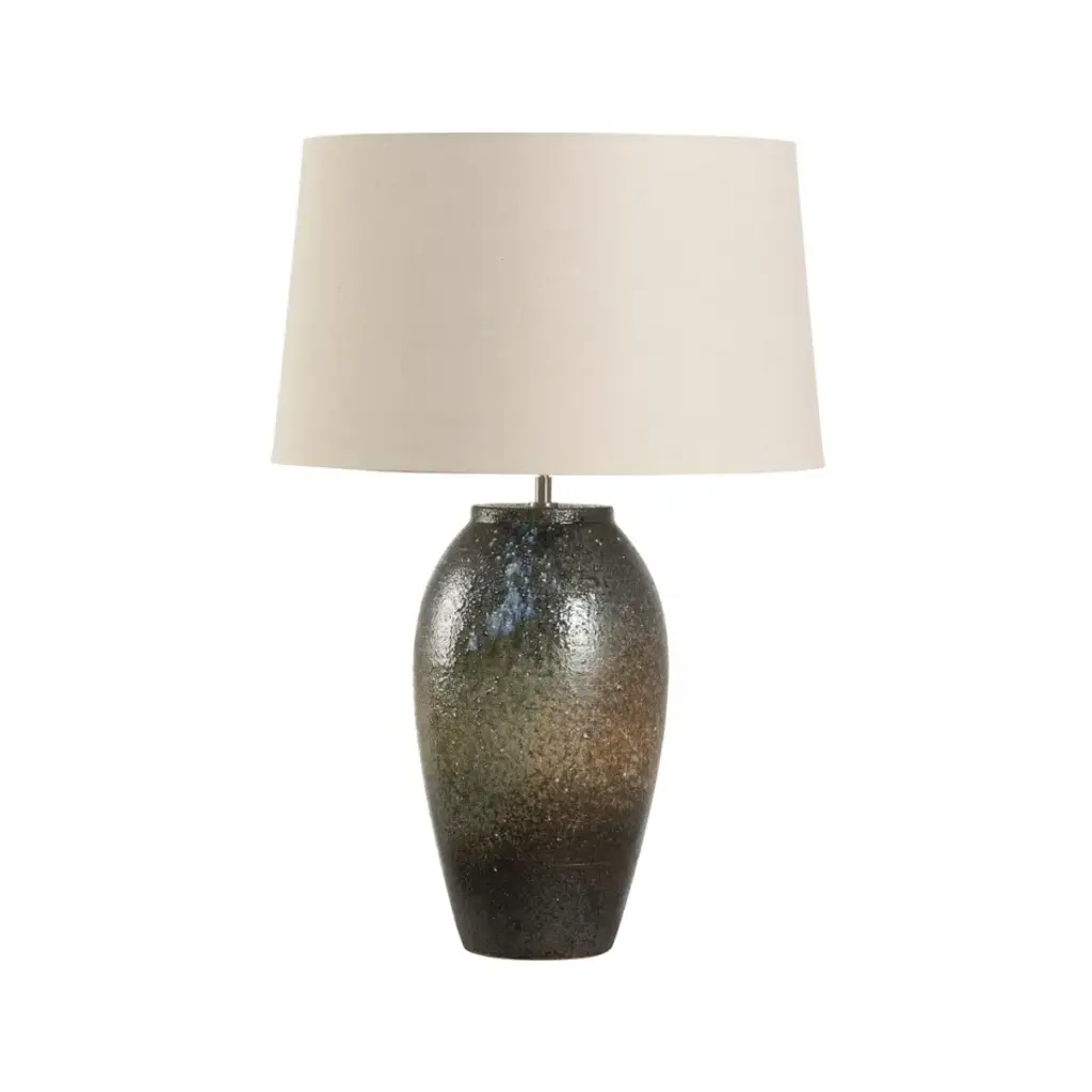 The Megumi Table Lamp, part of the Shiga collection, is hand turned and finished in one of six ancient kilns in Japan. The elements from the soil of Shiga create this earthy toned ombre finish on a classic jar shape lamp completed with cloth wiring and topped with a refined rolled-edge linen shade. Made in Japan.