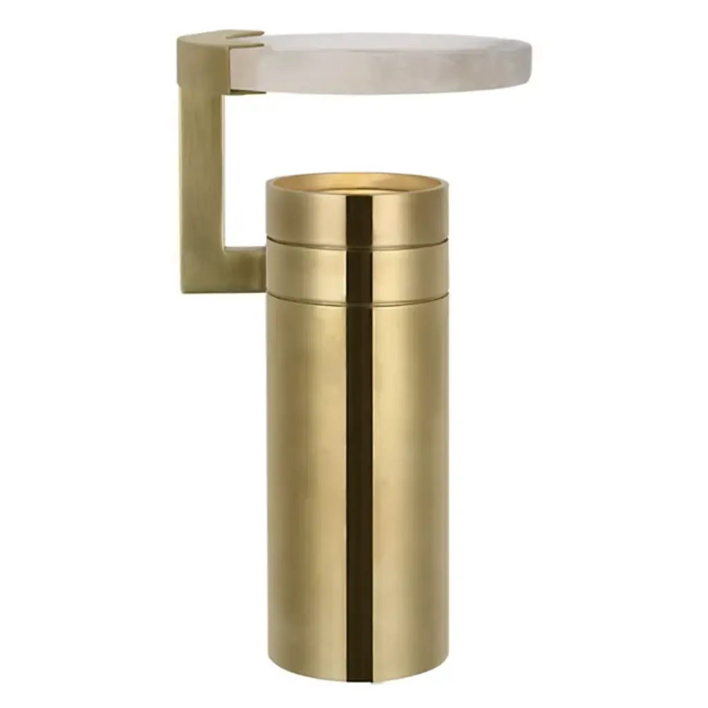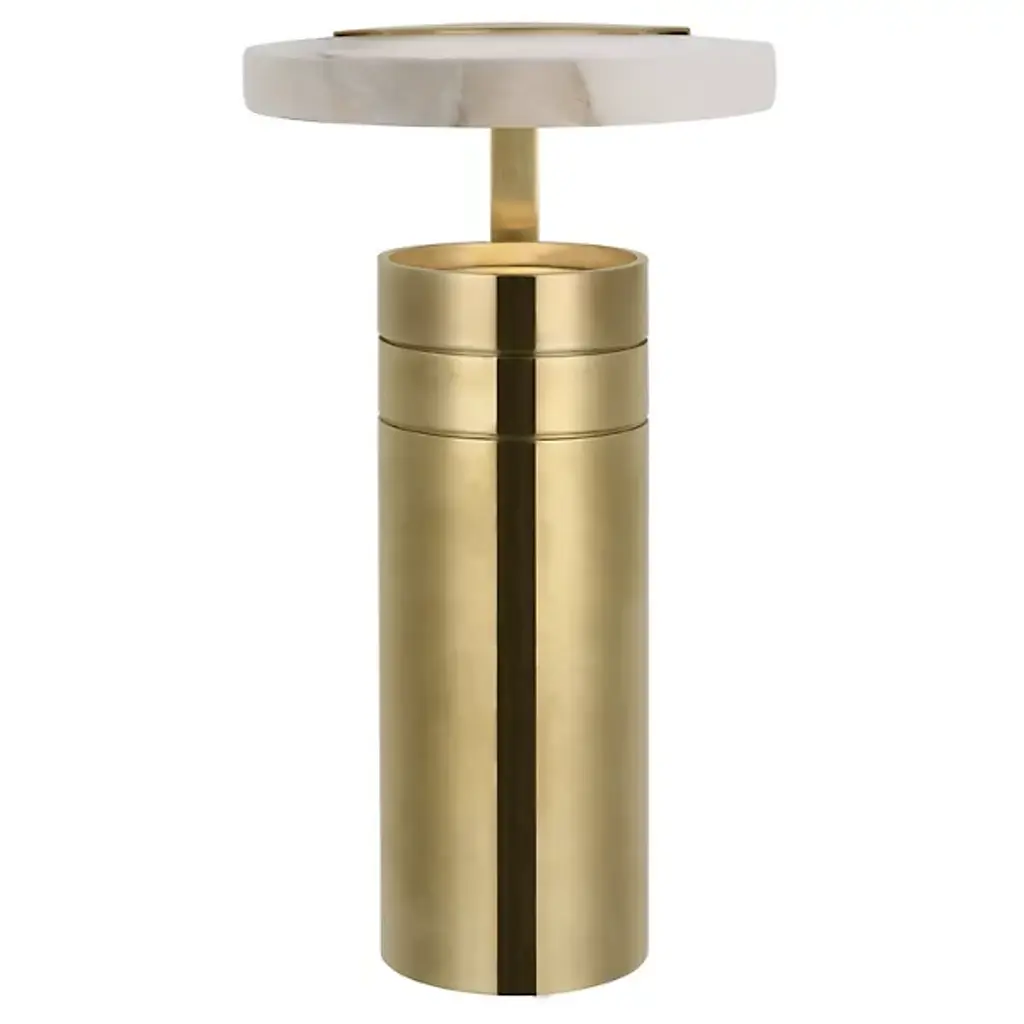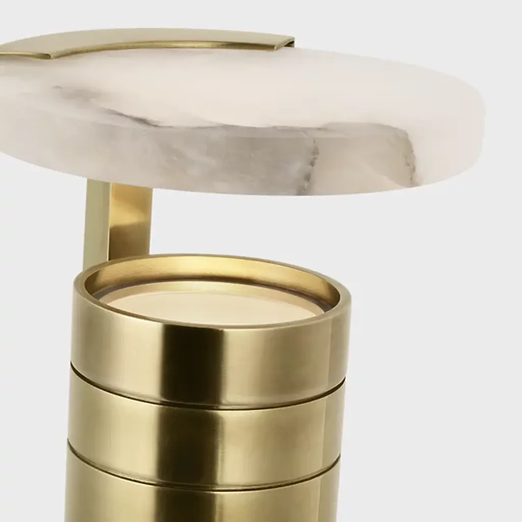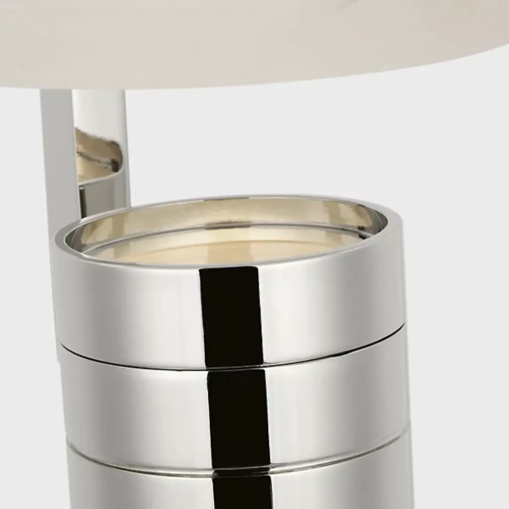 The Melange Rechargeable Floating Disc LED Table Lamp from Visual Comfort Signature presents a study in material contrasts. The cylindrical brass base rises to support an ethereal alabaster disc that appears to float above. Kelly Wearstler's design emphasizes the interplay between solid and void, structure and lightness. The rechargeable feature allows this sculptural piece to move freely through spaces, from outdoor evening gatherings to interior alcoves, creating pools of light wherever needed. The stacked rings at the top of the base add subtle detail while maintaining the lamp's pure geometric form.