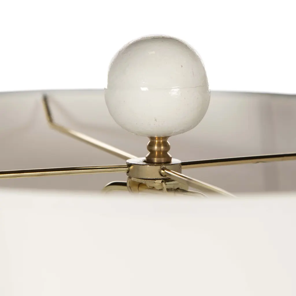 Complement your decor with a prism ball lamp featuring a white ball finial. Eye-catching geometric designs adorn the ceramic base, which is complemented by an empire lampshade made from parchment material.