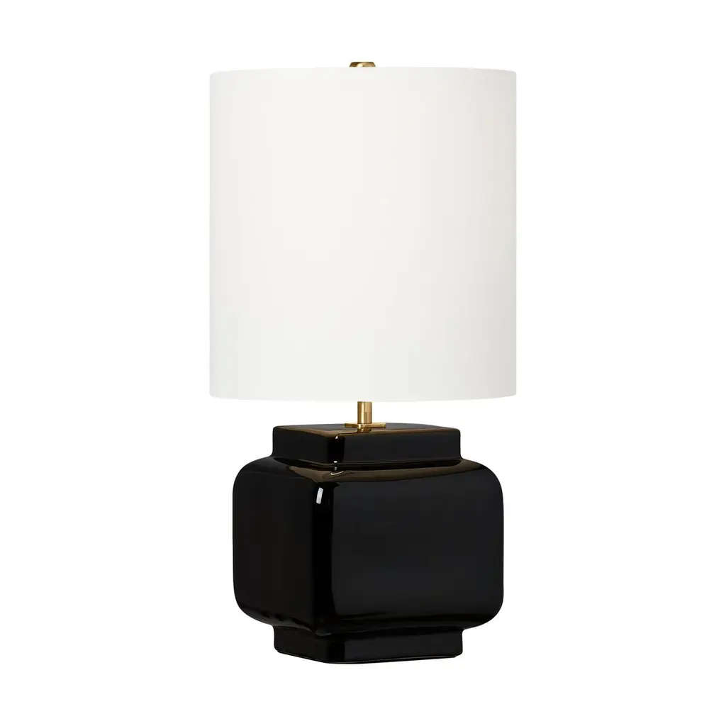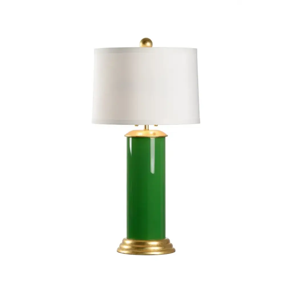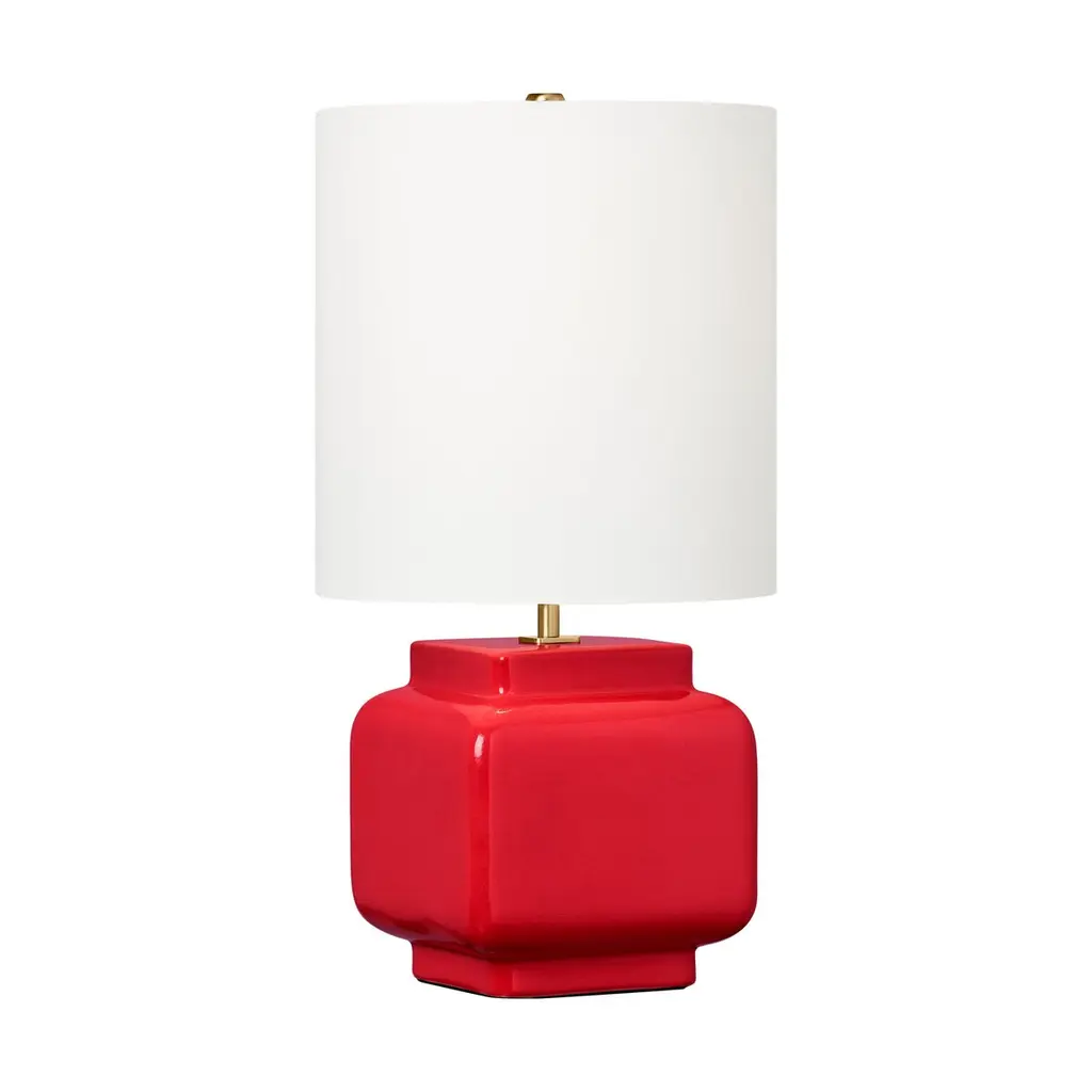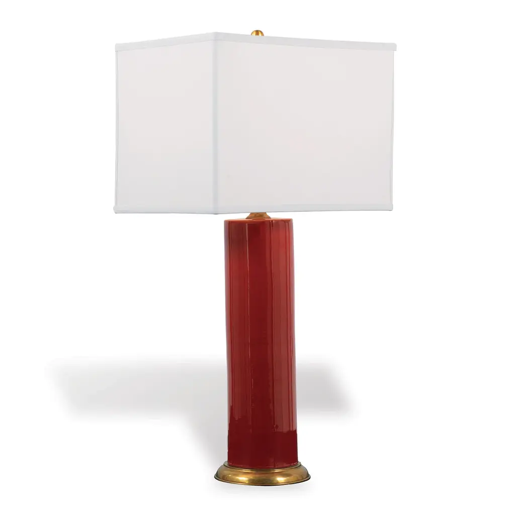 The rich, saturated color of ruby-red is accented with solid brass on this designer porcelain cylinder lamp. An off-white rectangle shade adds crisp contrast. Dimensions: 32"H x 17"W x 11"D 3 way switch. 100 watt max. Shade: (17" x 11") x (17" x 11") x 12"SH. Soft back rectangle shade. Off white polyester fabric. Brass spider. Materials: porcelain, brass Available in emerald green or ruby Ships via UPS Free shipping in the U.S.