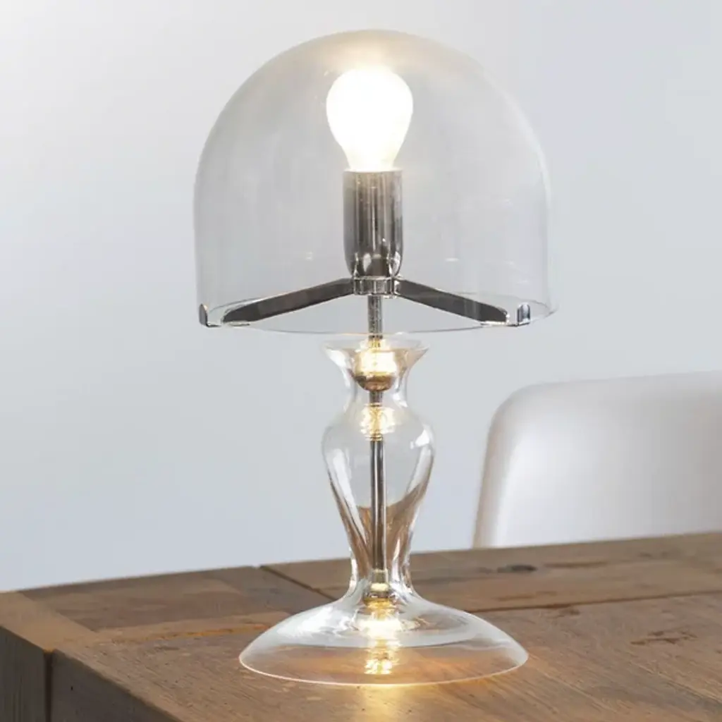 An ephemeral salute to diverse seascapes. The Menegario Table Lamp from Mazzega 1946 offers a bright addition to desks, and side tables, standing out as both a stylish sculpture and a functional piece. This Italian-made fixture was designed to echo the natural form of a jellyfish, rising along a slender rod set inside a clear glass body, seating a single socket beneath a clear dome shade that thrusts up through a triple arm structure below it. The shade blocks the glare from the sides, extending a warm glow out to the sides and scattering a wide pool of reflected downlight below.