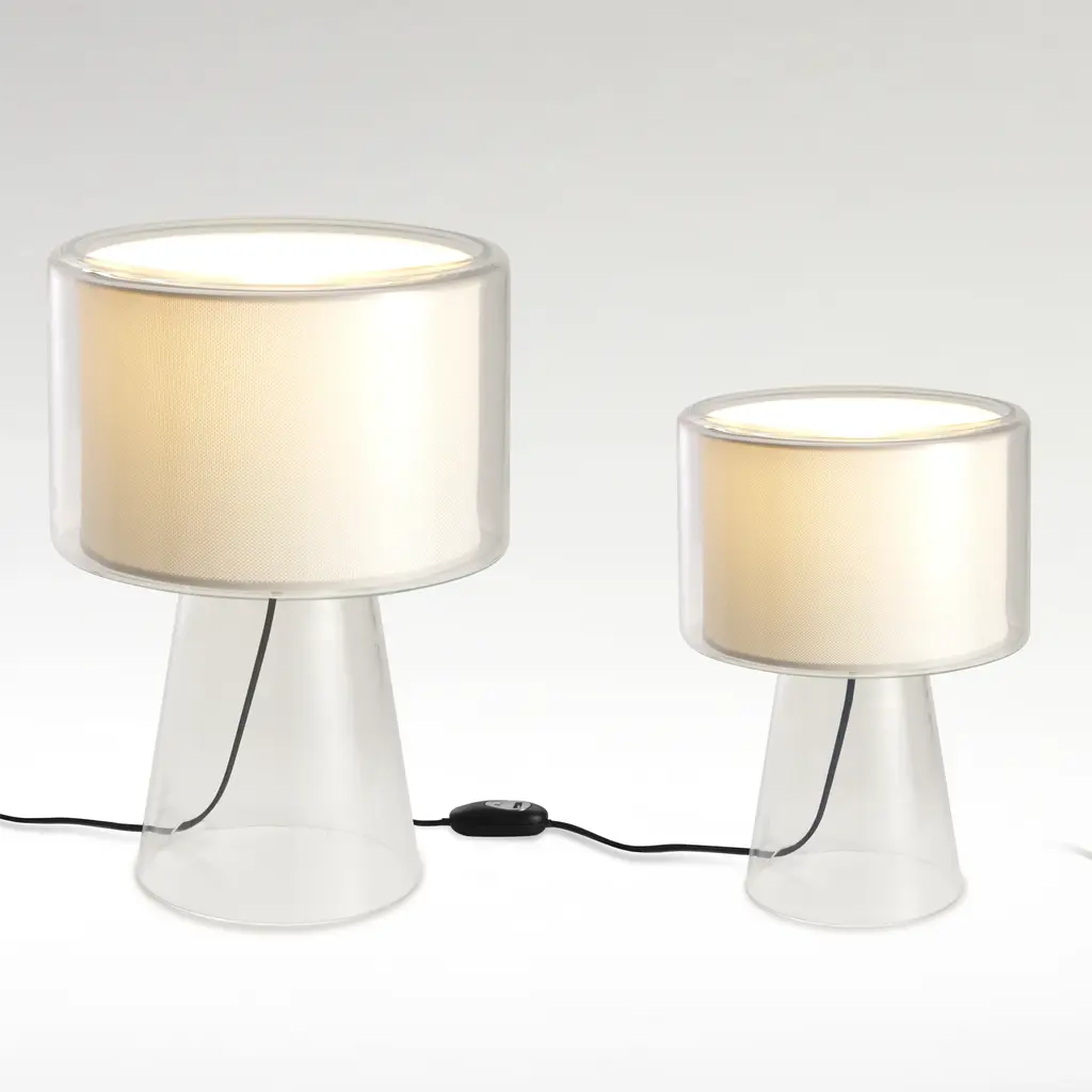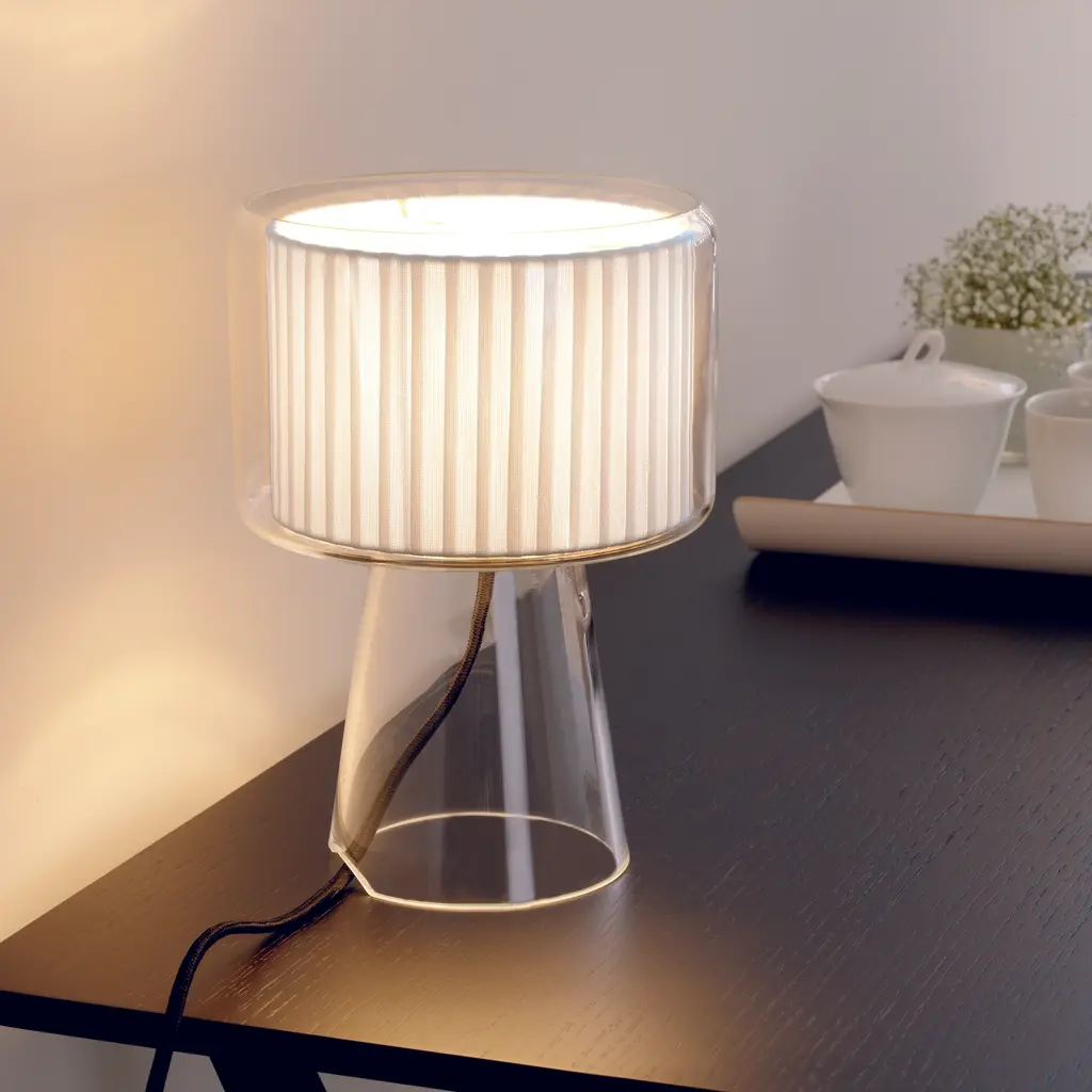 With the Mercer Table Lamp, Barcelona's Marset and designers Javier M. Borrás and Joan Gaspar engage in some imaginative role-reversal. Placing the lamp's shade inside the clear blown-glass structure is a striking turnabout that offers different degrees of illumination according to the pleated shade's coloring. A natural cotton option creates both direct and diffused, all-around light; the pearl white creates a crisper effect while the black shade focuses light just through the top and bottom. Offered in 3 sizes including the Mercer Mini, perfect for a bedside table.