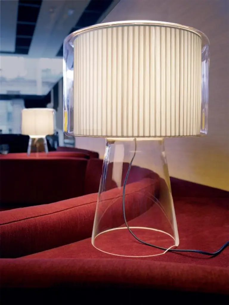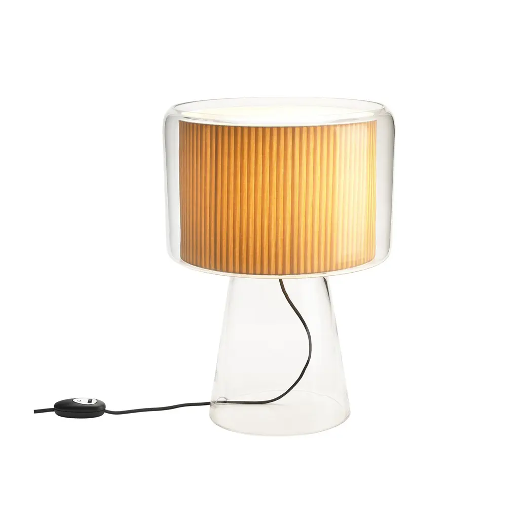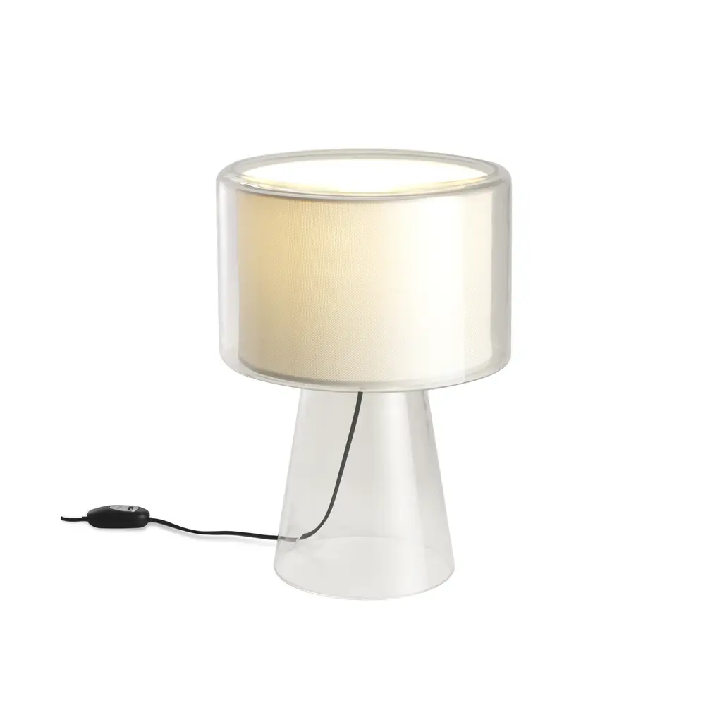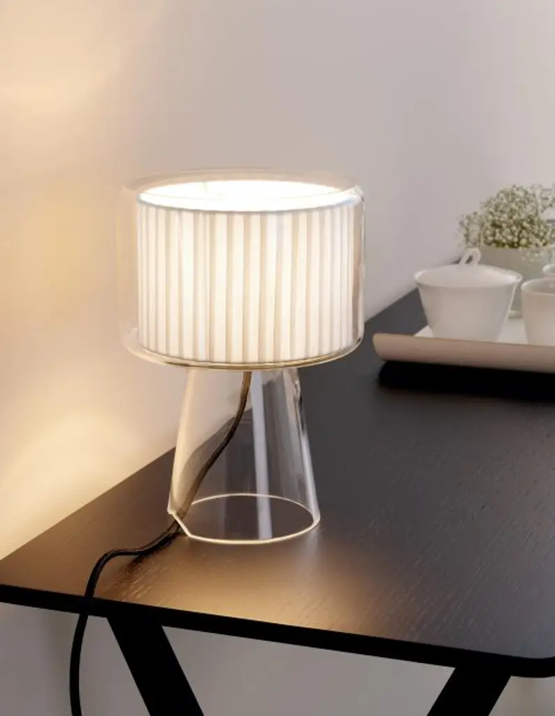 The ethereal Mercer lamp emits a diffused light while it appears to float mid-air. Designed for Marset by Joan Gaspar, the interplay of a traditional lamp shade form suspended in blown glass make this piece distinctive yet versatile in nearly any interior. Available in pearl white or pleated cotton, the modest scale of this lamp adds to its delicacy. A thoughtful reinterpretation of the classic table lamp, the Mercer is a lovely addition to a room.