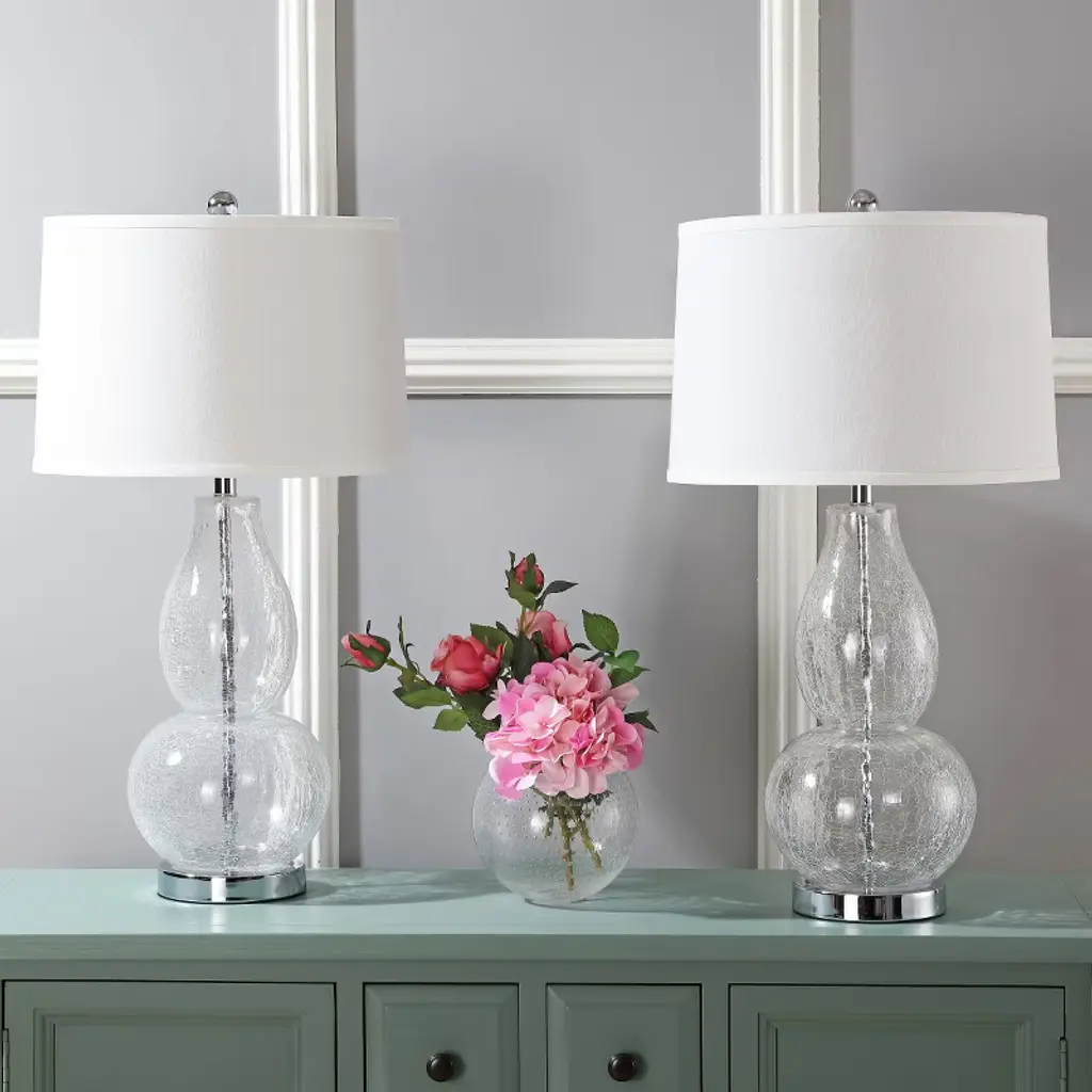 Illuminate your space with the mercurio double gourd table lamps crafted from crackle glass. These lamps add a touch of elegance to any room with their unique design and shimmering glass material. Whether you're looking to enhance your living room or bedroom, their versatile style seamlessly blends with various decor themes. The warm and inviting glow from these lamps creates a cozy atmosphere perfect for relaxation or entertaining guests. Made entirely from glass, their distinct pattern and texture add a sophisticated feel to your home. Transform your surroundings with the timeless charm of the mercurio double gourd table lamps and experience a new level of ambiance and design.