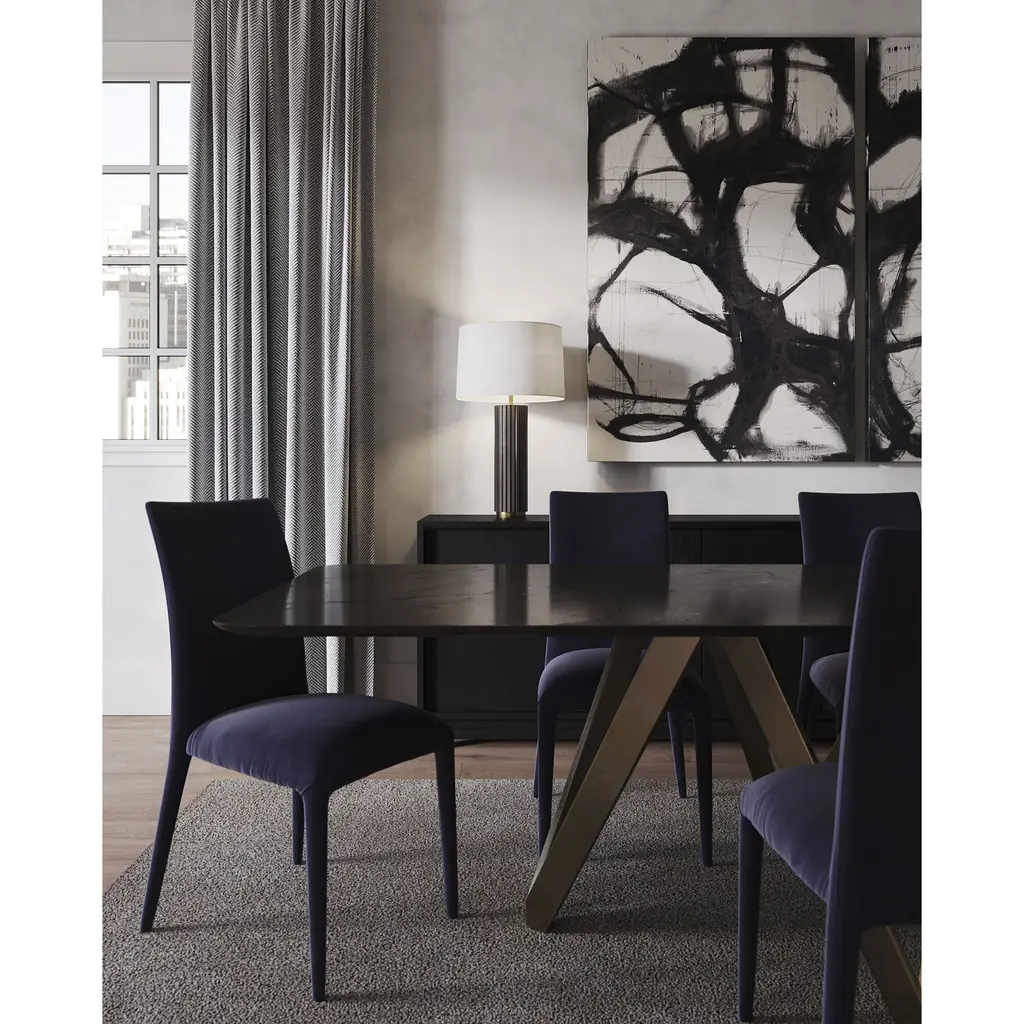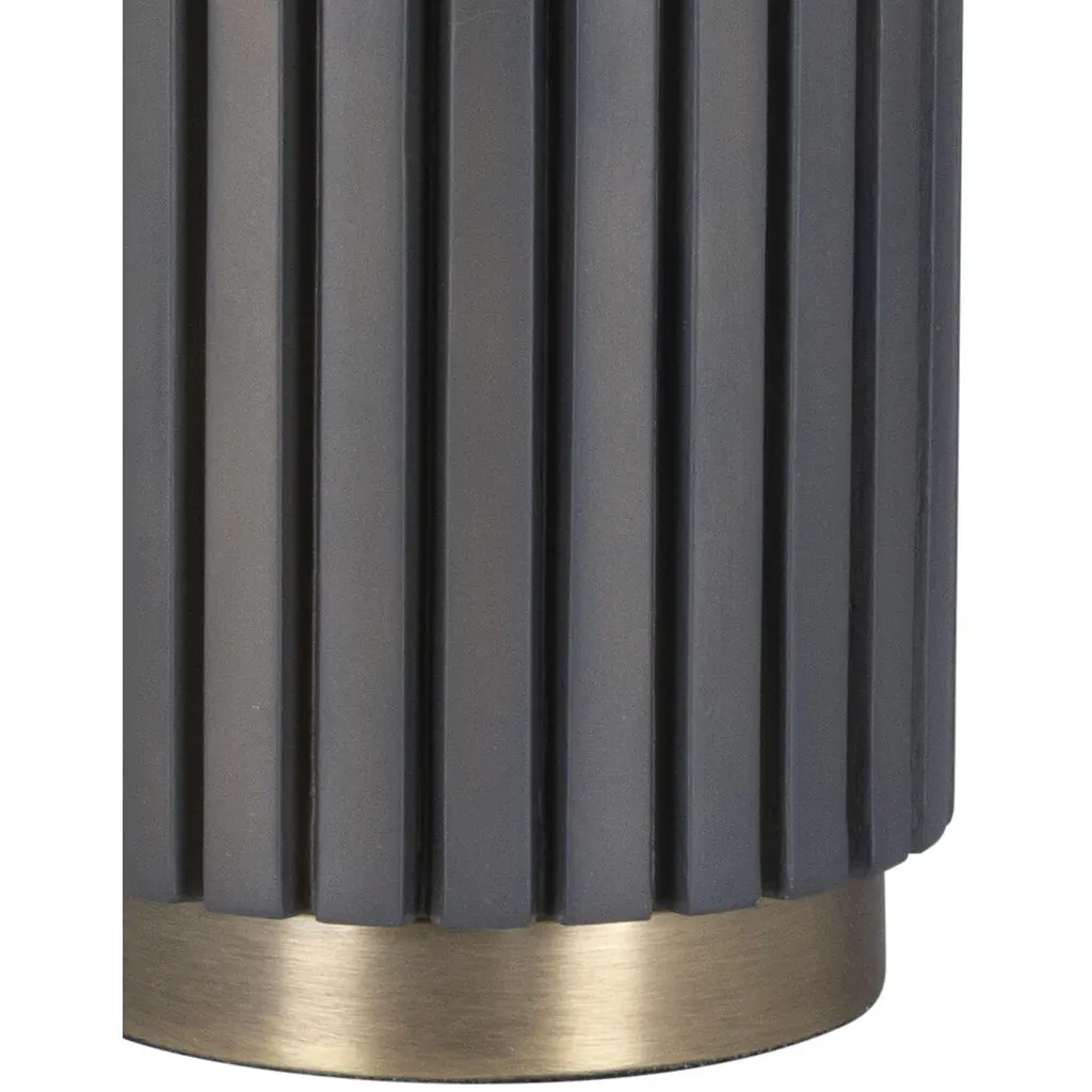 In this table lamp, a Dark Brown finish on the metal body evokes the look of wood slats. An Antique Brass base pops against it and creates a retro vibe, while the Off-White linen shade updates it. Place on either side of a bed for illumination and style. Also available in and off-white matte, black matte and wood finishes.