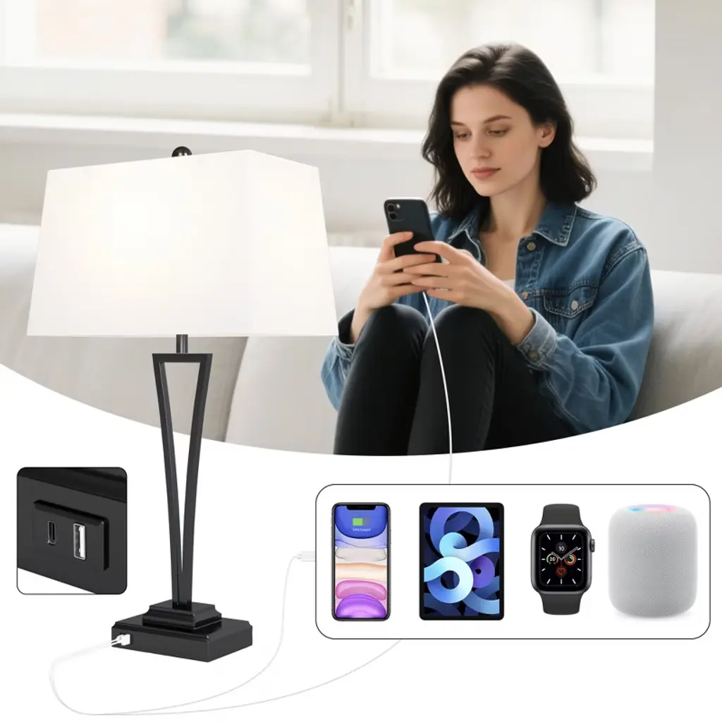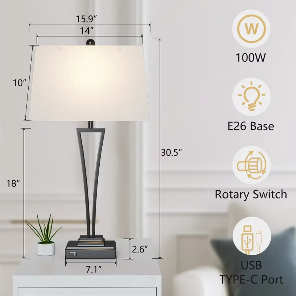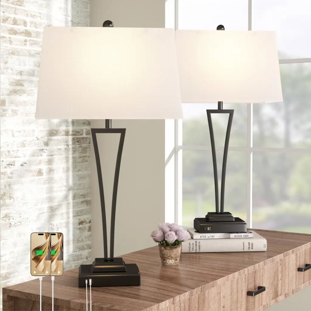 Elevate your home lighting with this set of two 30.5" Metal USB Table Lamps. Featuring a sturdy metal base and a sleek, timeless design, these lamps bring both style and functionality to your living room, bedroom, or office. Each lamp is equipped with a convenient USB port, allowing you to charge your phone, tablet, or other devices while keeping your space neat and organized. The tall profile provides ample illumination, making them perfect for reading, working, or creating a warm, inviting ambiance. Designed for versatility, this matching set complements a variety of décor styles, from modern to traditional.