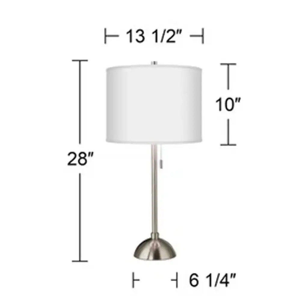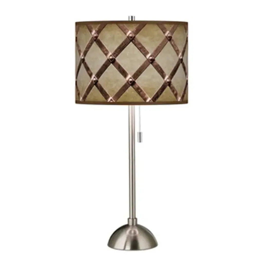 PRODUCT DETAILS: Overall: 28" high. Weighs 5.2 lbs. Shade is 13 1/2" wide x 10" high. Uses one maximum 100 watt bulb (not included). On-off pull chain switch. Brushed nickel finish table lamp. Custom-made Metal Weave giclee shade. Translucent drum shade design. DESCRIPTION: This contemporary table lamp features a stylish, custom giclee art shade. The stylish Metal Weave pattern is complemented by a smart-looking brushed nickel finish base.