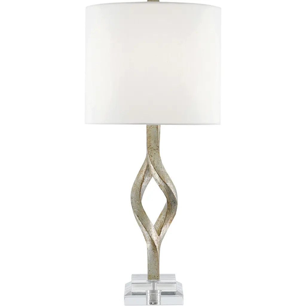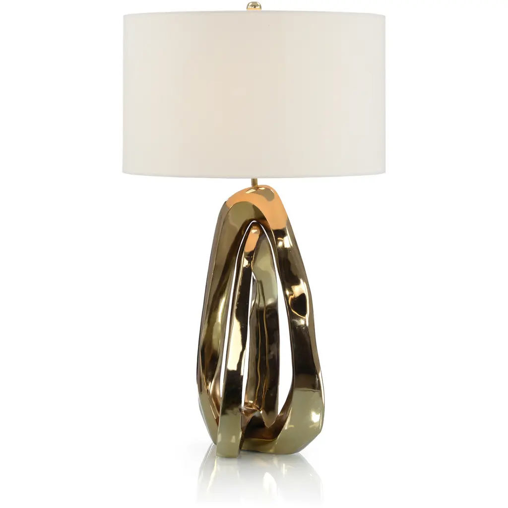 The Metallic Ice Table Lamp is a gorgeous design statement that masterfully blends tone and texture. Crafted from Polished Brass, the lamp showcases an abstract loop with organic curvature. The piece displays a clear crystal embellishment on one side, matched by the base. The look is completed by a metal finial that complements the body, as well as a large white drum shade.