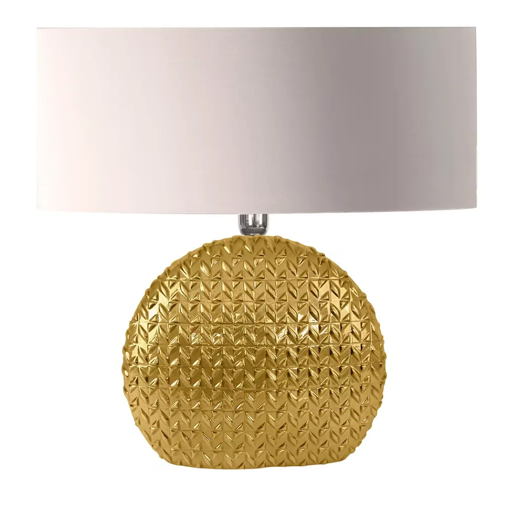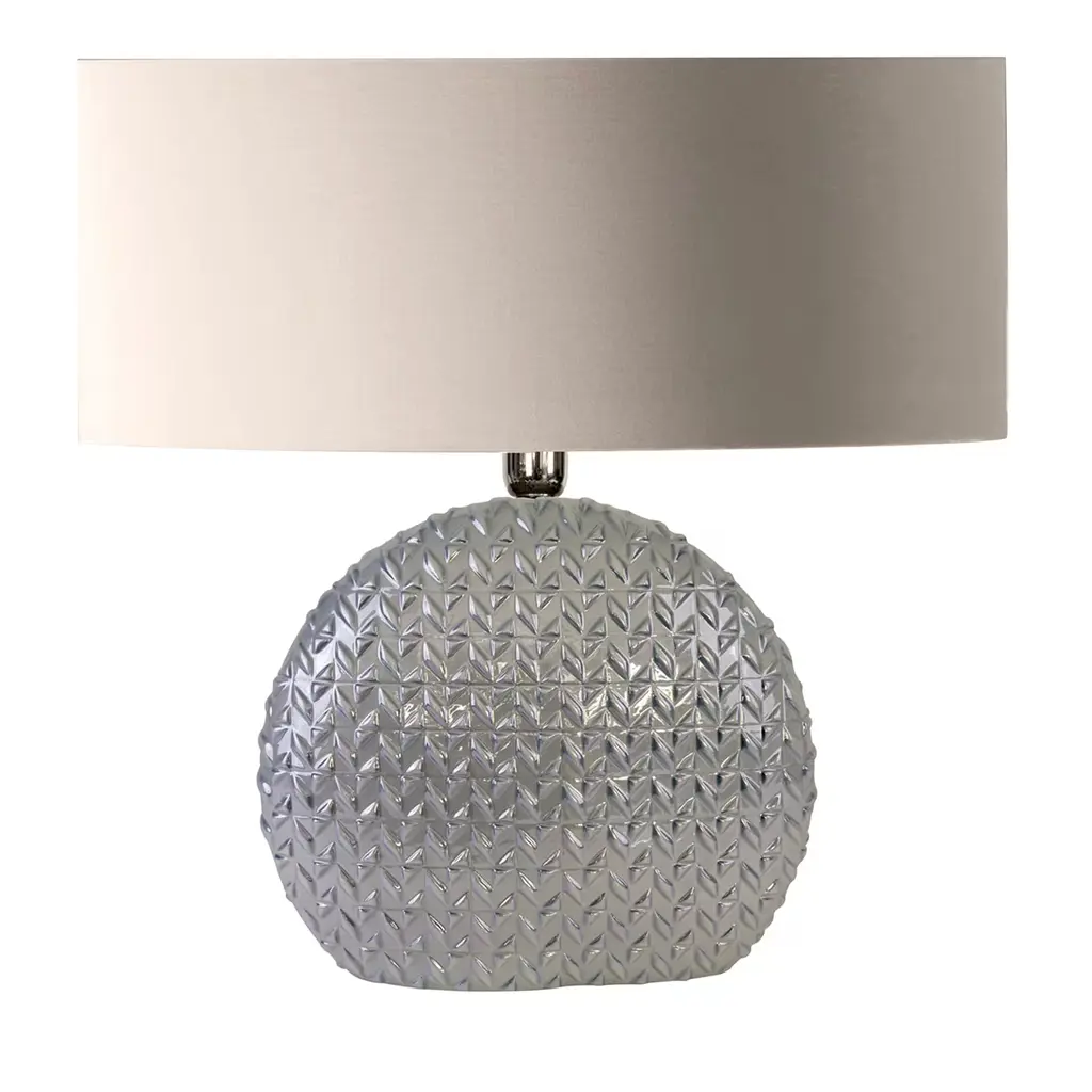 A palette that reminds of bright skies softly veiled by fluffy clouds lends this table lamp its fresh allure. A large lampshade crafted of white fabric filters the light radiating from within, whose flow also accents the raised geometric-style detailing accenting the bulging body crafted of fine porcelain and painted in a sparkling hue of light blue. Other colors are available, please ask the Concierge for options.