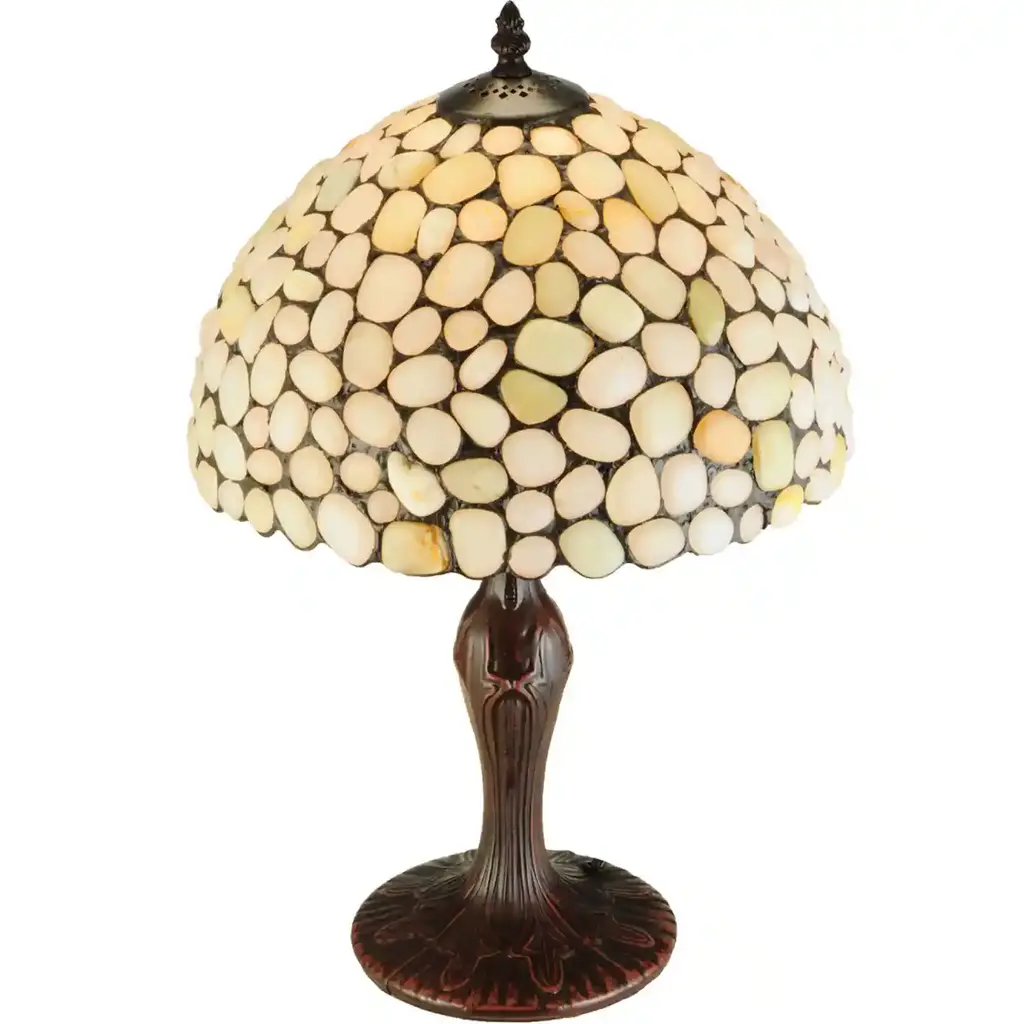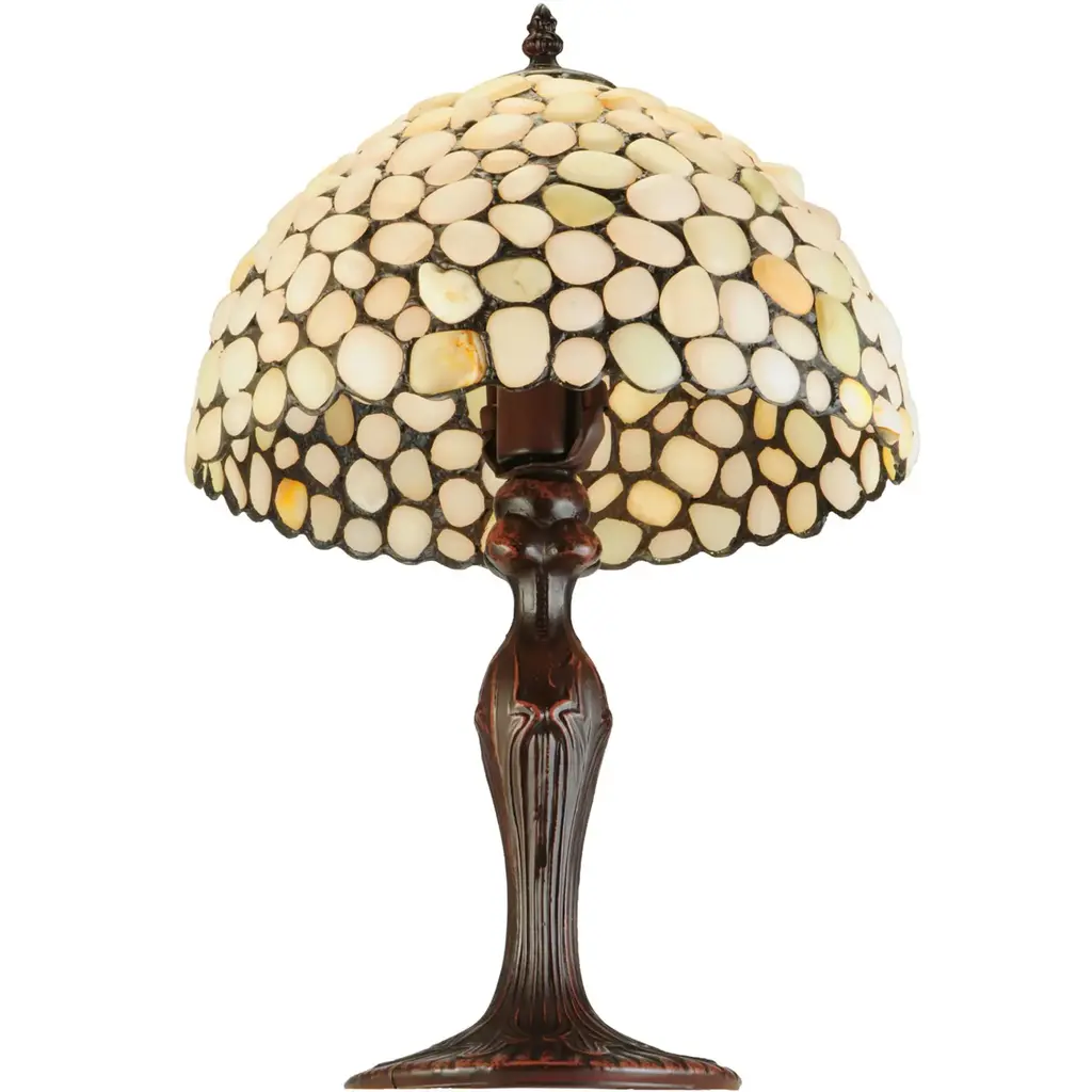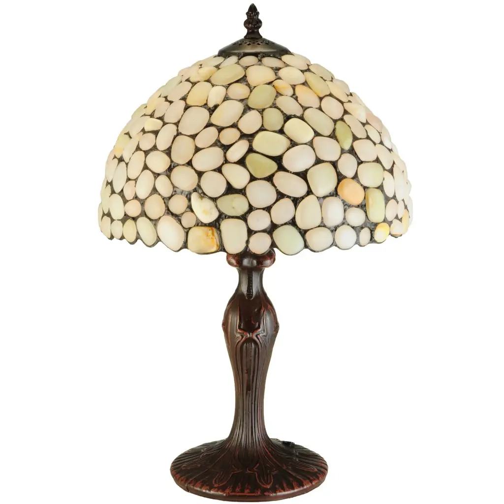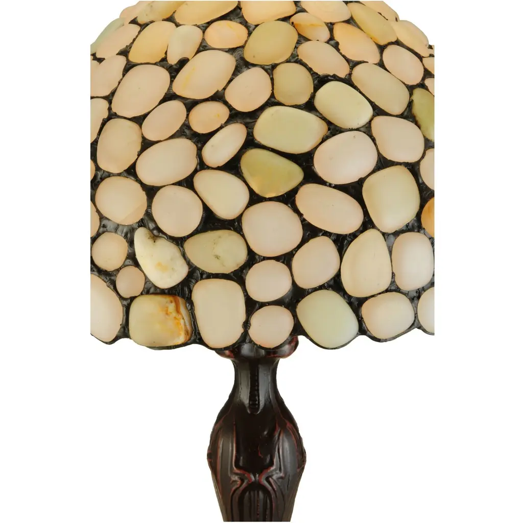 Utilizing natural stones as a medium to create new lighting designs, Agate rocks in Sun Bleached Bone, White Opal, Light Yellow/Green and Ecru colors are crafted into lamp shades using Tiffany's famous copper foil construction process.?The natural stones are renowned by some for their balanced Yin/Yang energy, courage, protection, healing and calming. This unique shade, featuring the extraordinary texture and styling of opalesque quartz, is complemented with a decorative base finished in a handsome Mahogany Bronze.Features:Dimensions:Electrical Specifications: