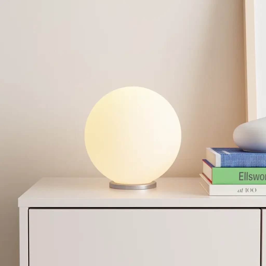 Ponder your orb. This table lamp features a nearly spherical opal glass shade perched on a circular base in a metallic finish, for a minimal silhouette that evokes a crystal ball. Add a standard 60W bulb for enough light to read by, or use a colorful bulb for a more mystical glow.