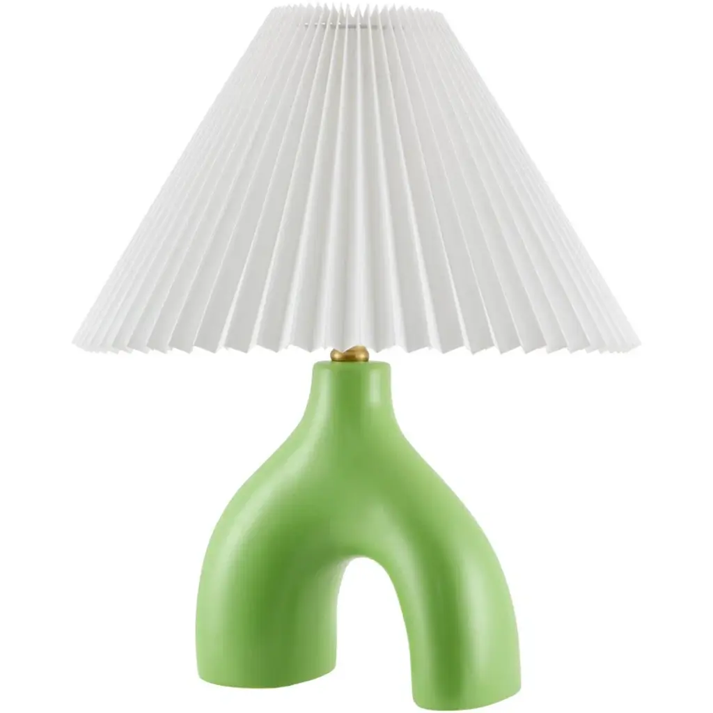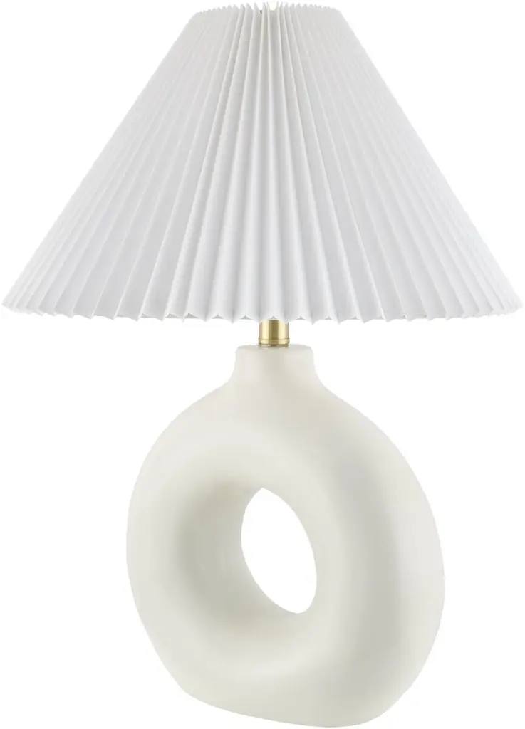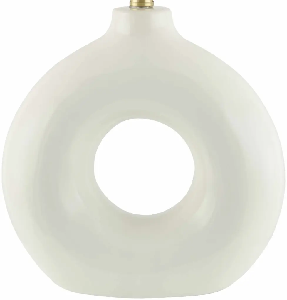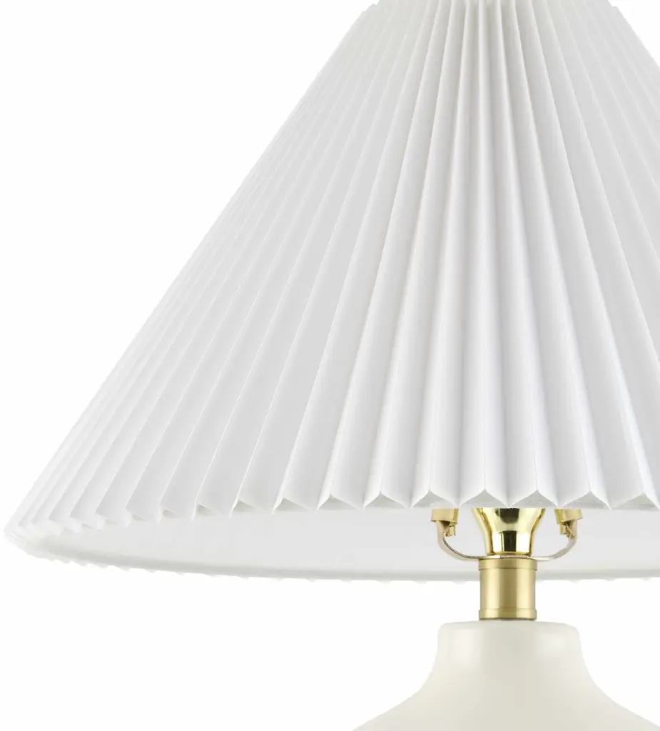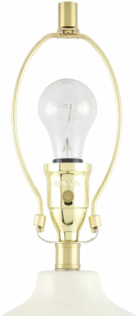 Collection: Miasskoye Colors: White, Metallic - Brass, Translucent Material: Body: Ceramic / Shade (Outside): Polyester / Shade (Inside): Polyester / Finial: Iron Styles: Traditional Made In: China Lighting Type: Accent Table Lighting Shade Material: Polyester Shade Color: White Cord Length: 6' Switch Type: Rotary Number of Bulbs: 1 Socket Type: E-26 Bulb Wattage: 100W