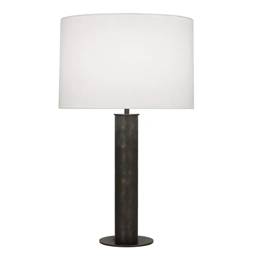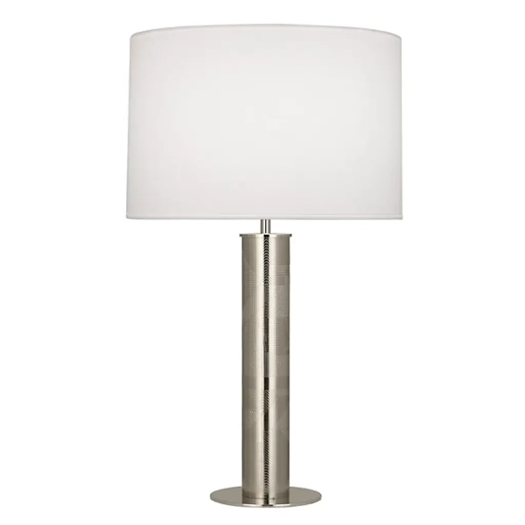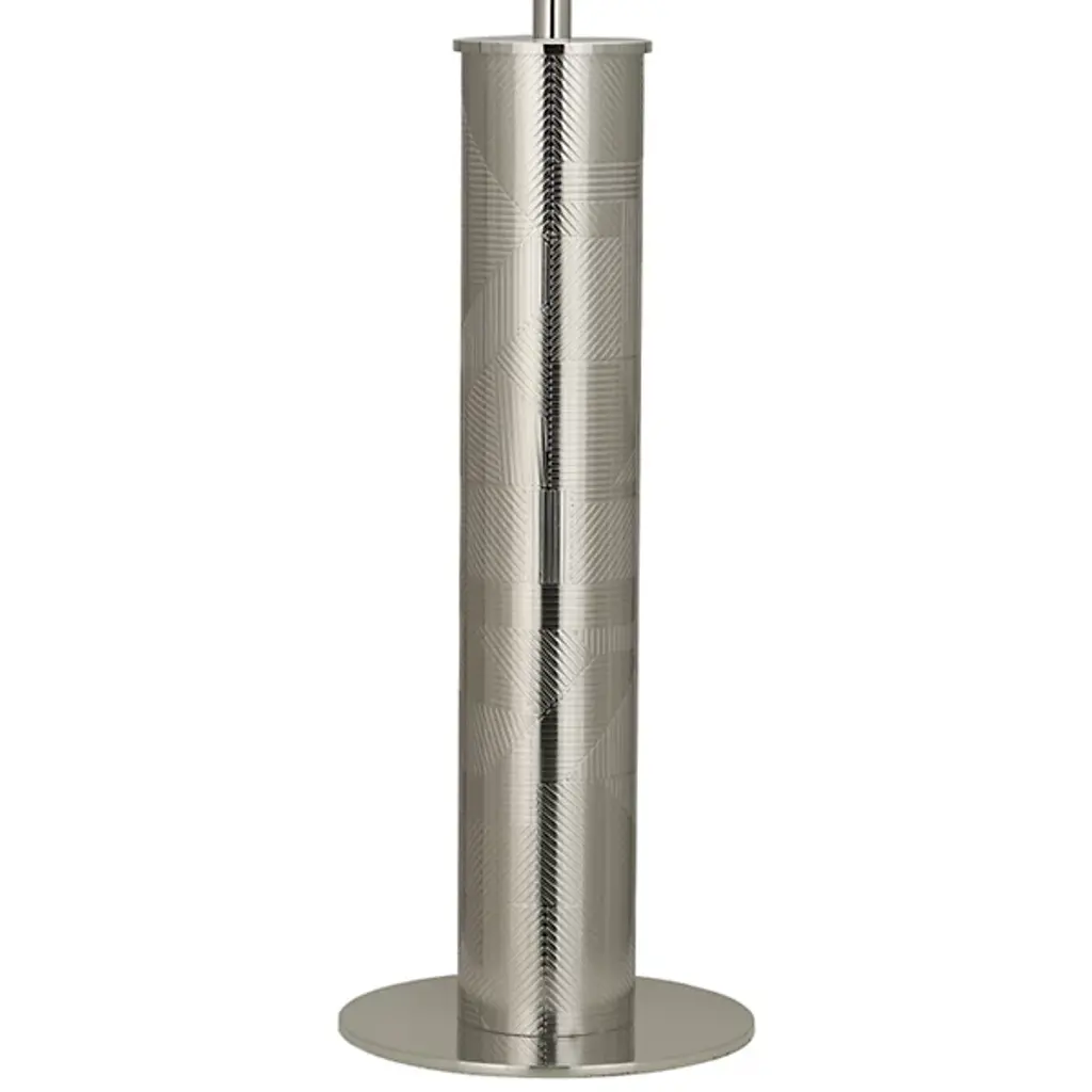 Bring a touch of elegance to your home with the Michael Berman Brut Table Lamp from Robert Abbey. A sleek example of the inherent allure in modern lighting design, this piece elevates the décor of the space with a simple, yet expressive silhouette. The cylindrical metal body contains subtle and intricate etchings that add to the appeal while the ascot white fabric shade beautifully contrasts as it rests on top. The bulb within the shade sends out a bright and welcoming layer of light, perfect for tableside while watching TV or other activities.