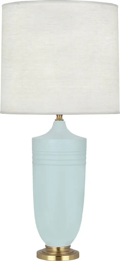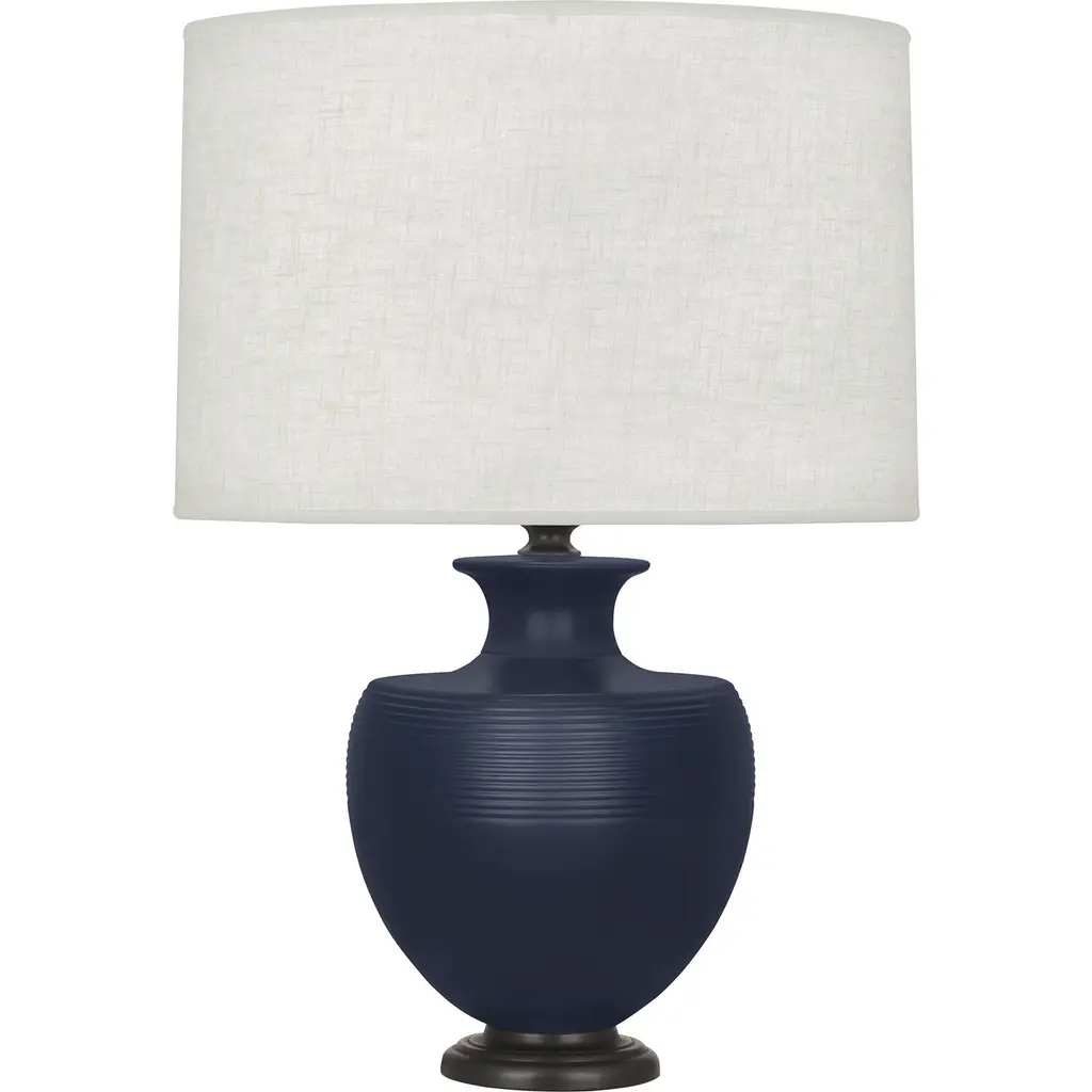 Matte Midnight Blue Ceramic With Modern Brass Accents, Oyster Linen ShadeBulb Type: ANumber of Bulbs:1Bulbs Included: NUL Listed: YesBulb Wattage: 1Hardwire or Plug: Plug In